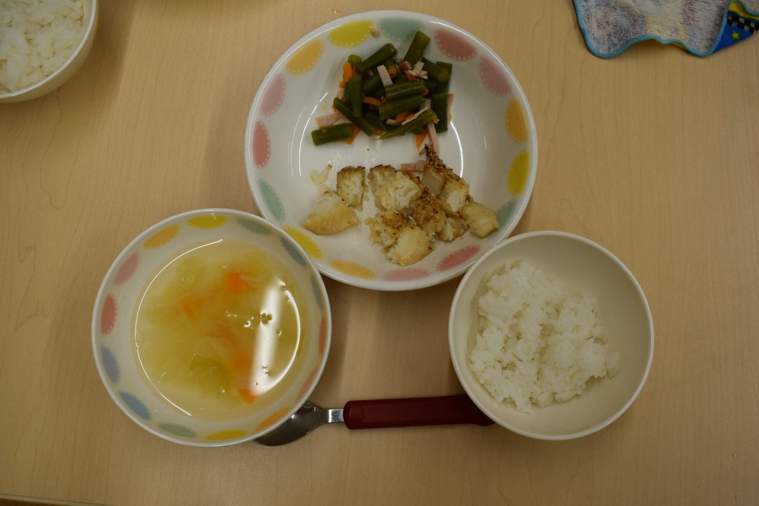 今日の給食は『カレイのゴマ焼き』と『インゲンと人参のサラダ』と『コンソメスープ』でした。