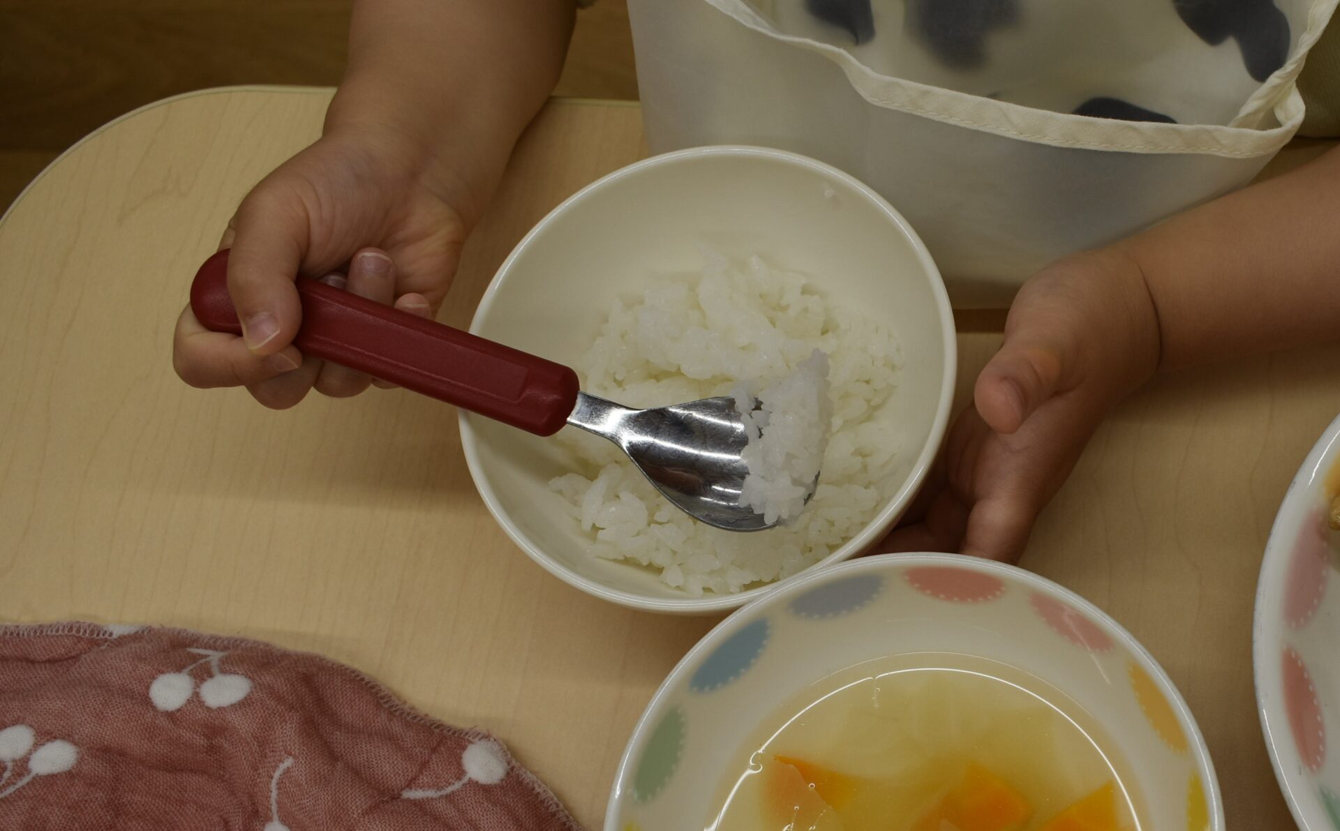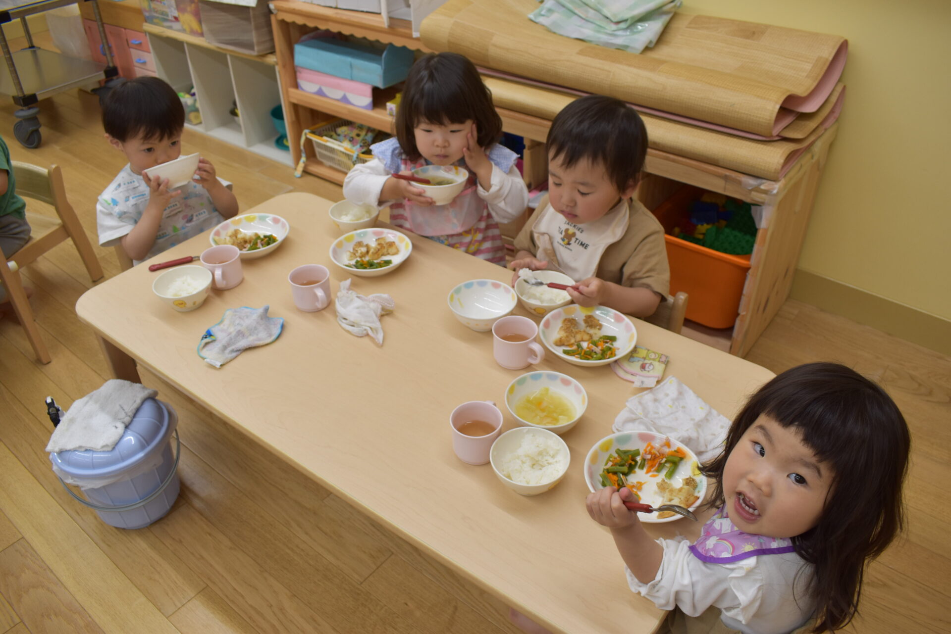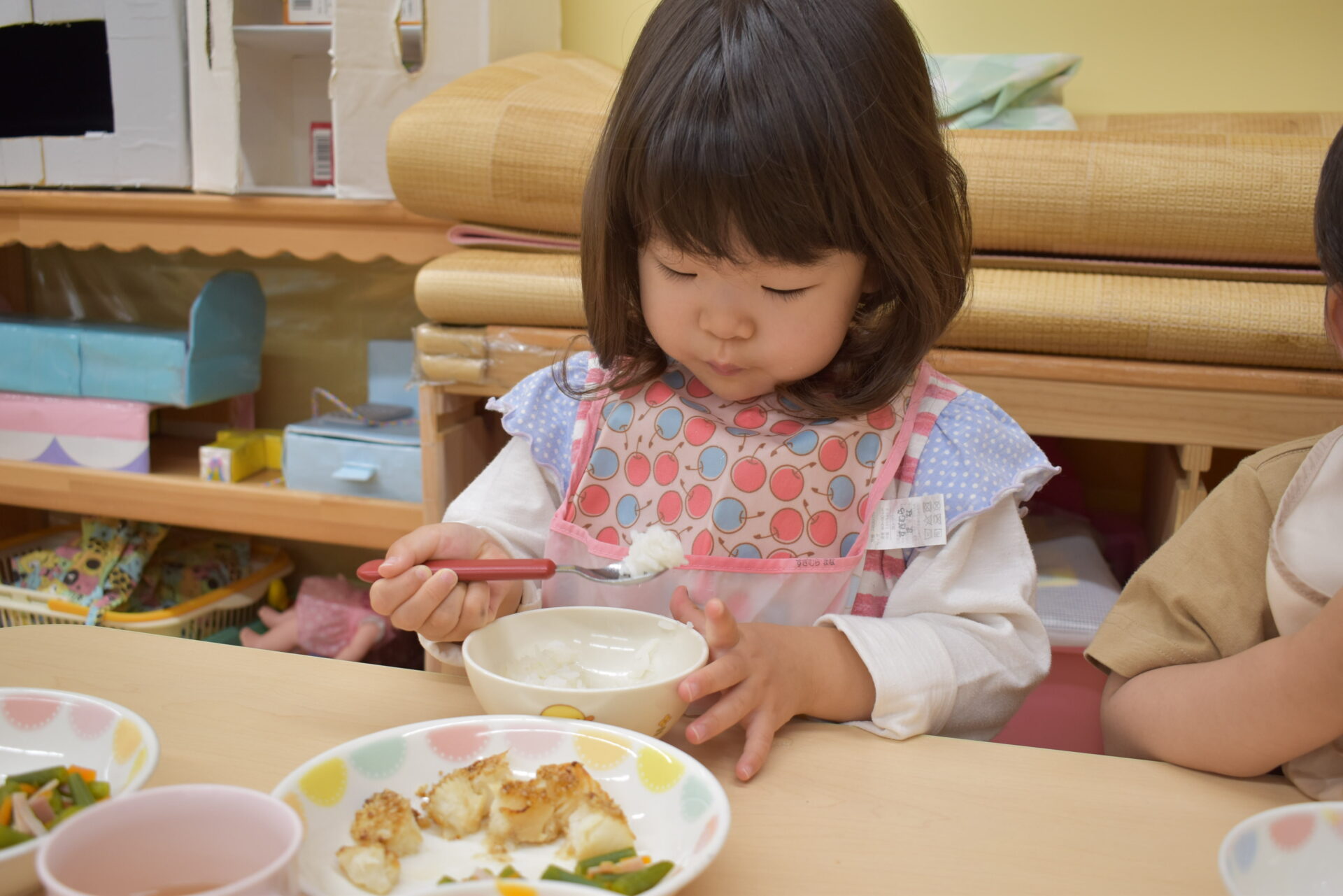 1歳児クラスでは、二部制に分かれて2.3人のお友だちと一緒に食べていました。