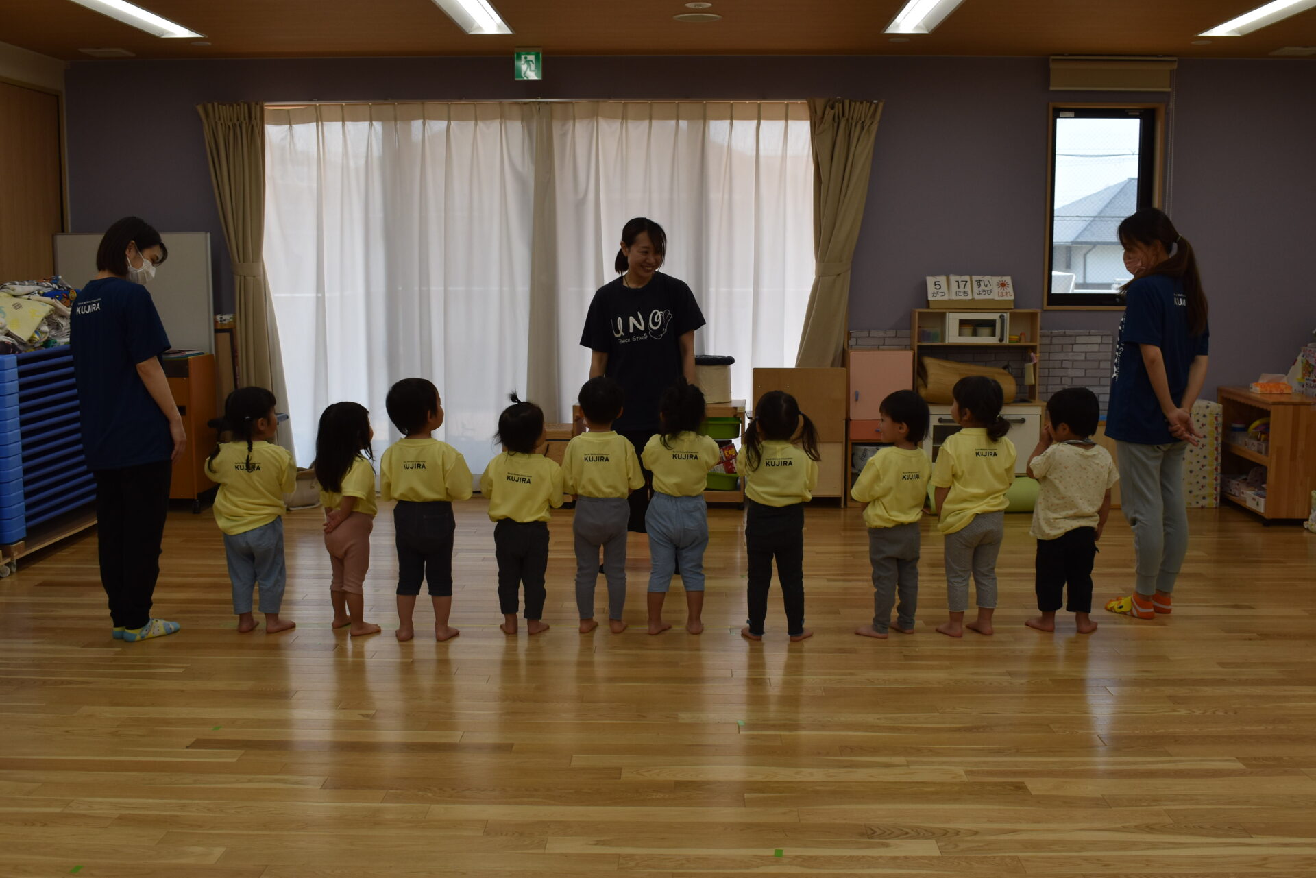 2歳児クラスのあめ組の子ども達は、お揃いのくじらTシャツを初めて着ての参加です。