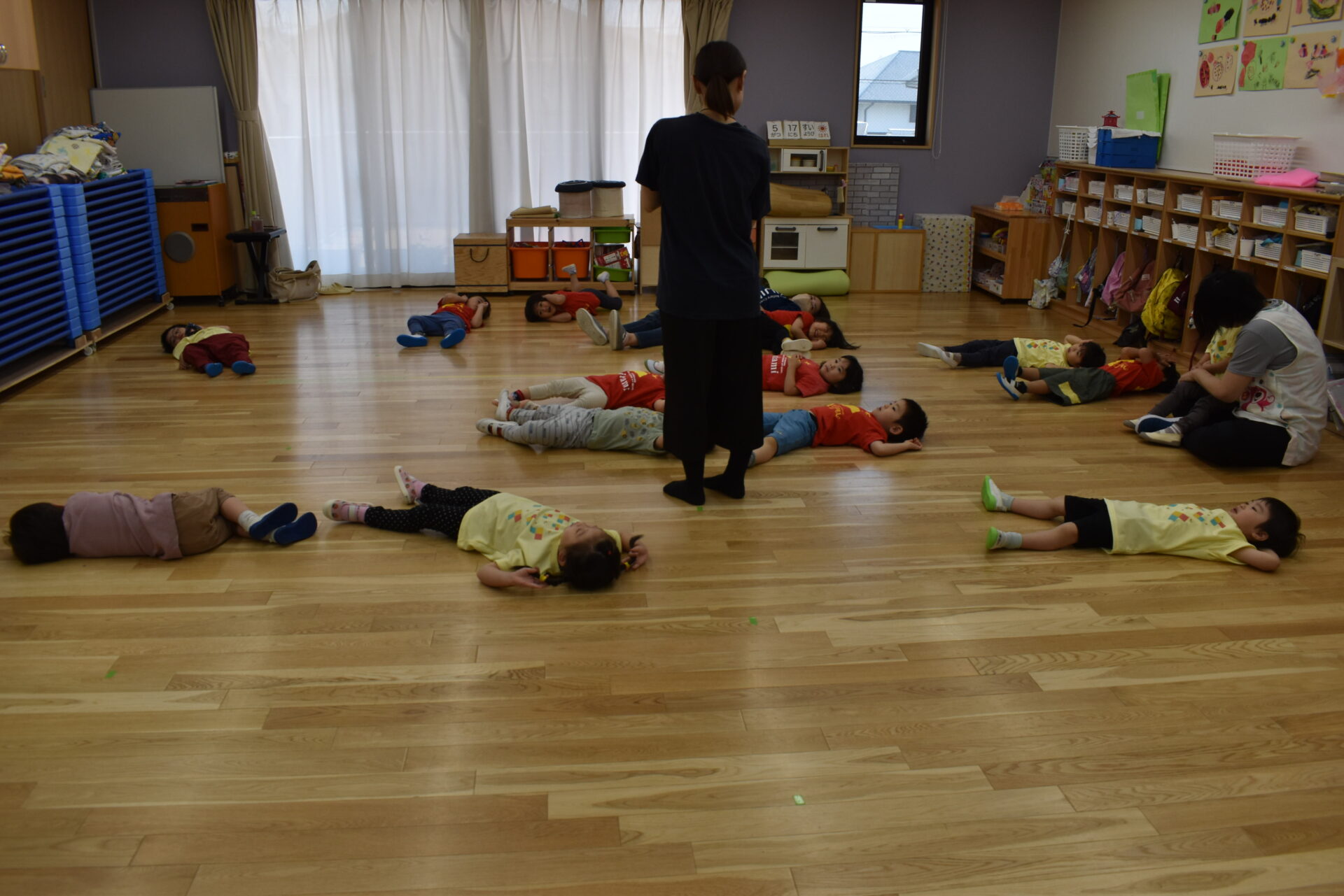 逆に、ちょっと寝転んで休憩…ではなく、講師の先生が手を叩いたらサッと立つことにチャレンジです。いつ音が鳴るか、集中して耳で聞きます。