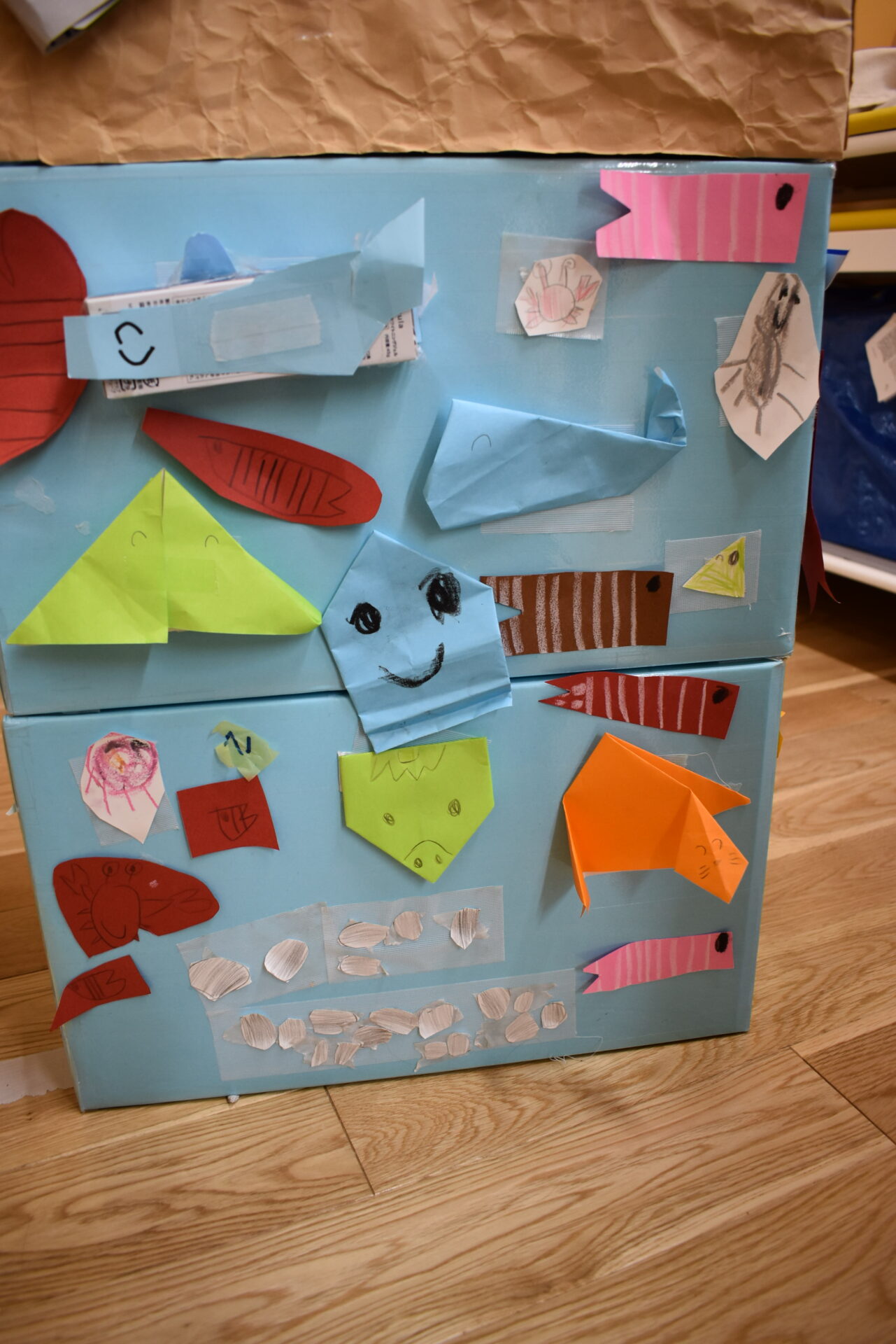 4つのグループに分かれて、友だちと何を作りたいか話し合い、作りました。