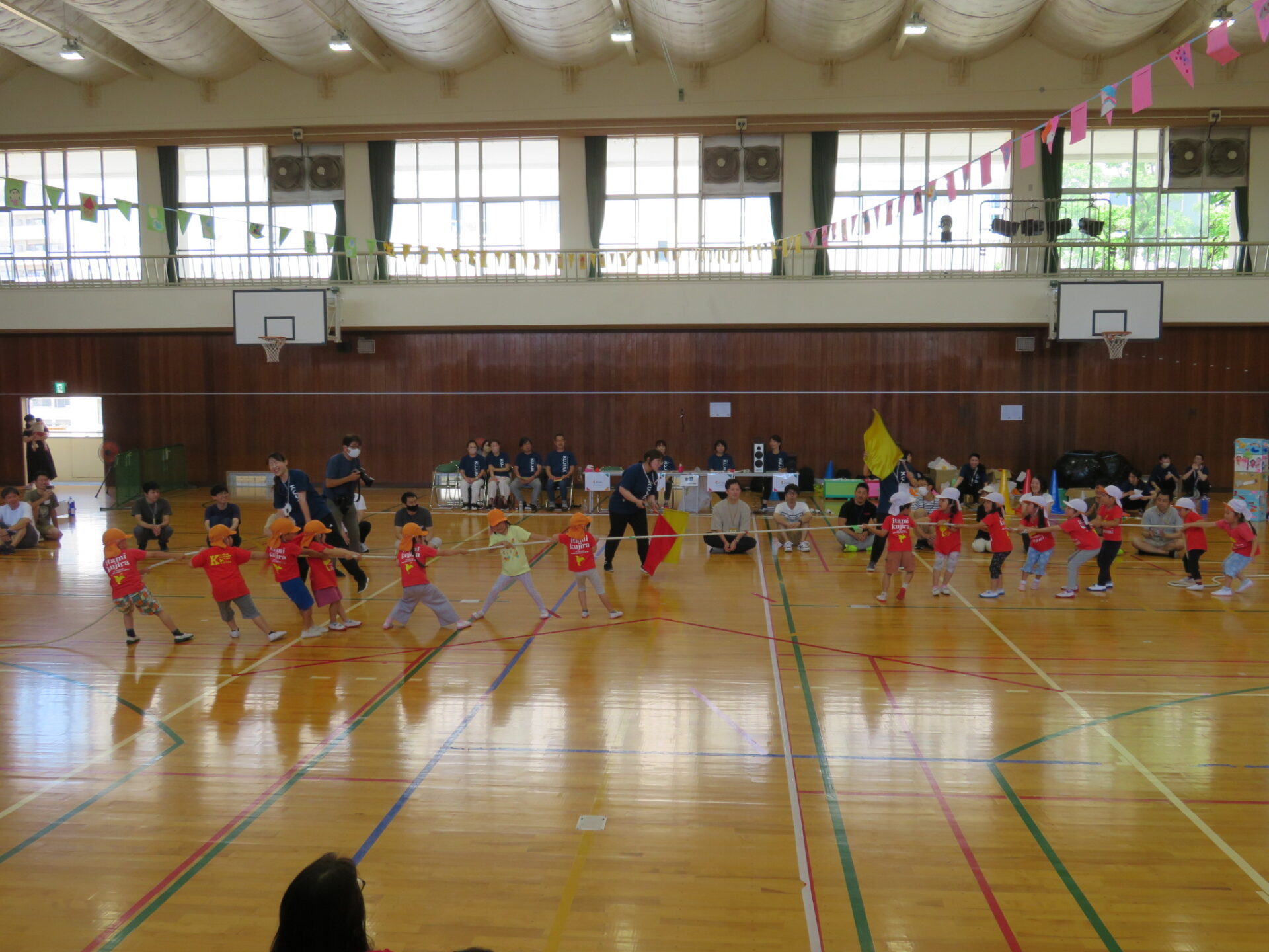 子ども同士、保護者同士の戦いでは互いが1回ずつ勝ち、最後の混合対決ではオレンジの帽子のチームが見事勝利!! 白色帽子のチームの子ども達は……悔しくて涙を流す子もいました。
