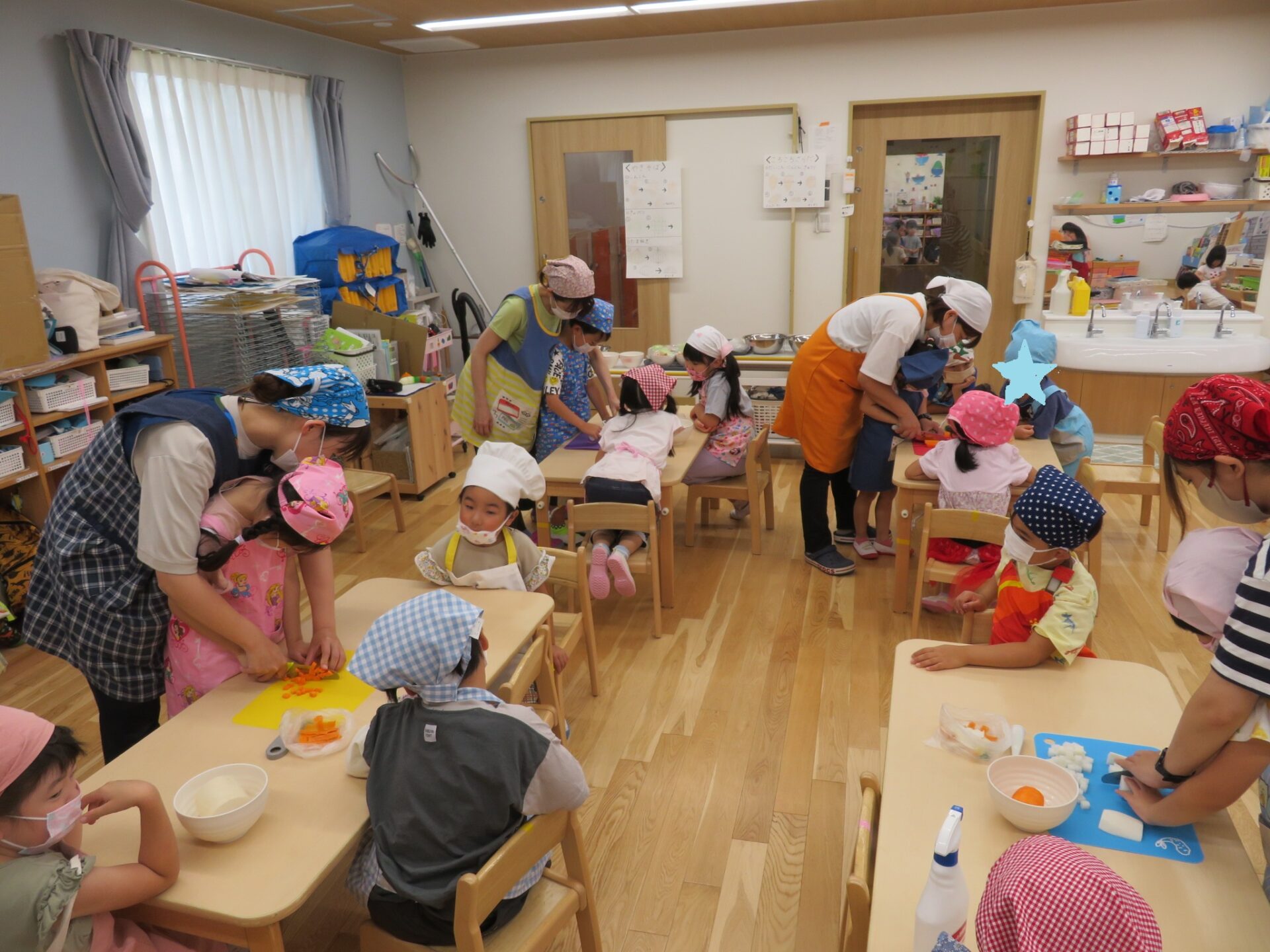 玉ねぎは「玉ねぎは、涙出てくるからやめとくわ」と、辞退する子もいる中「平気やで!」意欲的に切ってくれる子もいます。