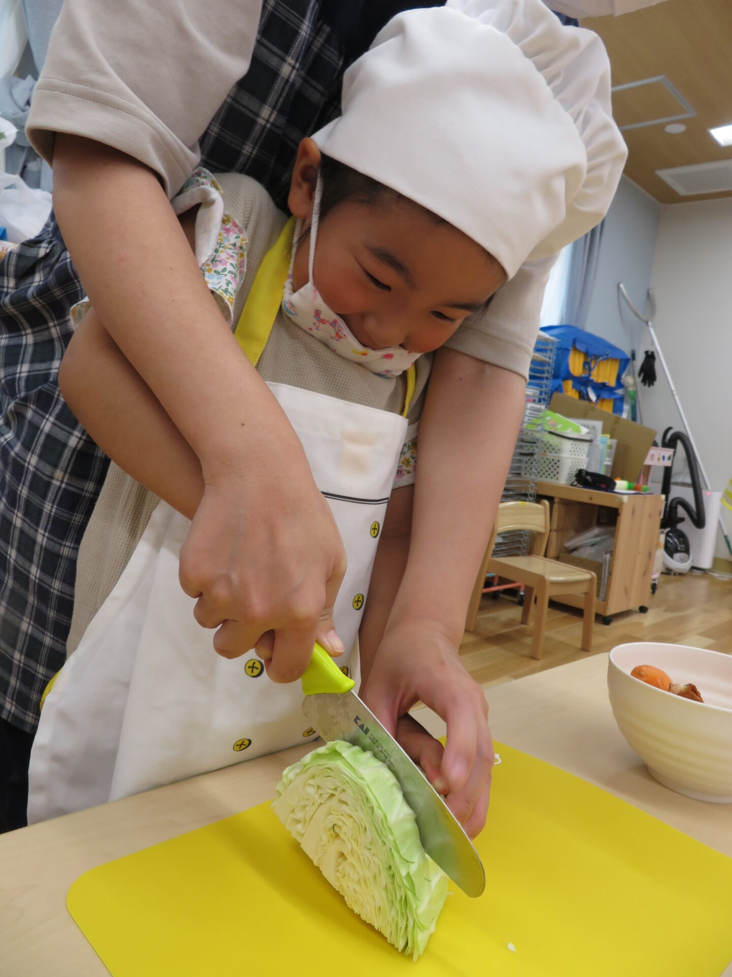 「キャベツって固いんやな!」などなど、楽しむ子ども達です。