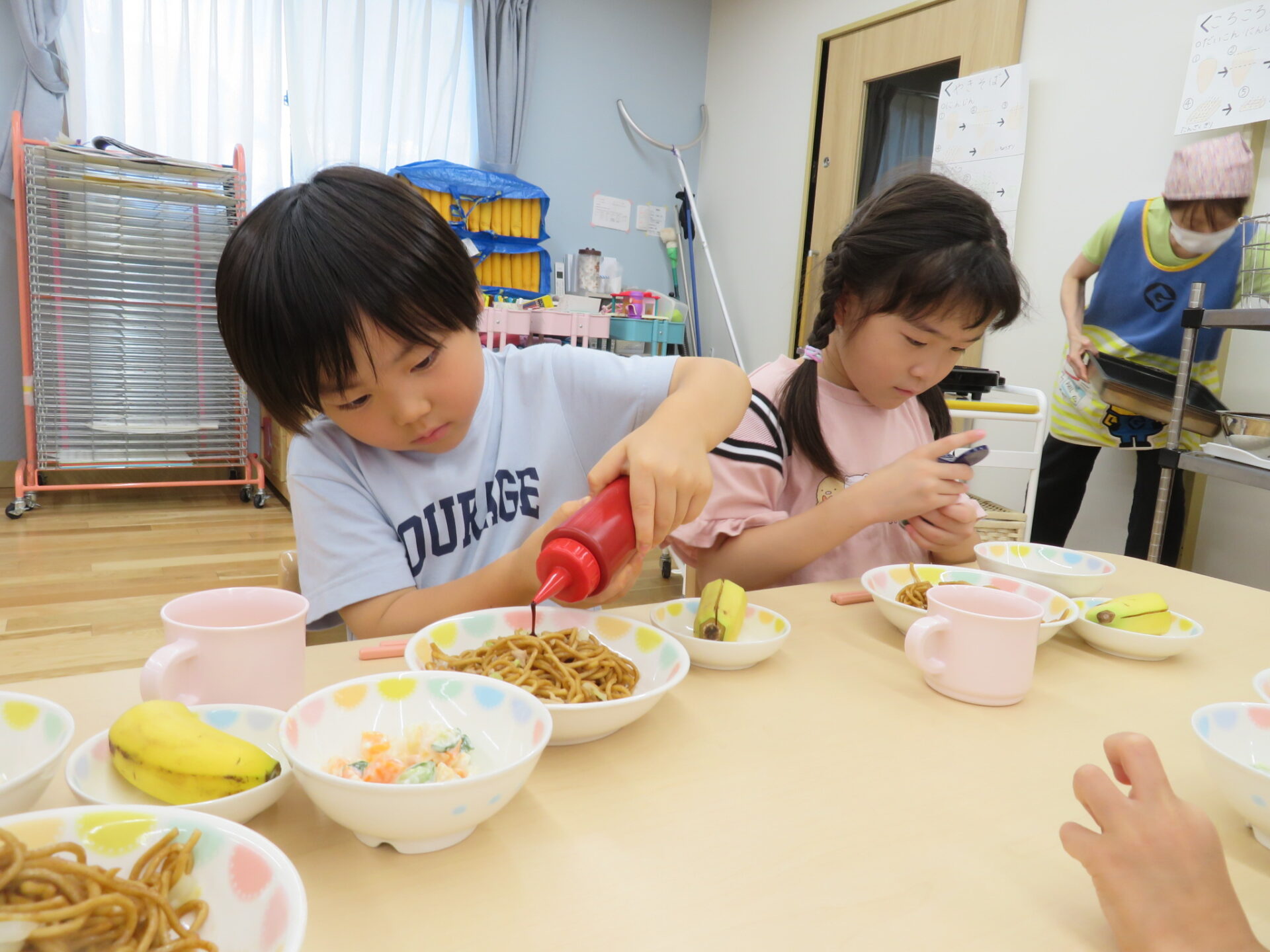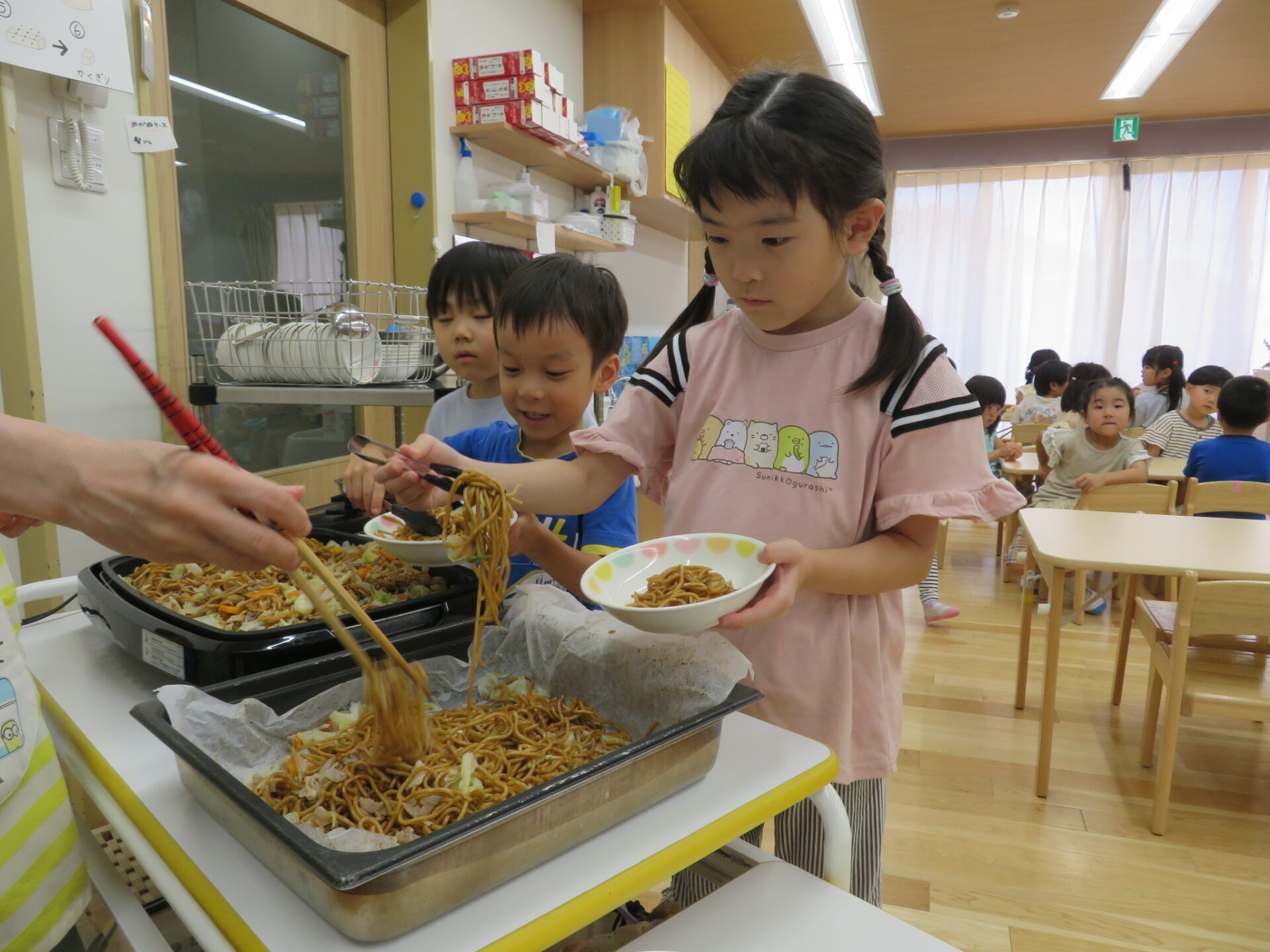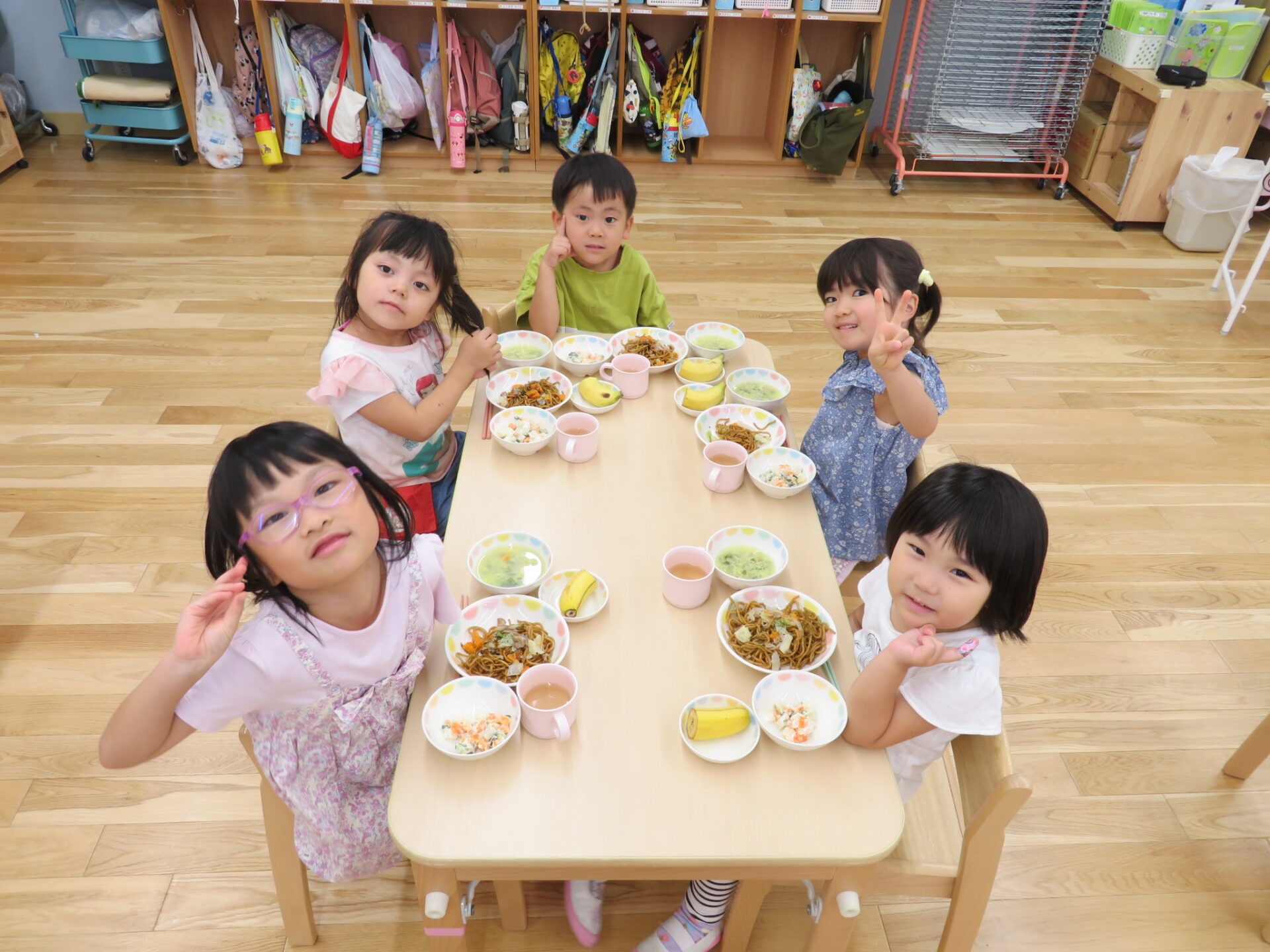 出来上がった焼きそばと、コロコロサラダは4歳児クラスと一緒にビュッフェスタイルでいただきます。