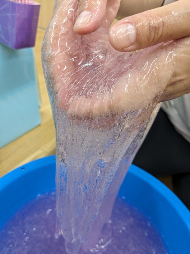 先日、1.2.3歳児クラスの子ども達と、大量のスライムで遊びました。