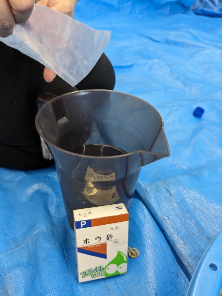 ポイントは、ホウ砂が溶けやすいように、ぬるま湯にホウ砂を入れると溶けやすくなります。