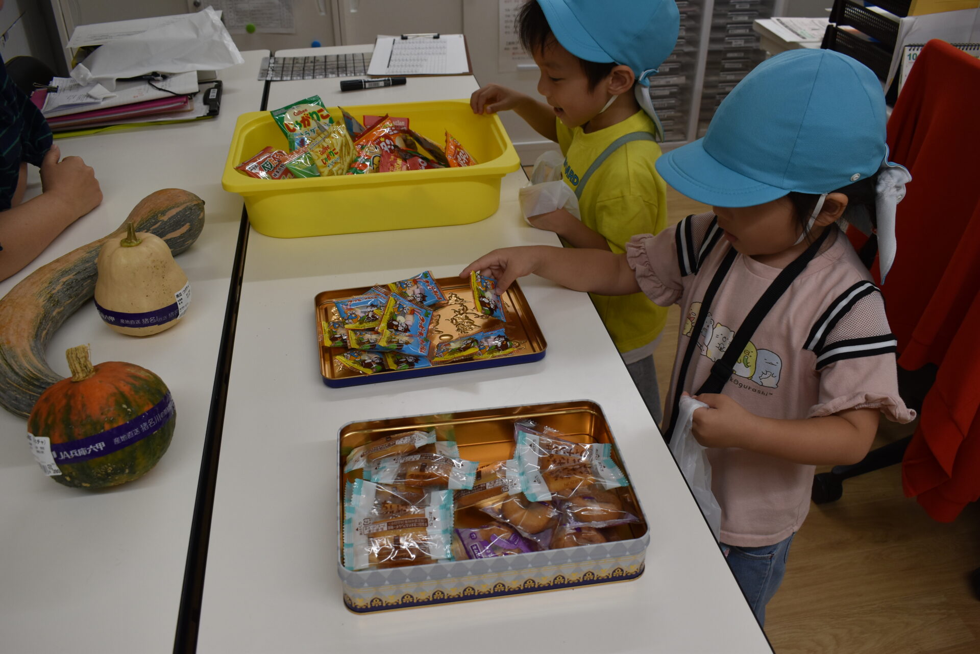 上に並んでいるおやつは、保育者に頼んで取ってもらいます。