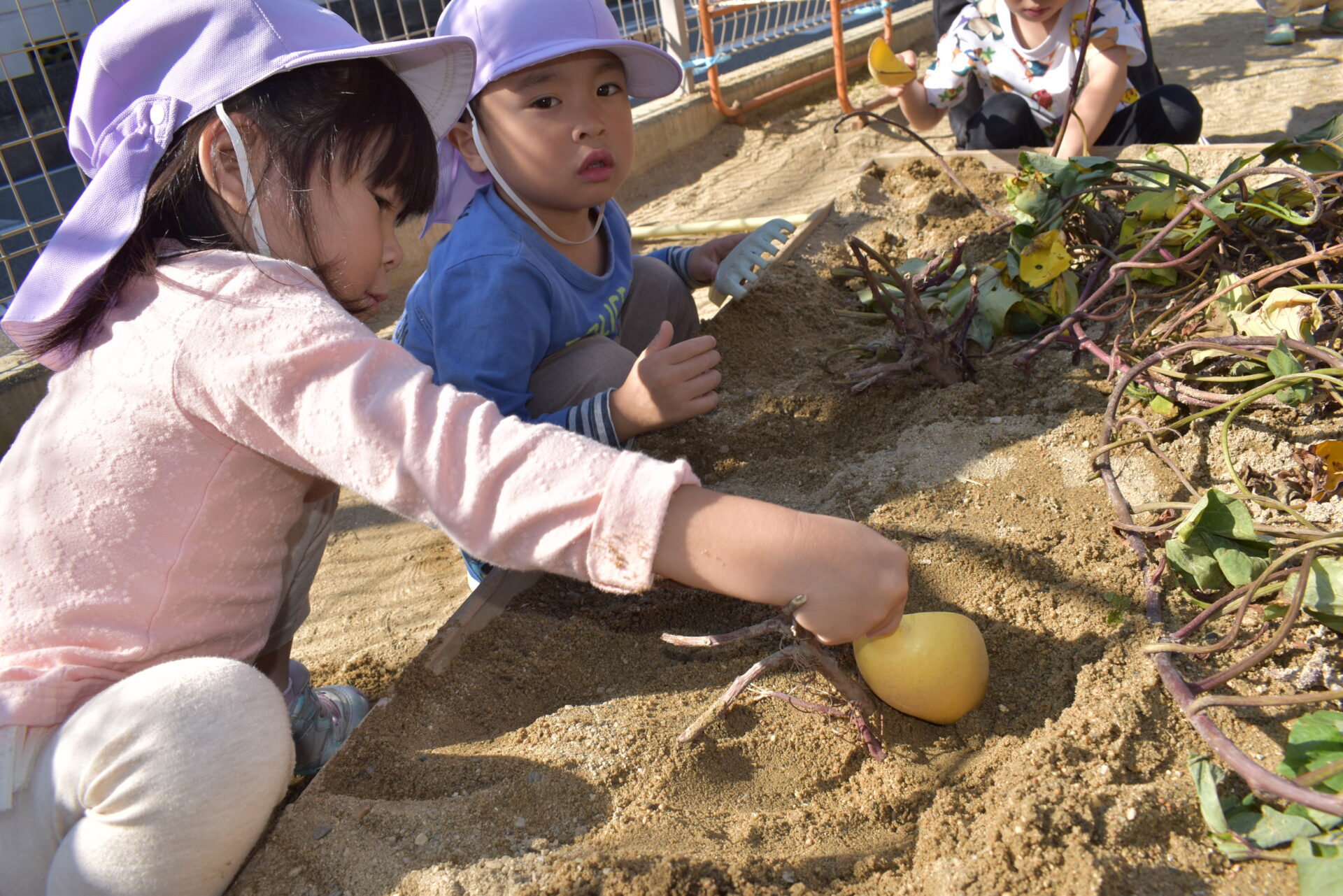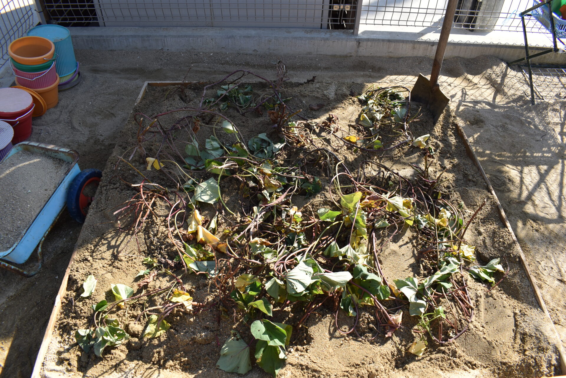 この砂場の中の芋は、ひとつひとつバラバラではなく、ツルについていている物が埋まっているんです。