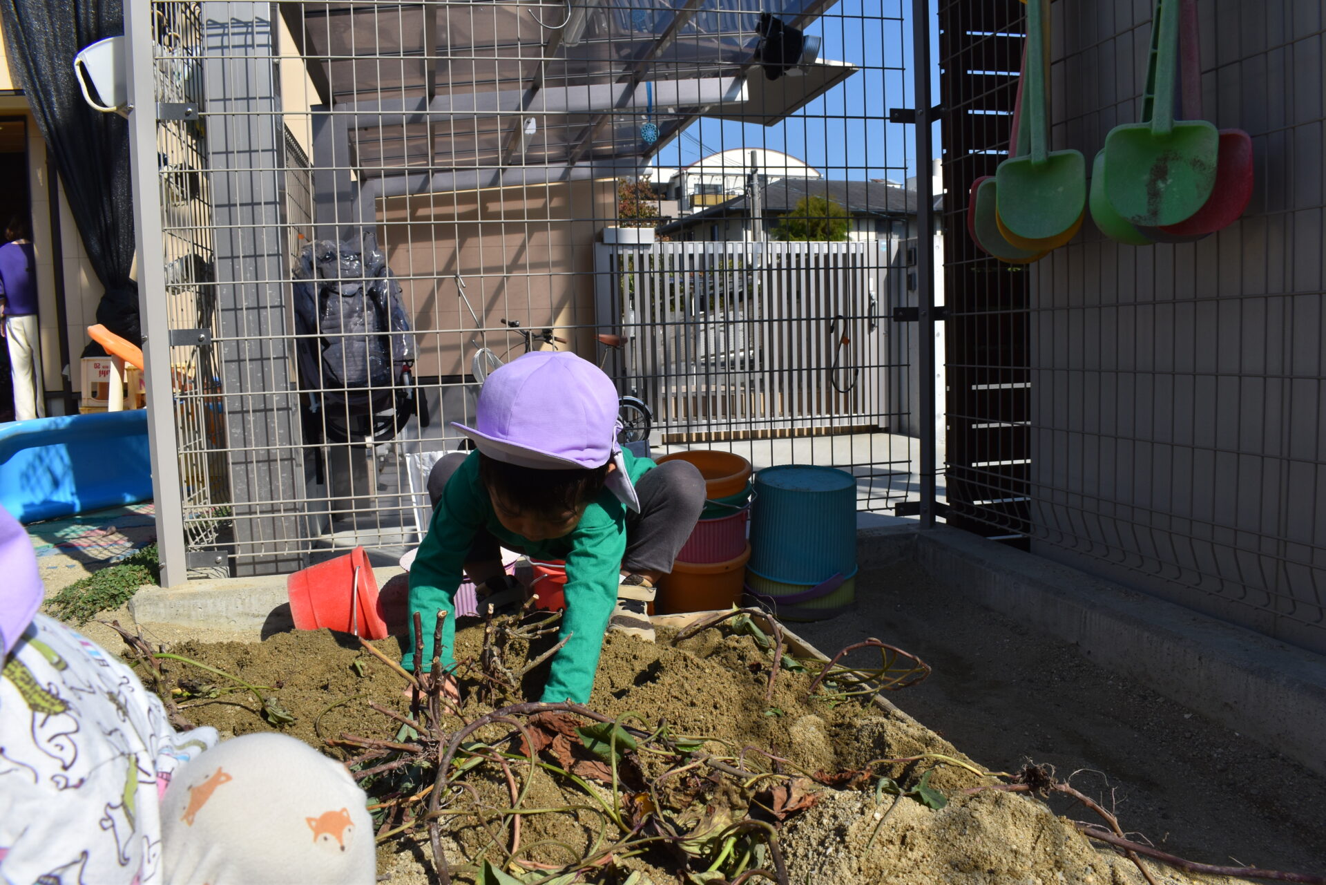 まずは、3歳児クラスがリアルに体験できるように砂場の砂を湿らしながら、芋を埋めて準備完了!