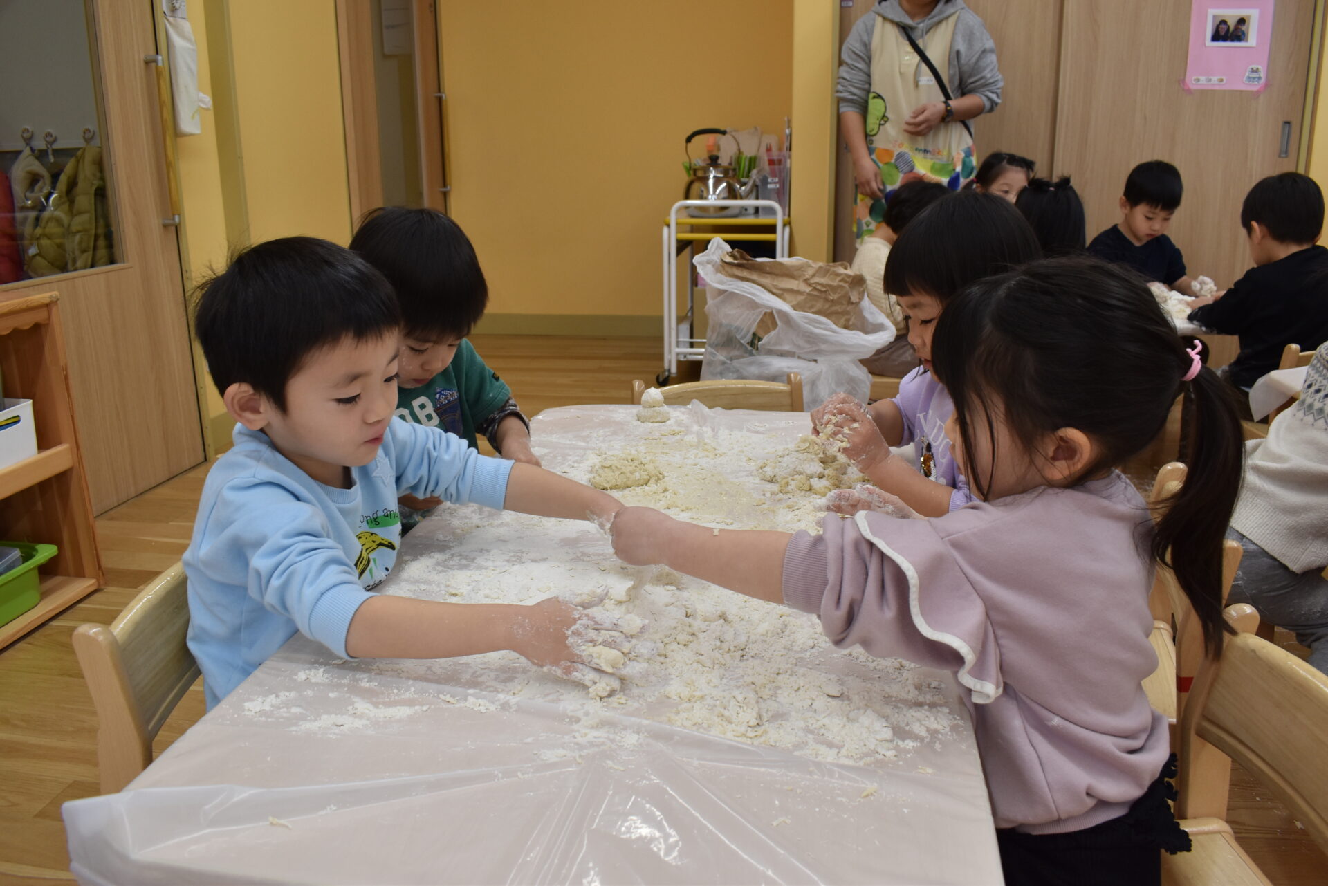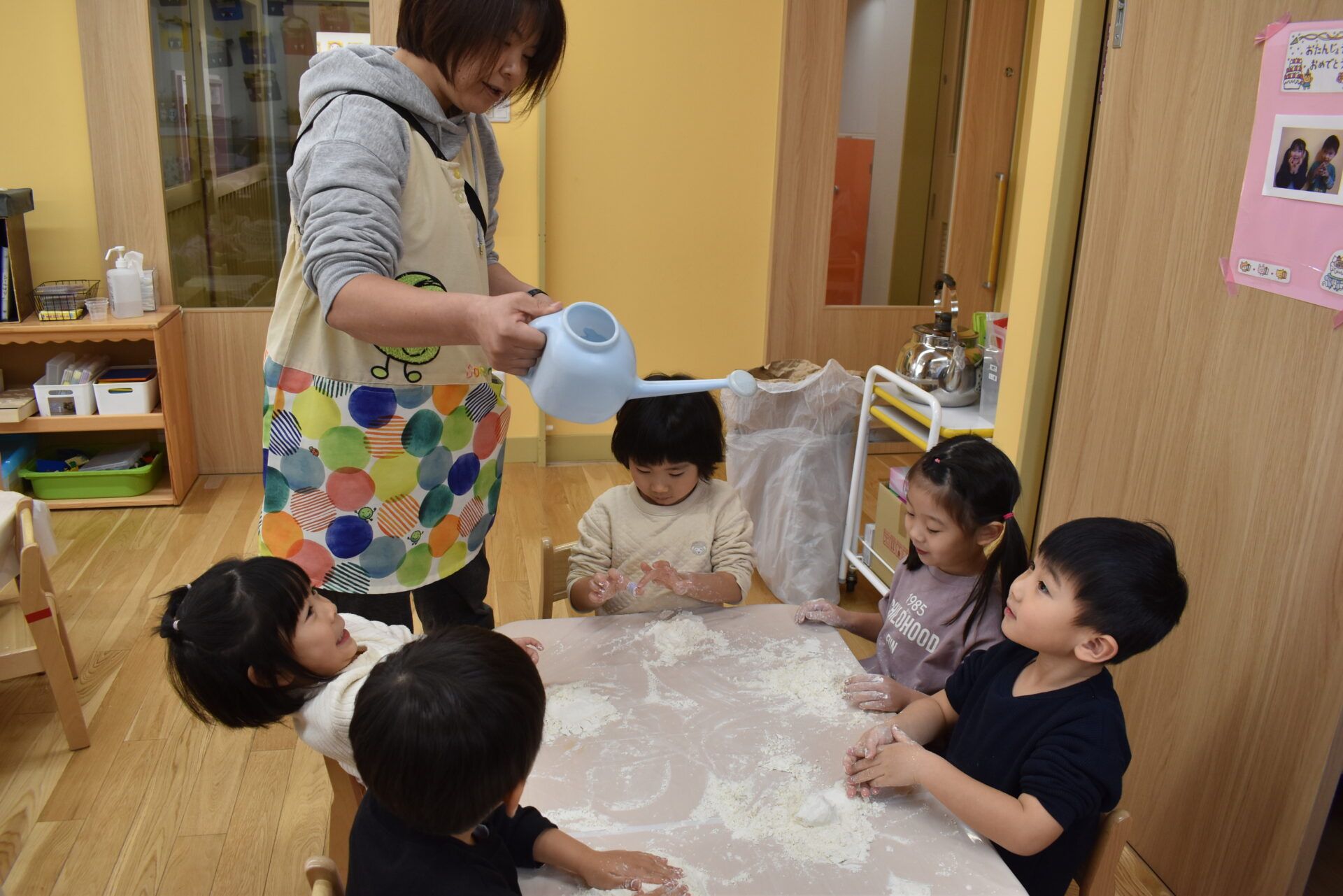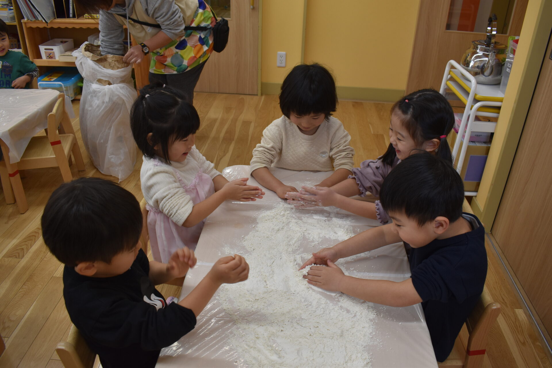 そこで、急遽小麦粉を使って、3歳児クラスの子ども達と雪の見立て遊びをしました。