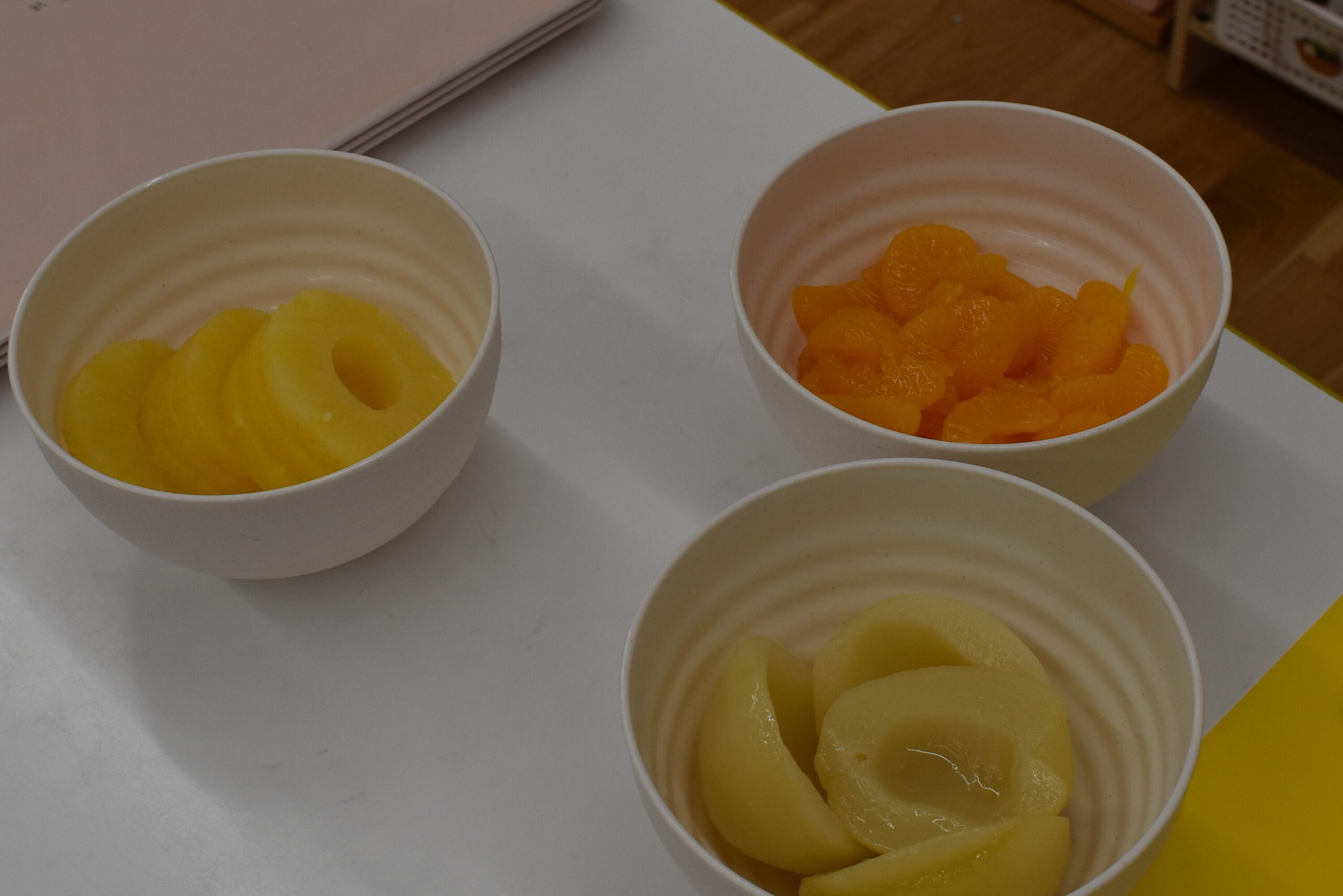今回の材料は、缶詰の甘いシロップ入りの特性ゼリー液と、みかん・パイナップル・ももの缶詰です。