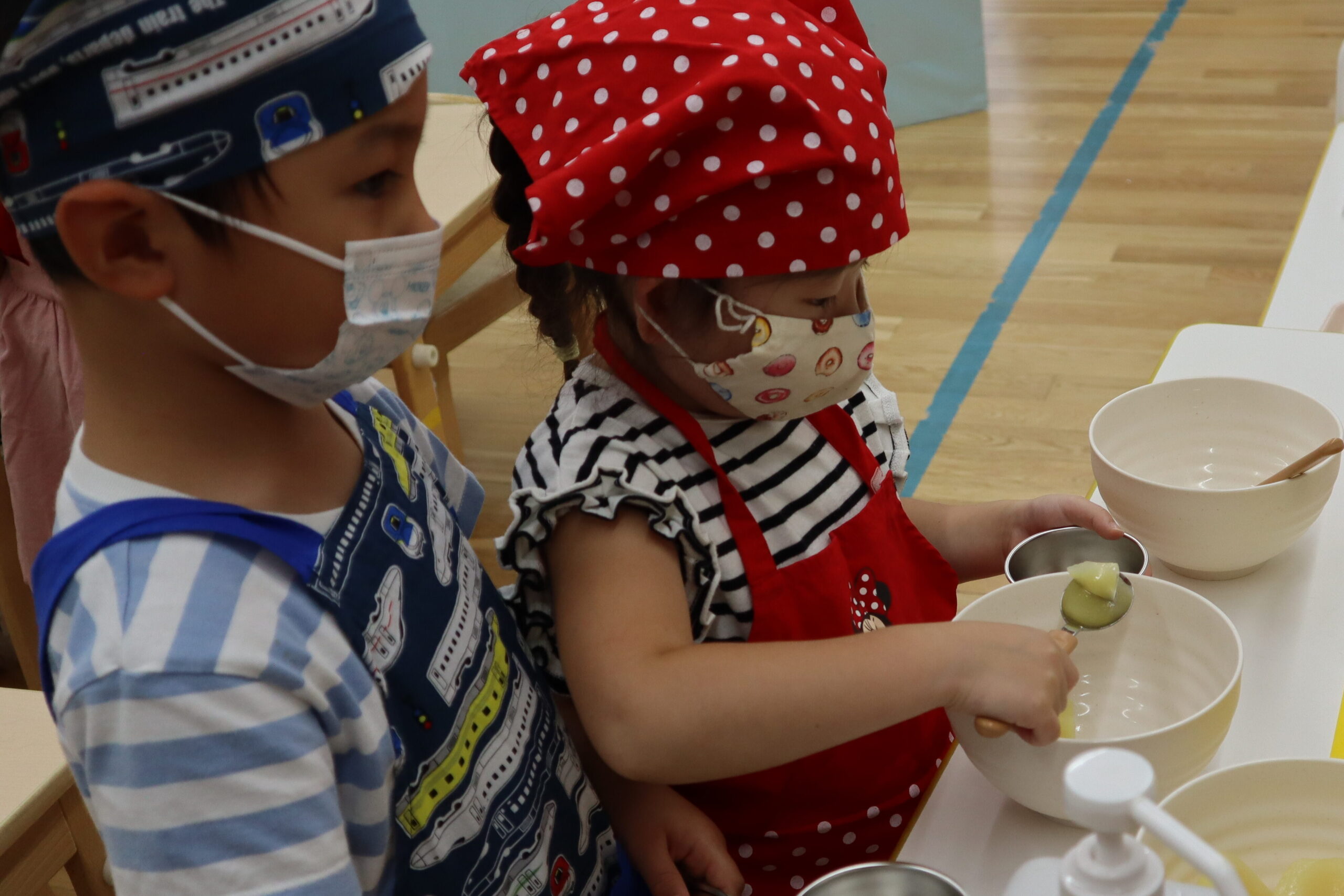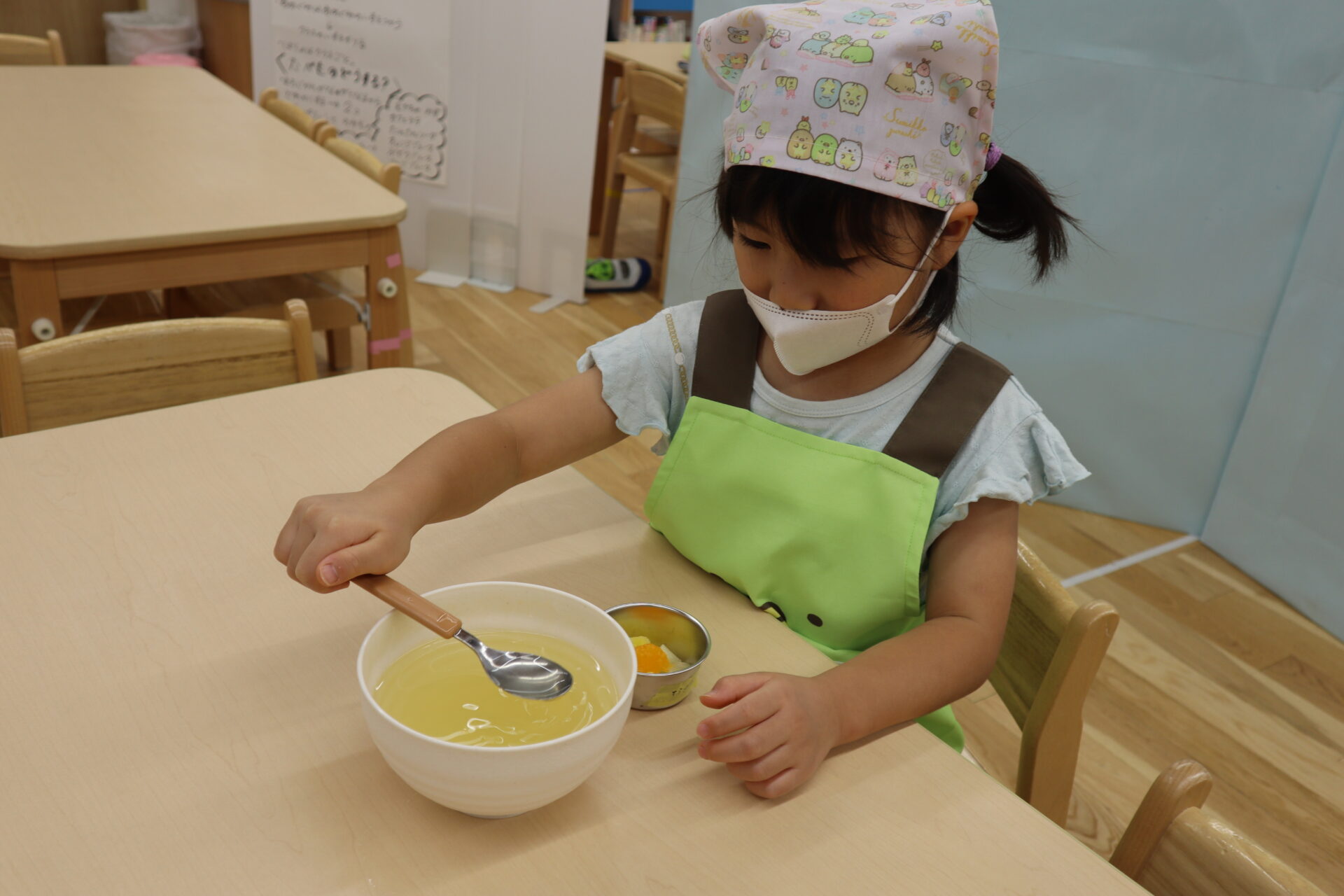 本物のゼリーを作る前に、自分だけのオリジナルカラーのゼリーを作って遊んでいた子ども達は、今回のクッキングを心待ちにしていました!