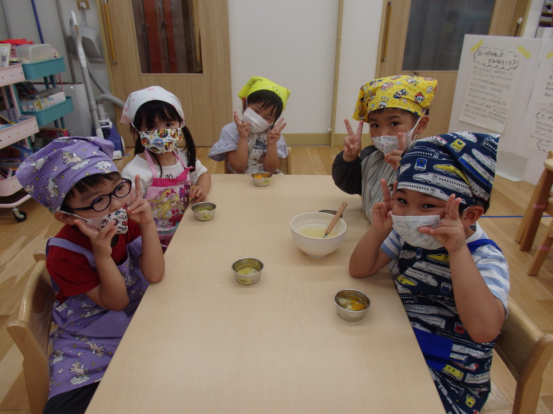 今回は、4歳児クラスの子ども達と『フルーツたっぷりゼリー』を作りました!