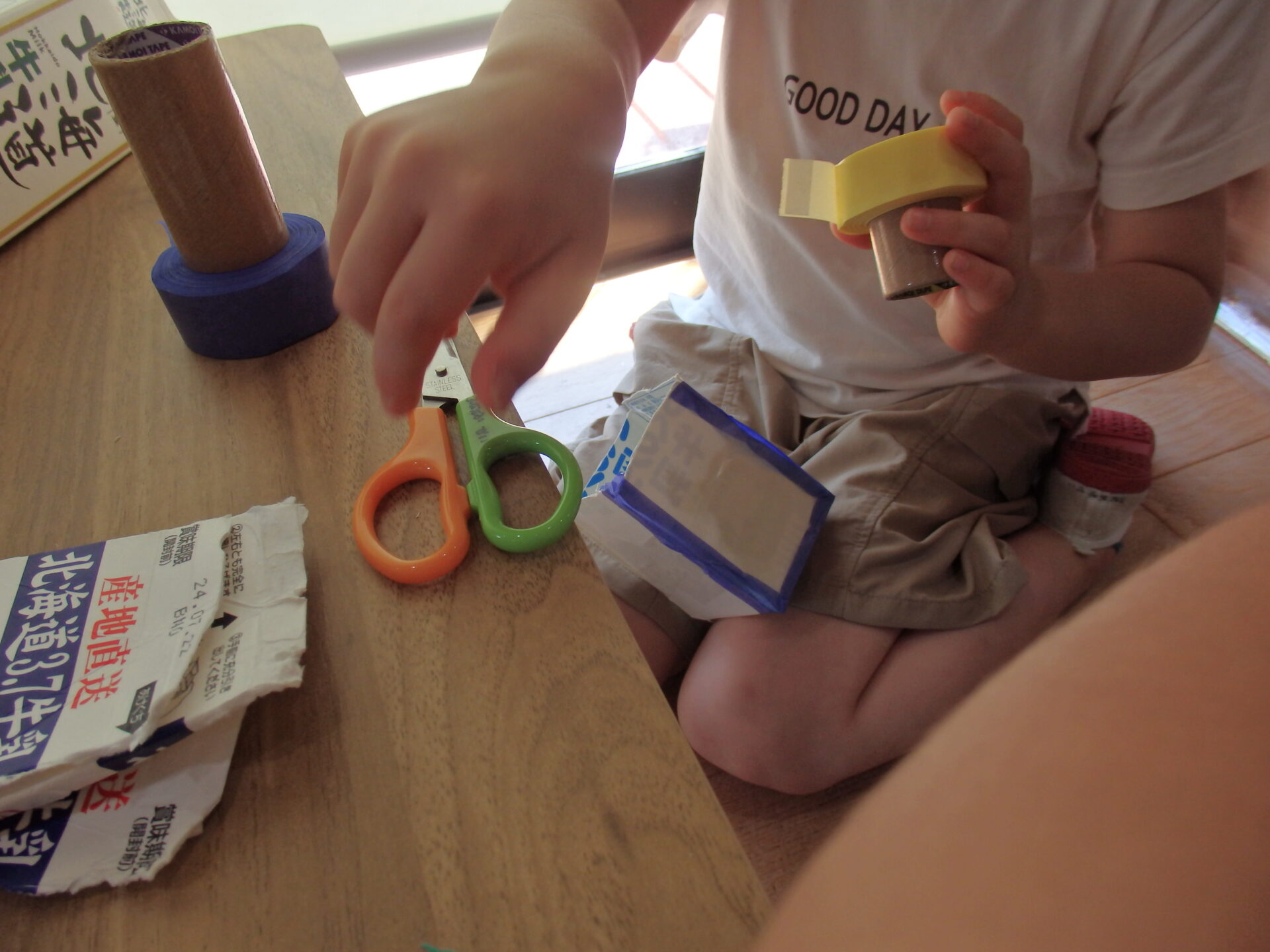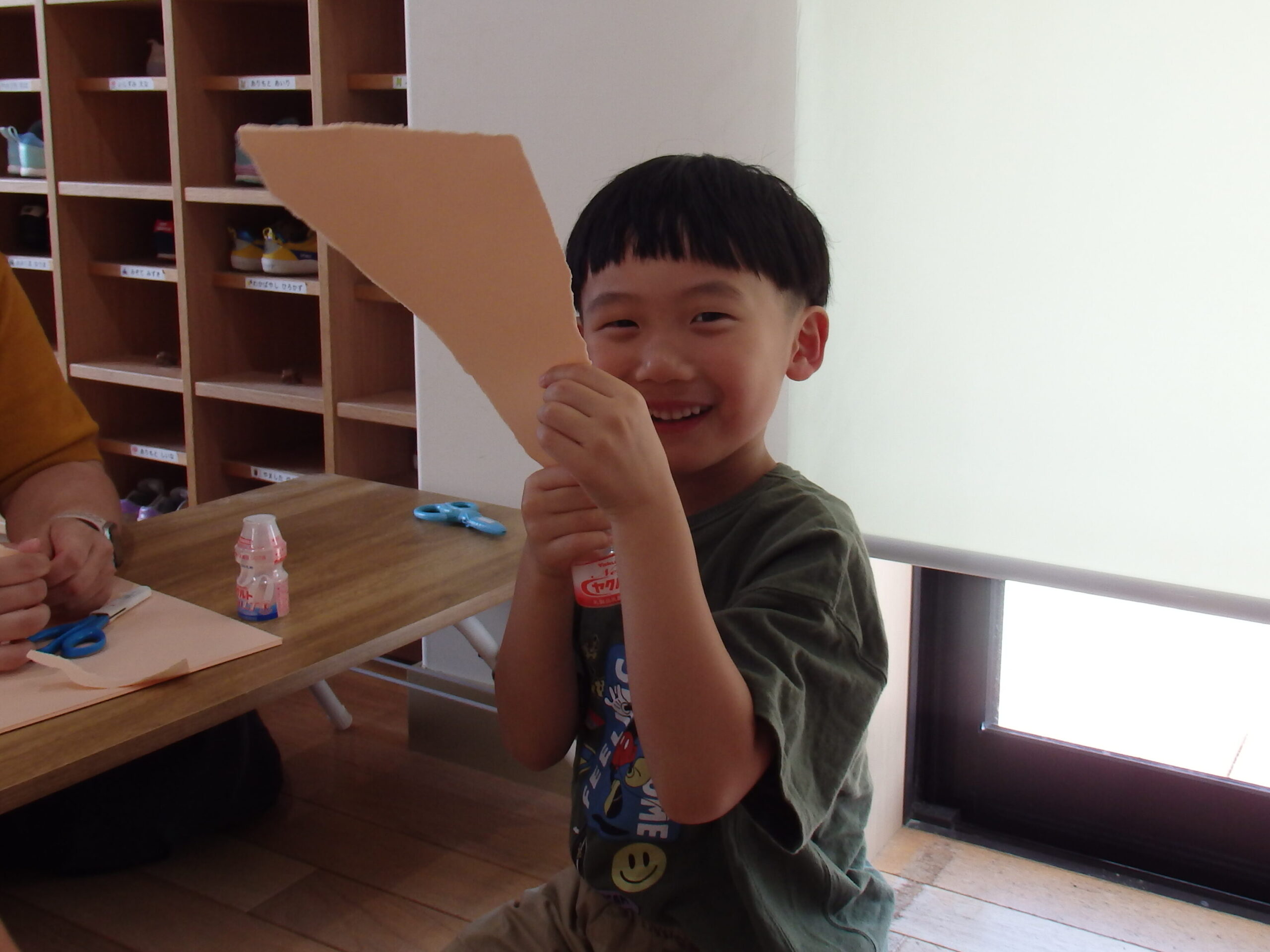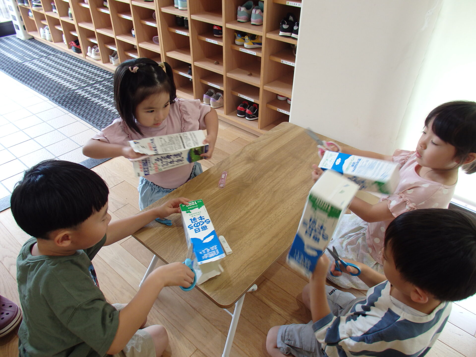 牛乳パックは少し硬いので心配でしたが、「よっしゃー!切るで!」と気合を入れて頑張っていました。