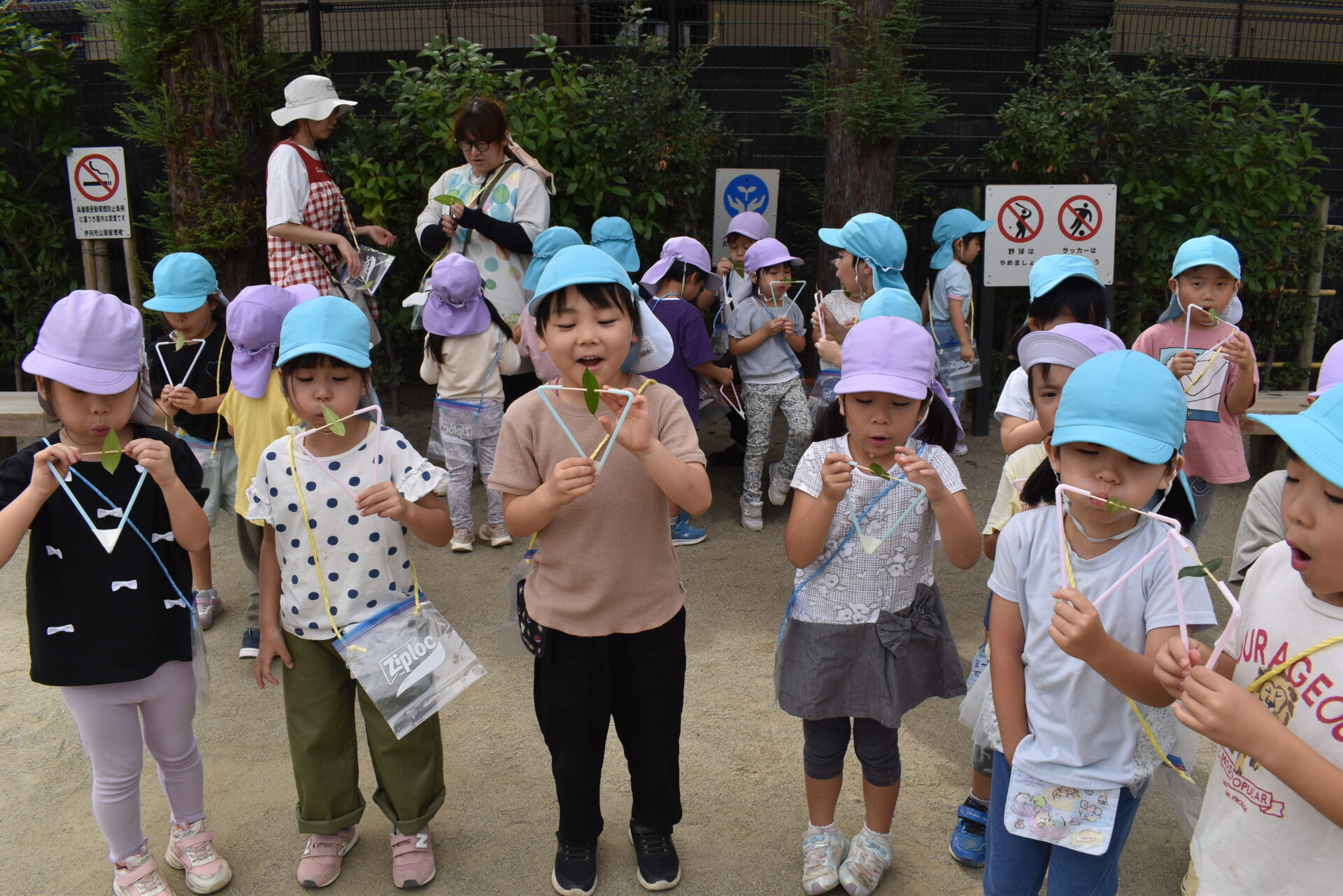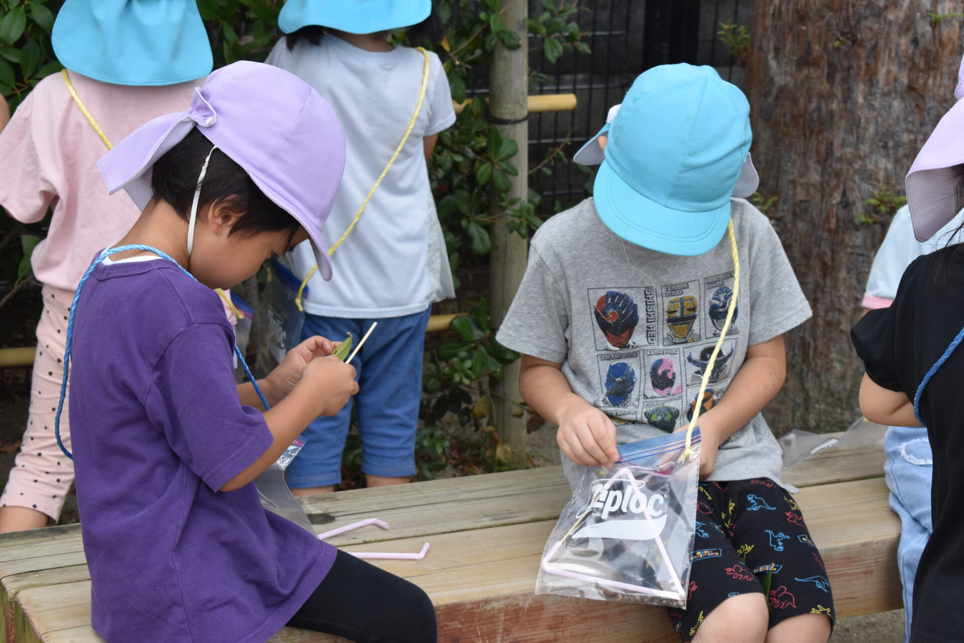 事前に用意した、ジップロックのお散歩バックに、葉っぱぐるぐるの装置を入れて準備万端の子ども達。