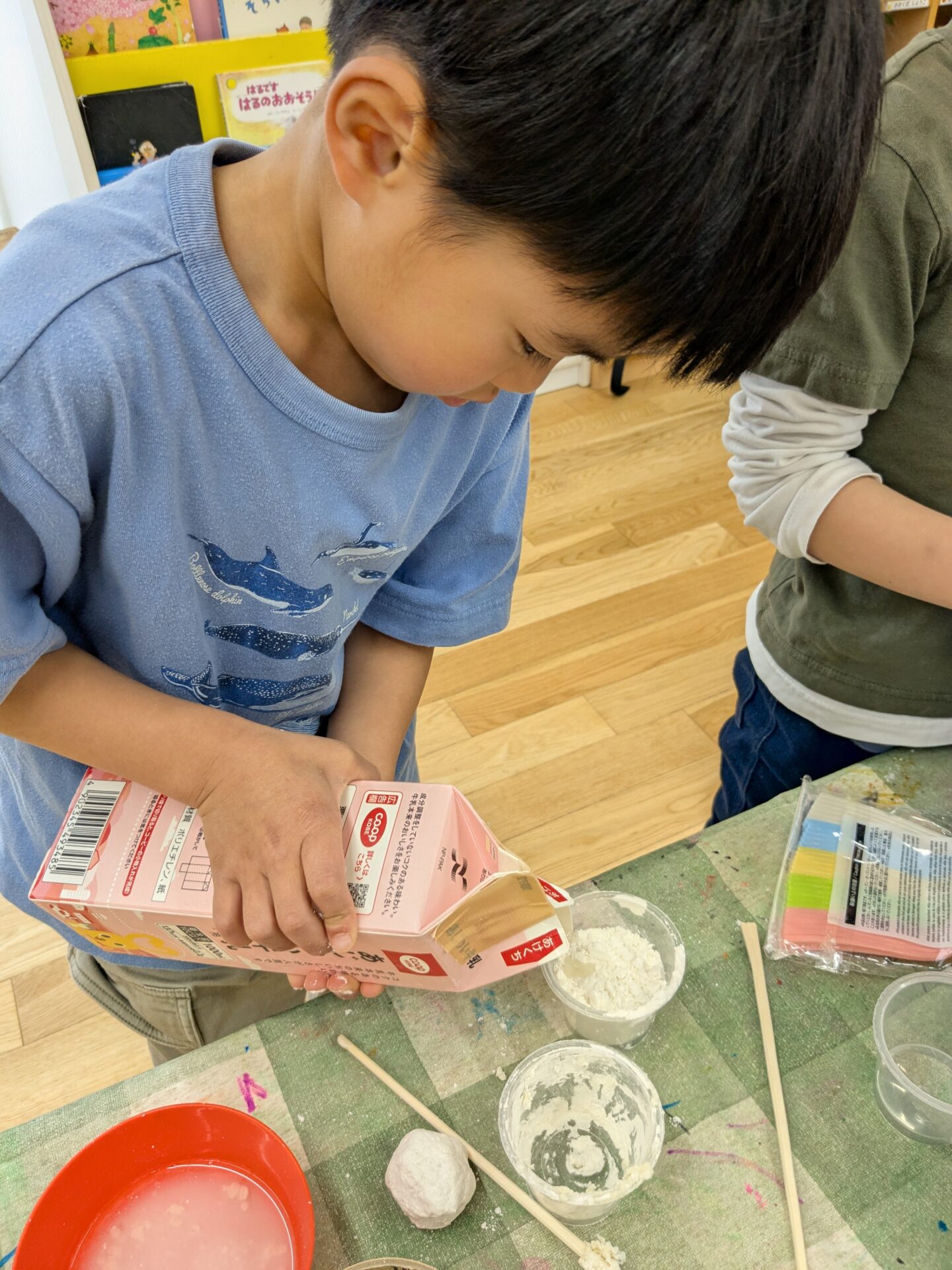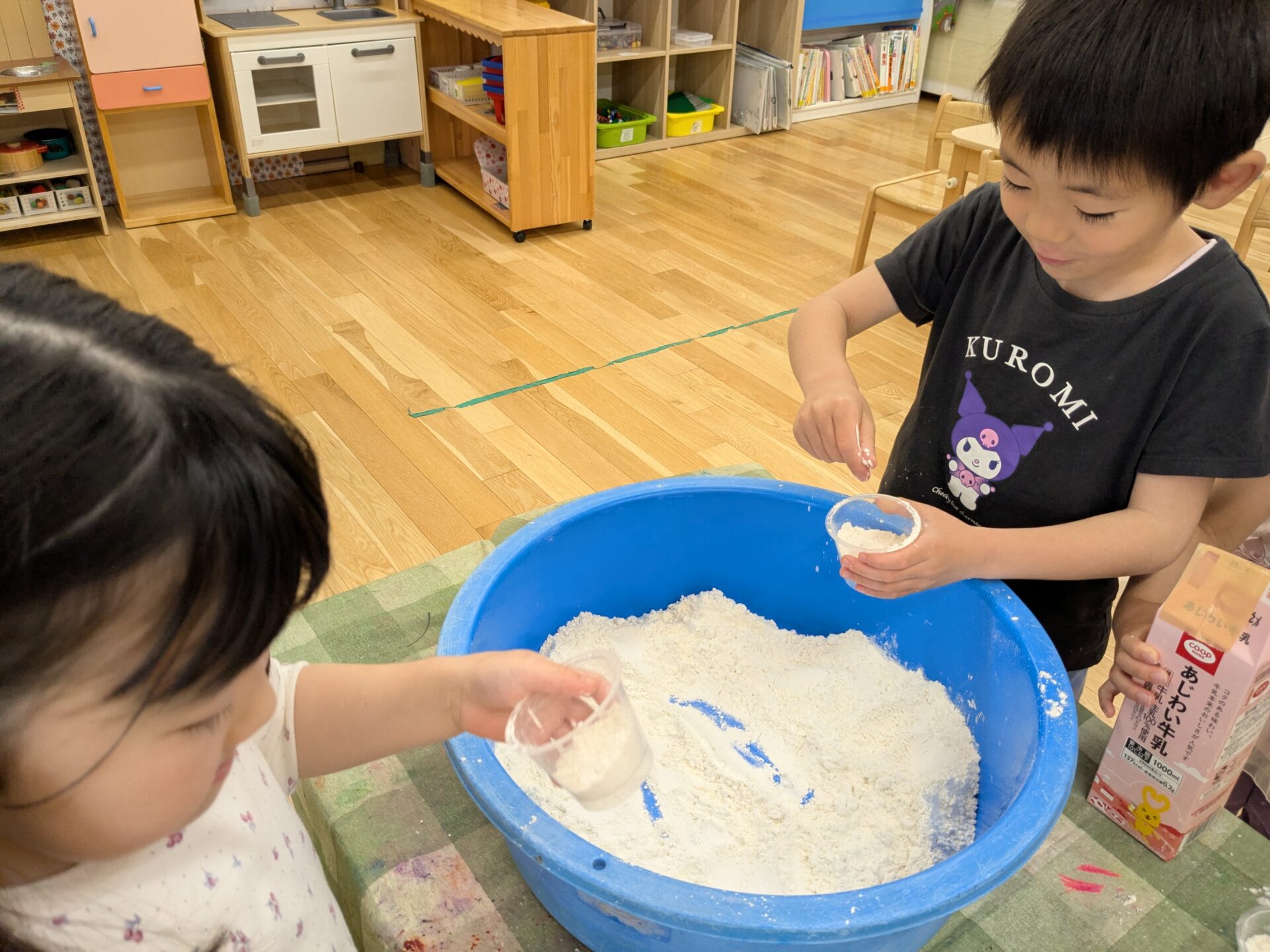 大きなタライの中に、沢山の小麦粉と、牛乳パックの中には水を用意して準備完了です。
