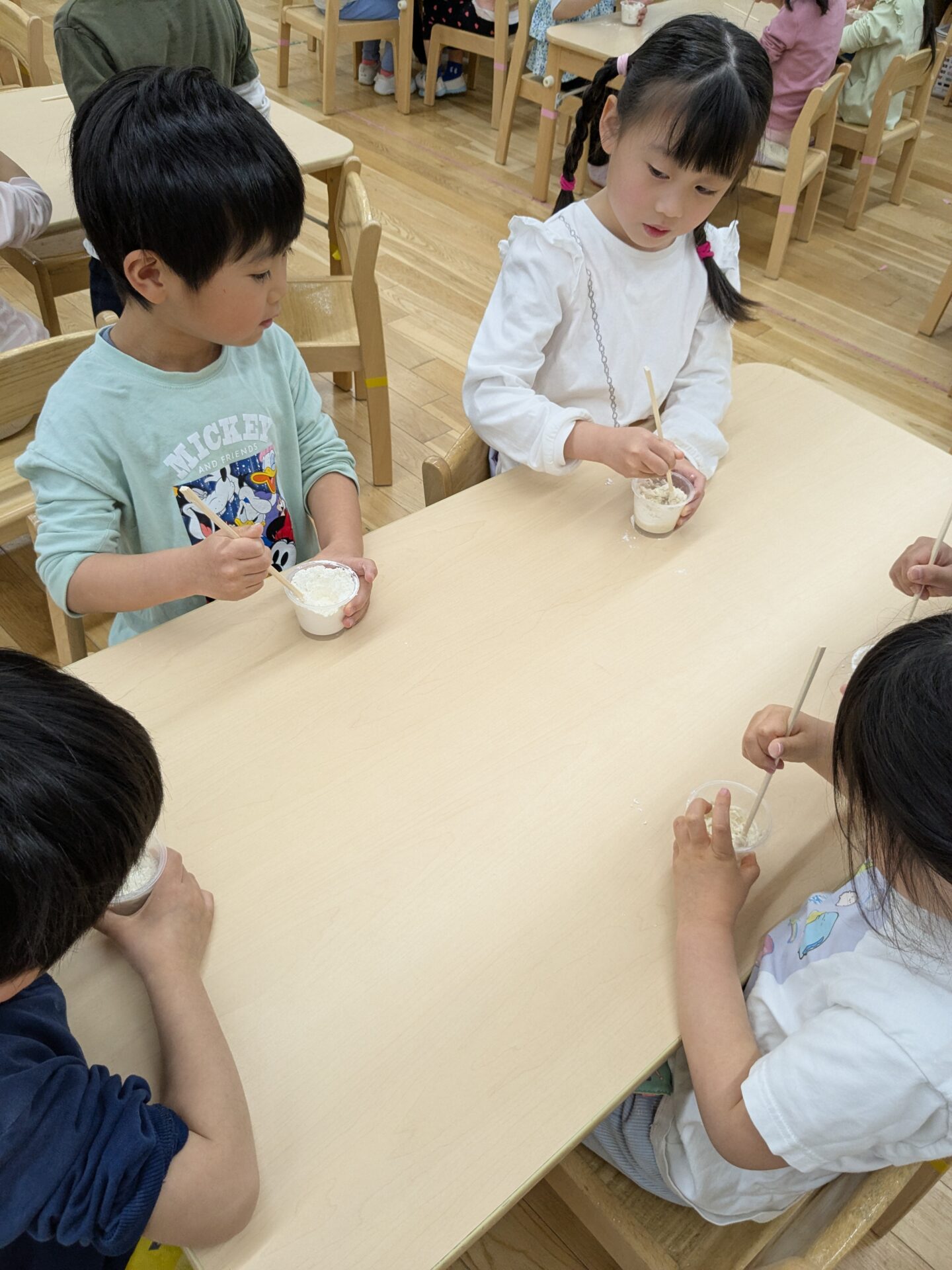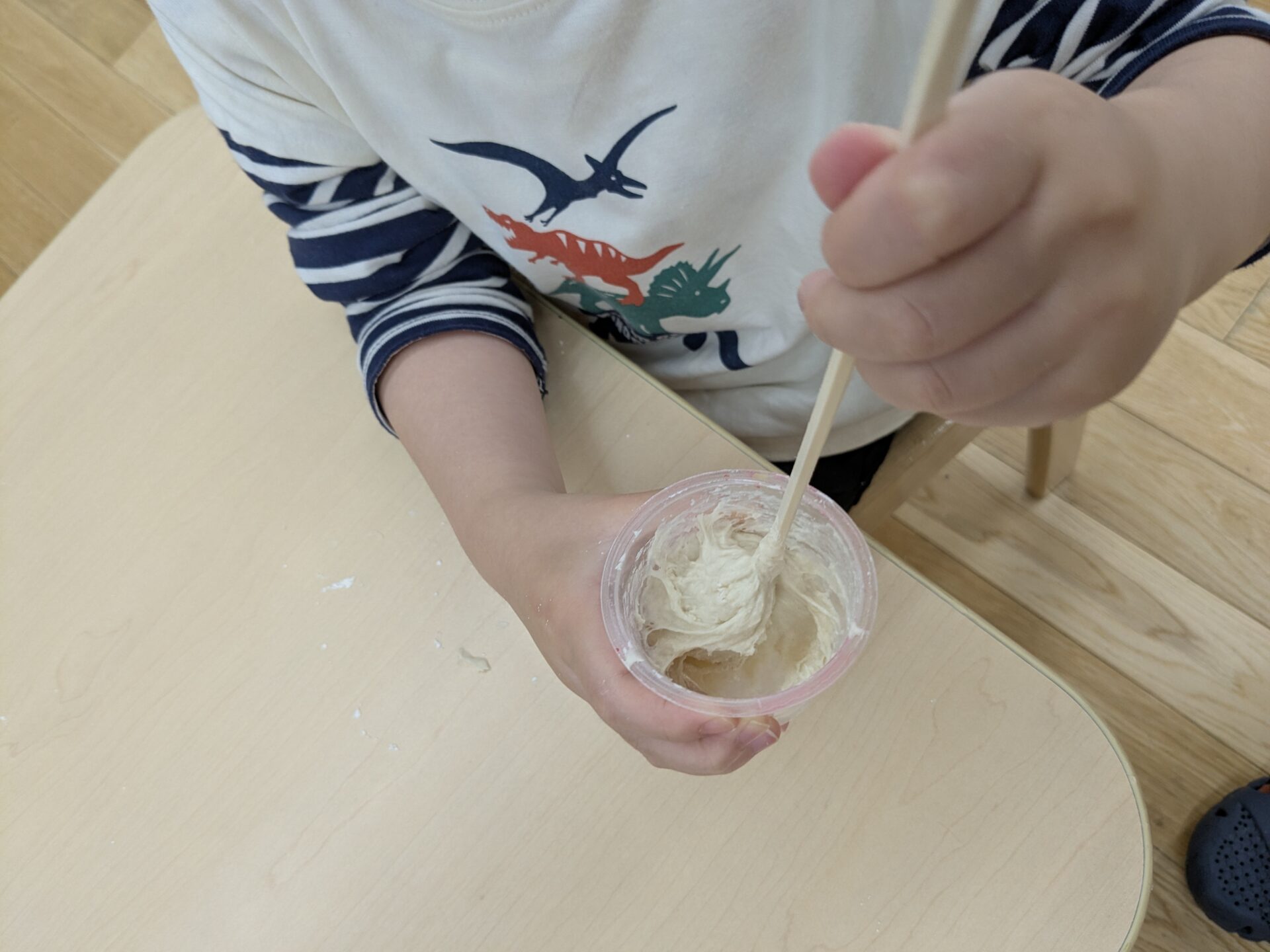 今回は、自分で粘土を作ってみよう‼ということで、ひとり1つカップと割り箸を用意して挑戦です!