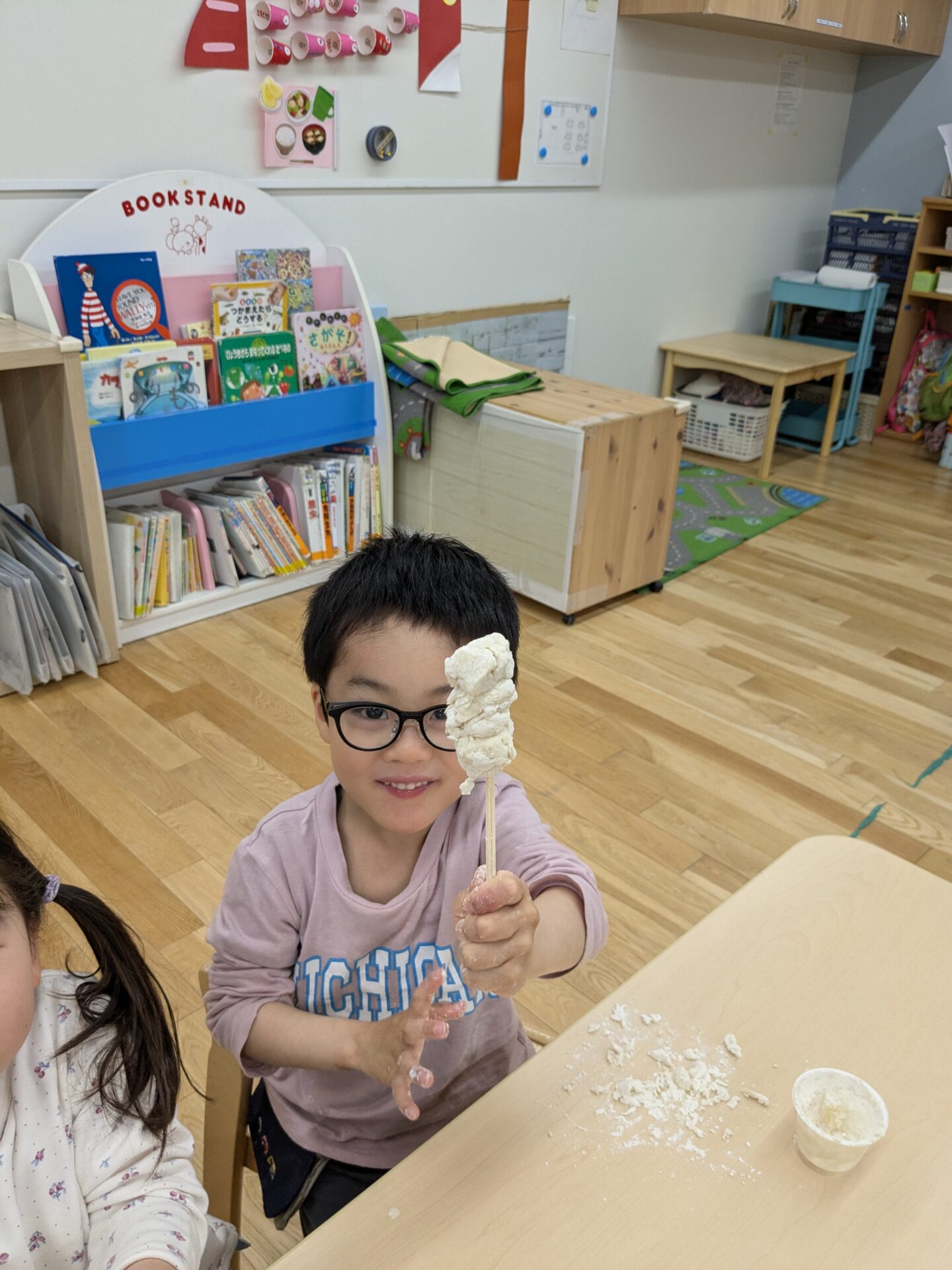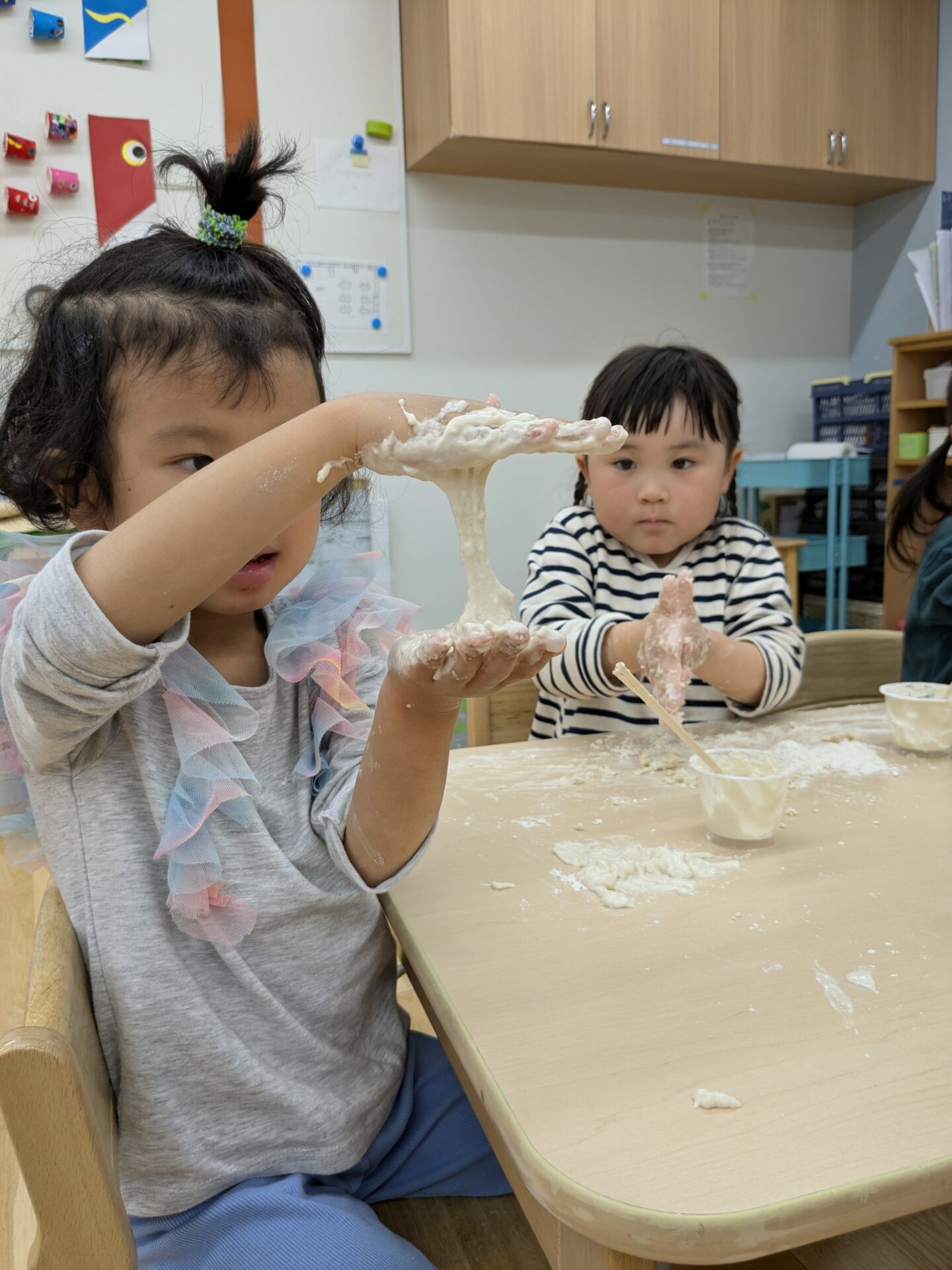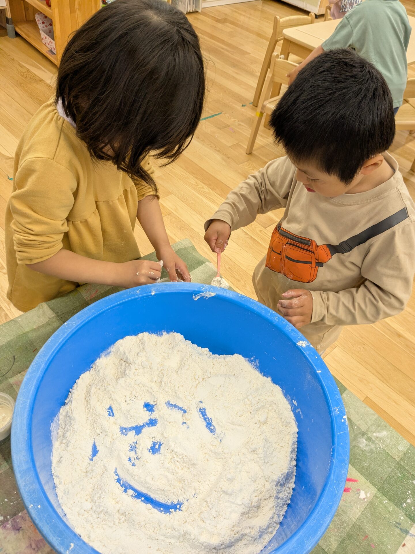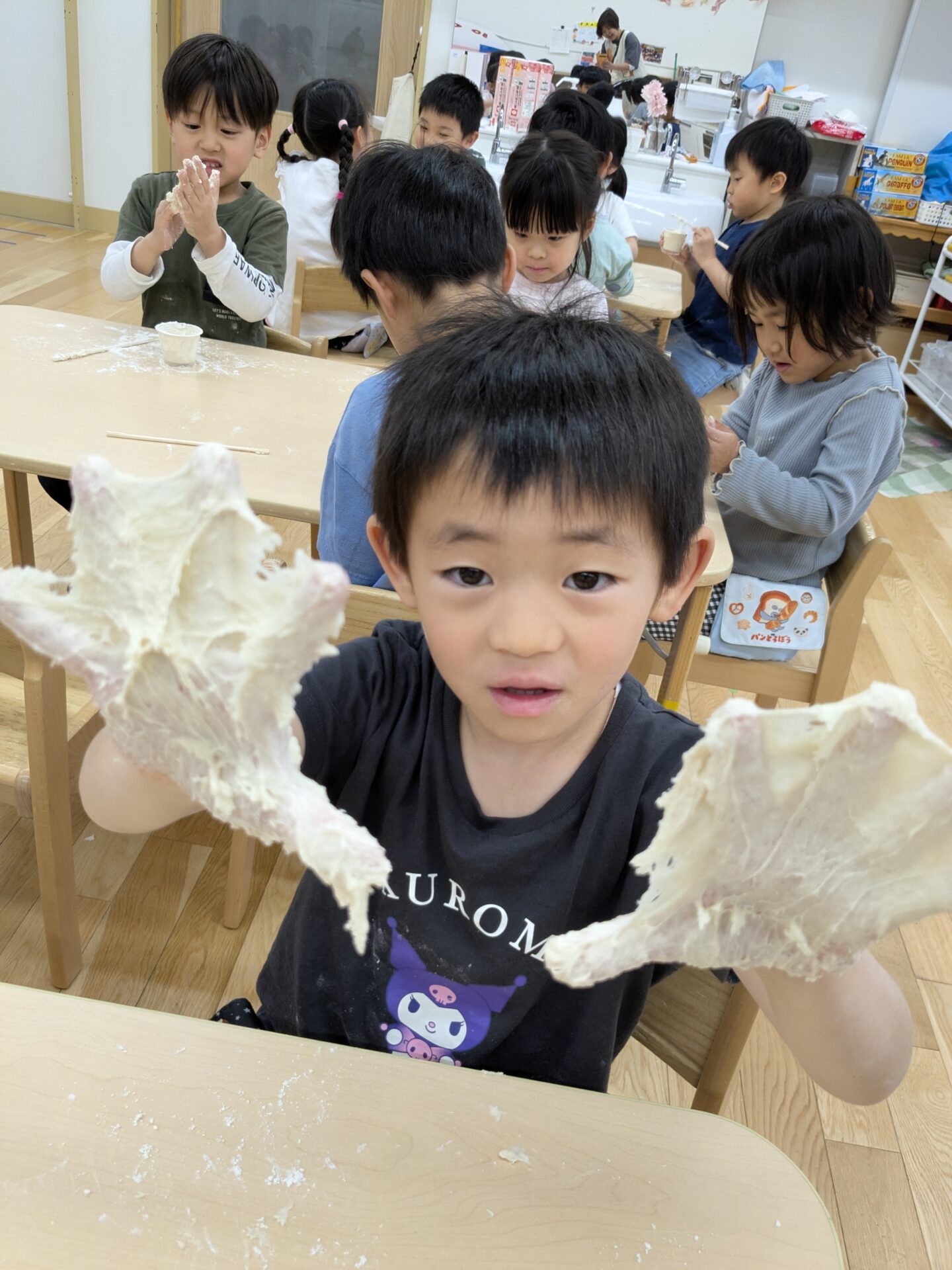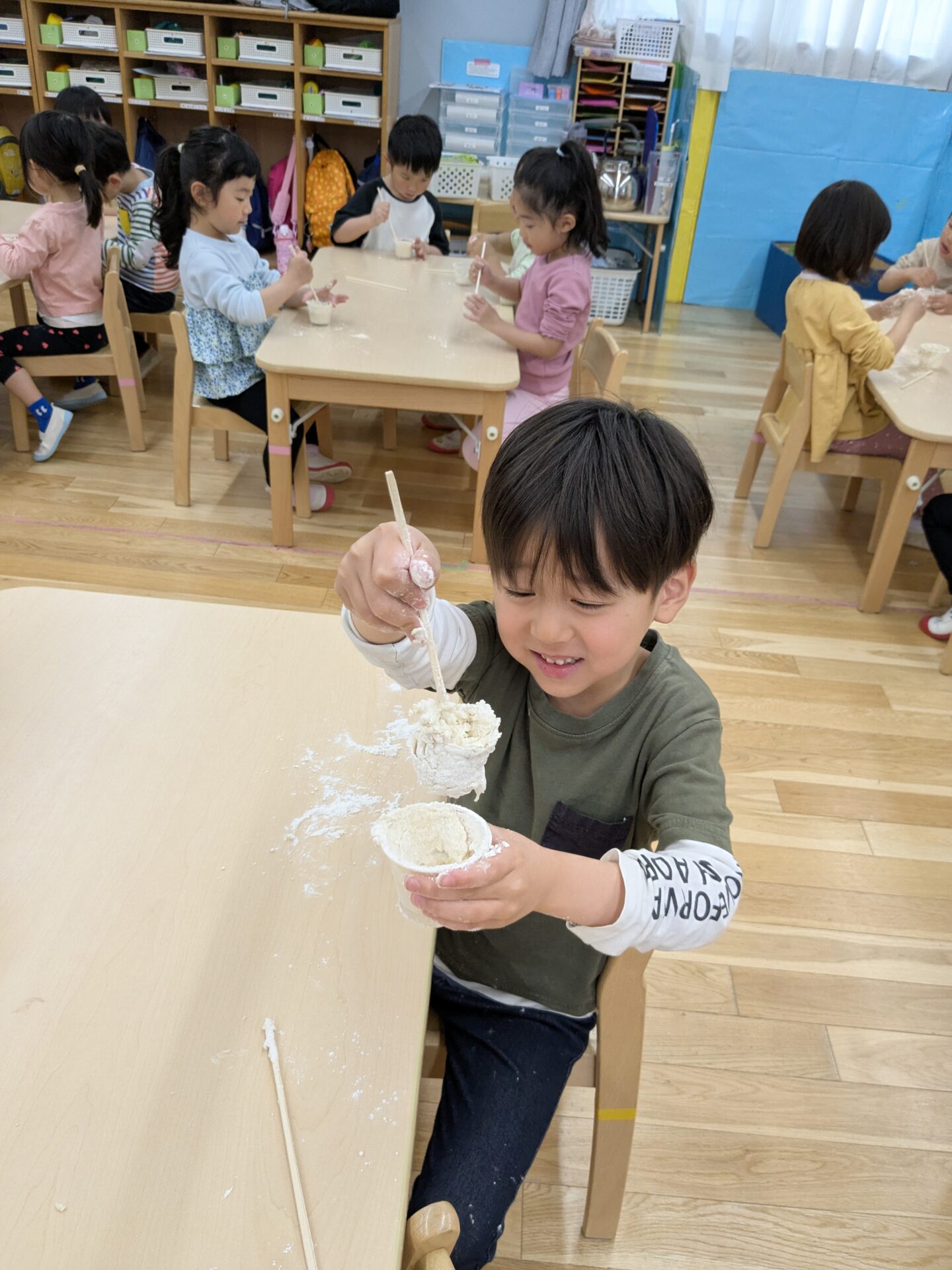 進級して、表情も逞しくなった4.5歳児クラスの子ども達と、『小麦粉粘土』をして楽しみました!