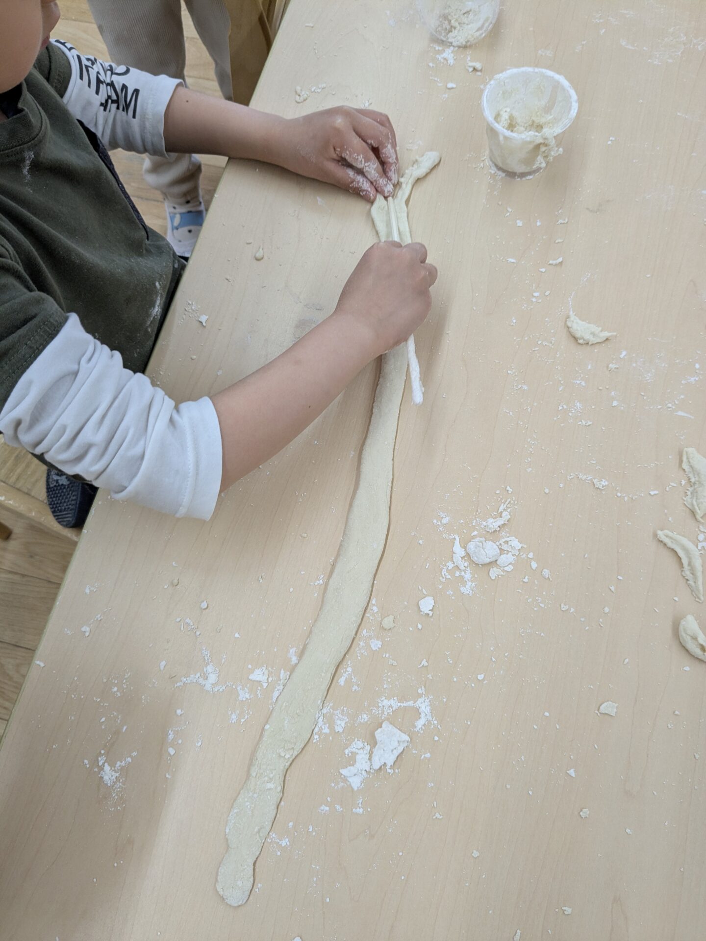 小麦粉が多かったら固くなってくっつかない。水が多かったらべたべたになって手から離れない。と子ども達も発見があり、自分たちで調節して作る姿に、頼もしさを感じました。