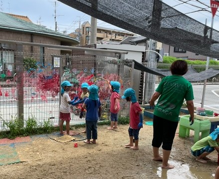 梅雨の晴れ間、朝から「今日は水遊びできるね!」と張り切っている5歳児くじら組の子ども達です。