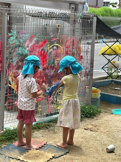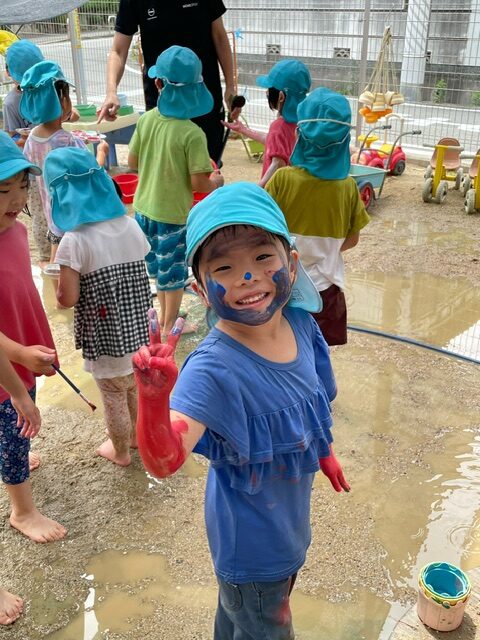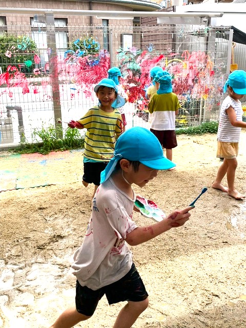 筆や歯ブラシ、思い思いのアイテムでパネルに塗ったり、体に塗ったり楽しんでいました。