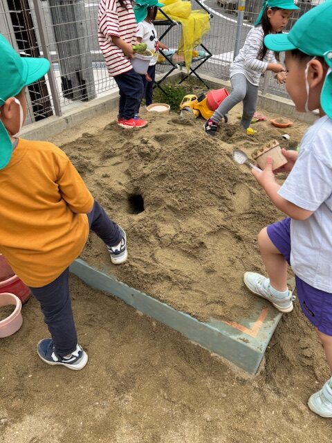 4歳児は、穴を掘って「誰か、届く人~?」と声をかけたり、「反対側誰か掘ってください」