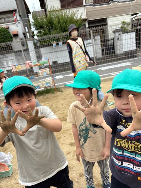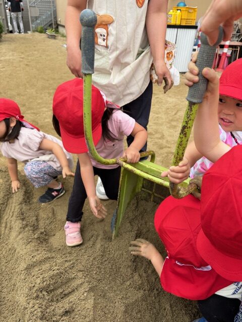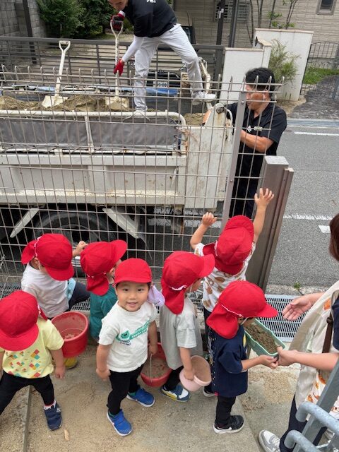 山盛りの砂に、色んな遊びが広がり「楽しいな!」「園長先生、手がこんなになったよ!写真撮って欲しい」と活き活きした表情を見せてくれました。そんな子ども達の姿に、業者の方もとても喜んで帰られました。