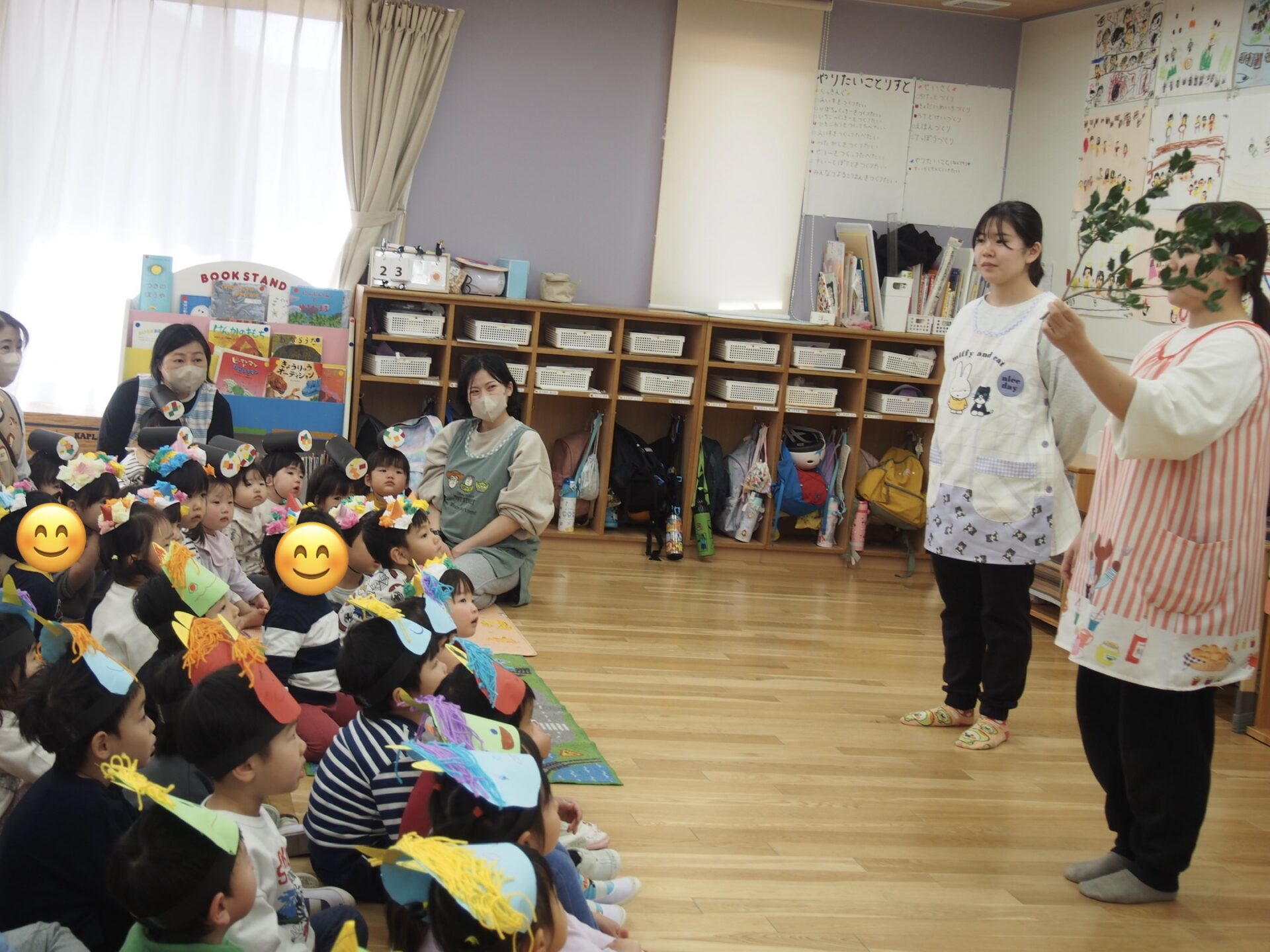 まず最初は、節分に関する絵本「おにはうち!」と言う絵本を読みました。