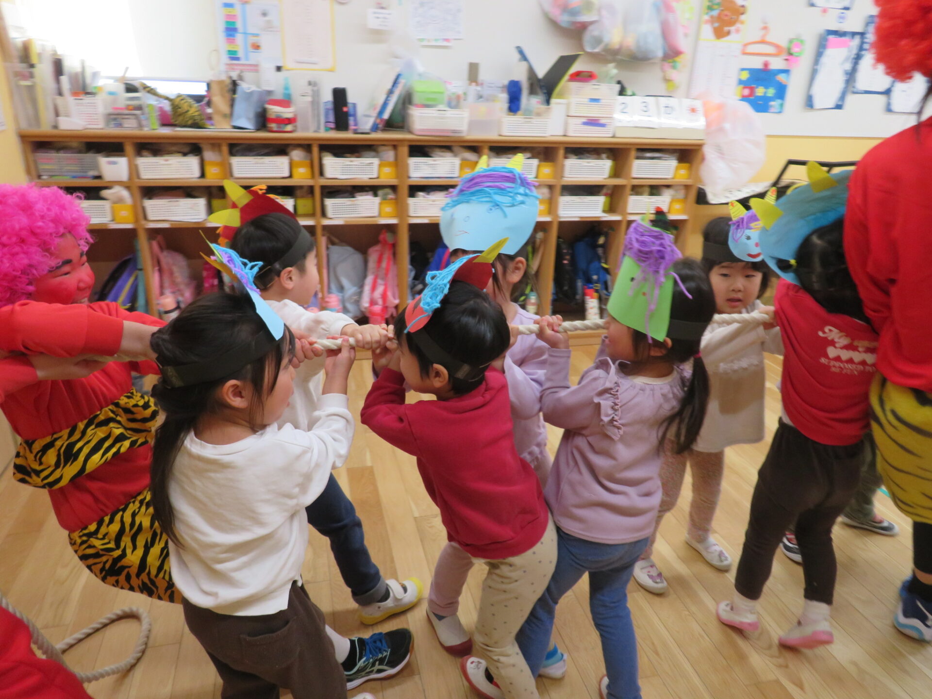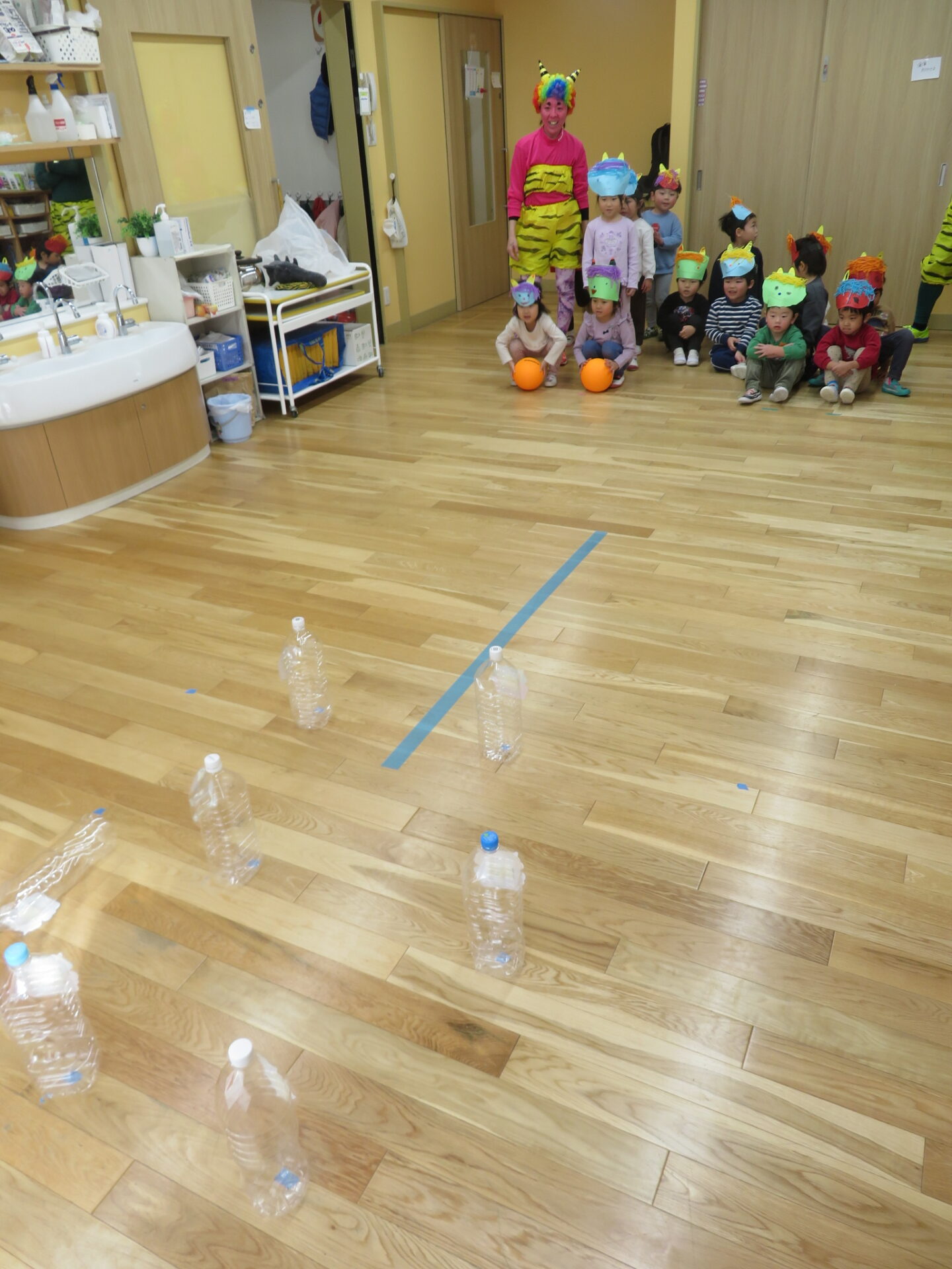 幼児クラス(にじ組、そら組、くじら組)は鬼さんと綱引き対決やボーリングをしました。