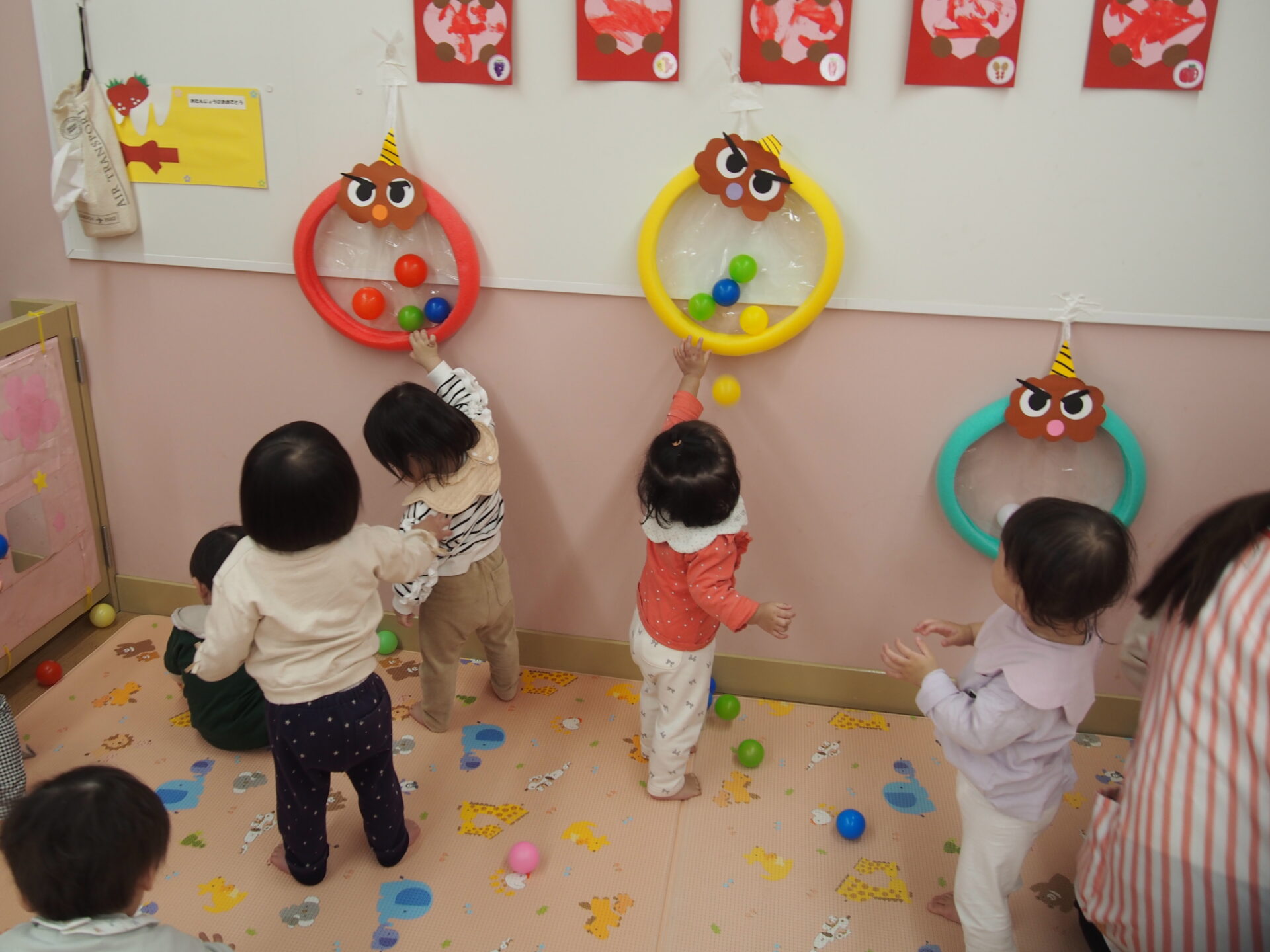 乳児クラス(うみ組、だいち組、あめ組)のお友だちは鬼さん口にボールを貼って剥がすゲームをしました。