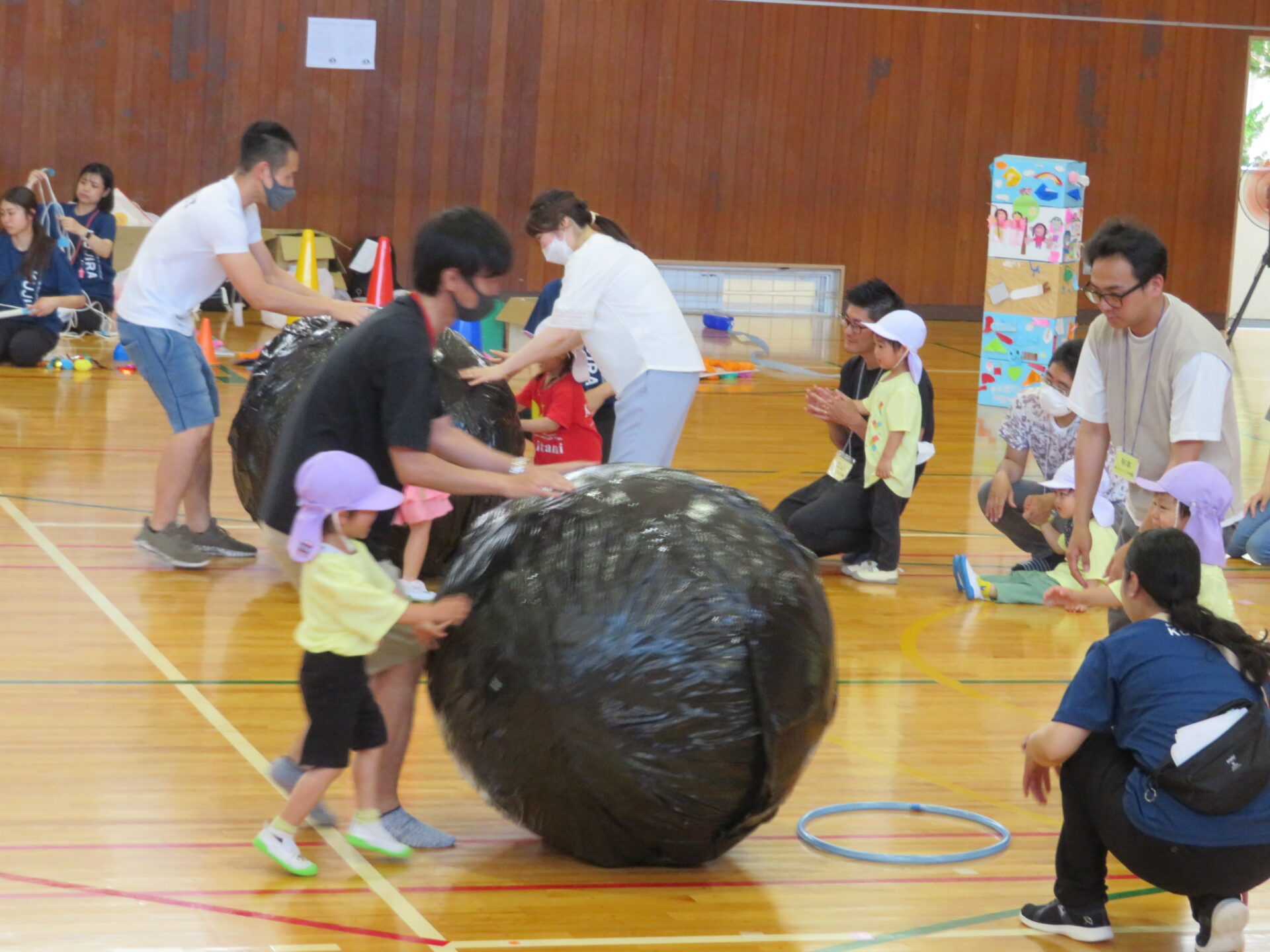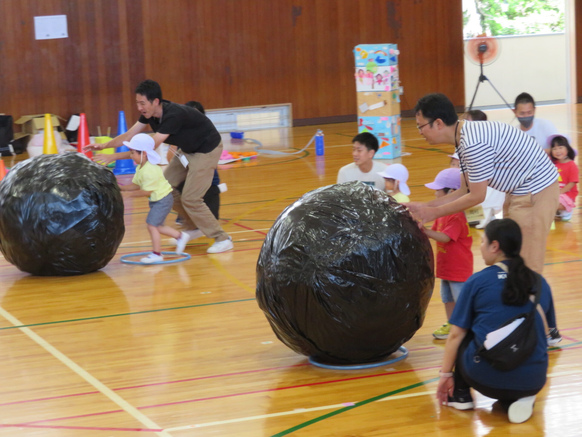 お父さんお母さんと協力して、大きなダンゴムシを転がして競争しました♬