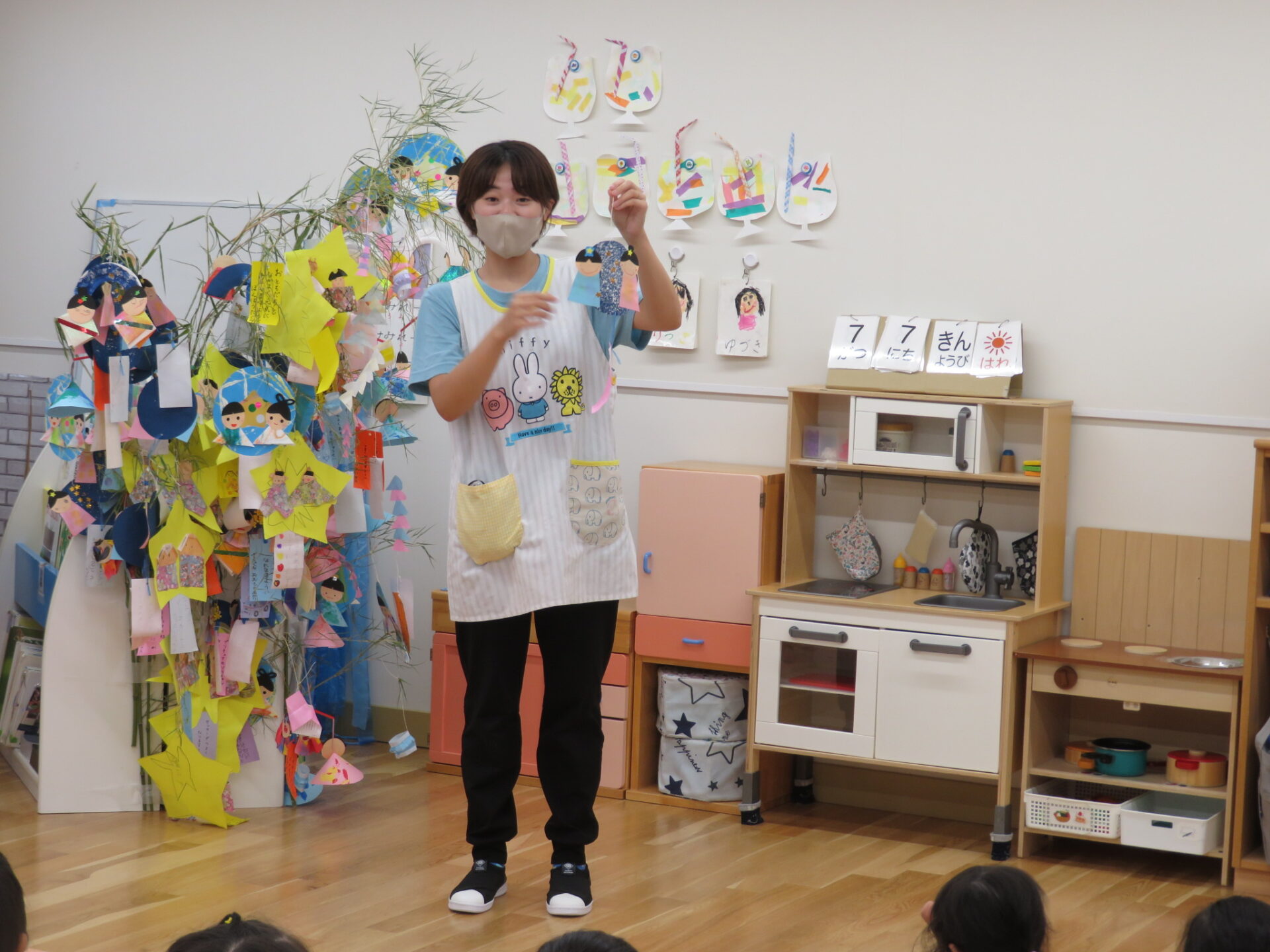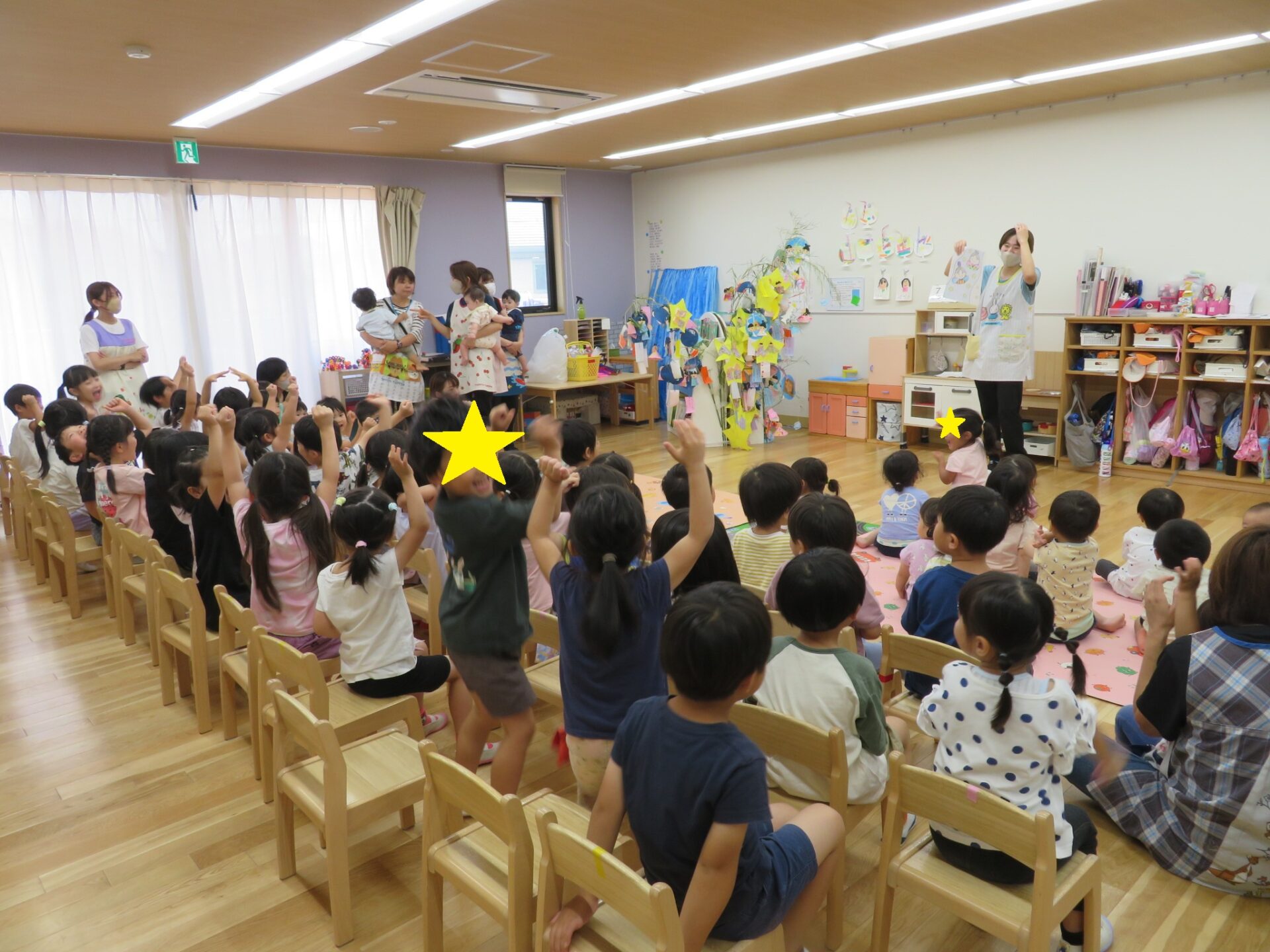 保育士の出し物では、七夕の由来にちなんだ劇や〇✕クイズが行われ、「彦星様のお仕事はお医者さんである。〇か✕か!?」と聞かれれると「バツー!」「絶対バツー!!!」と大興奮の子ども達!!