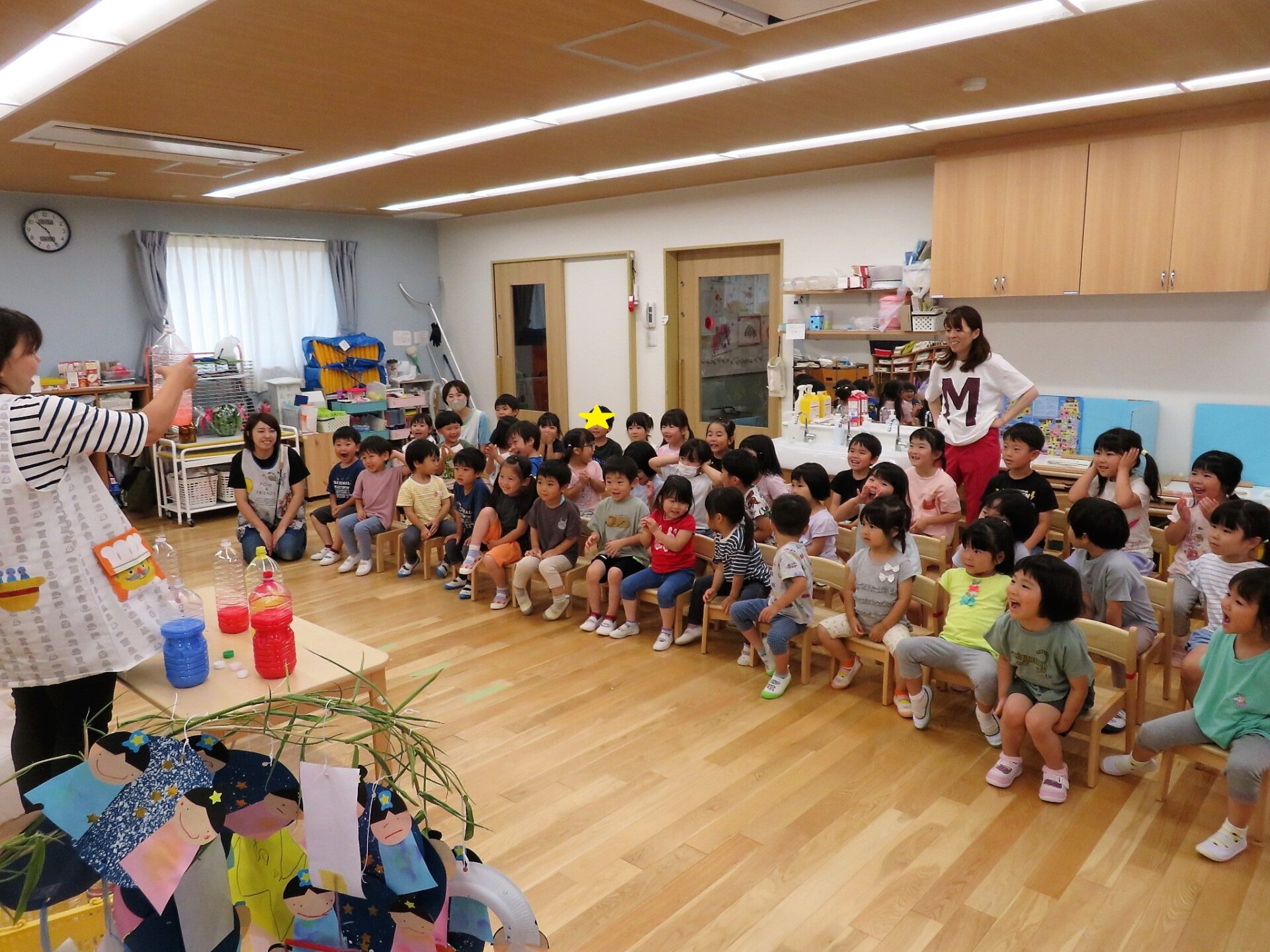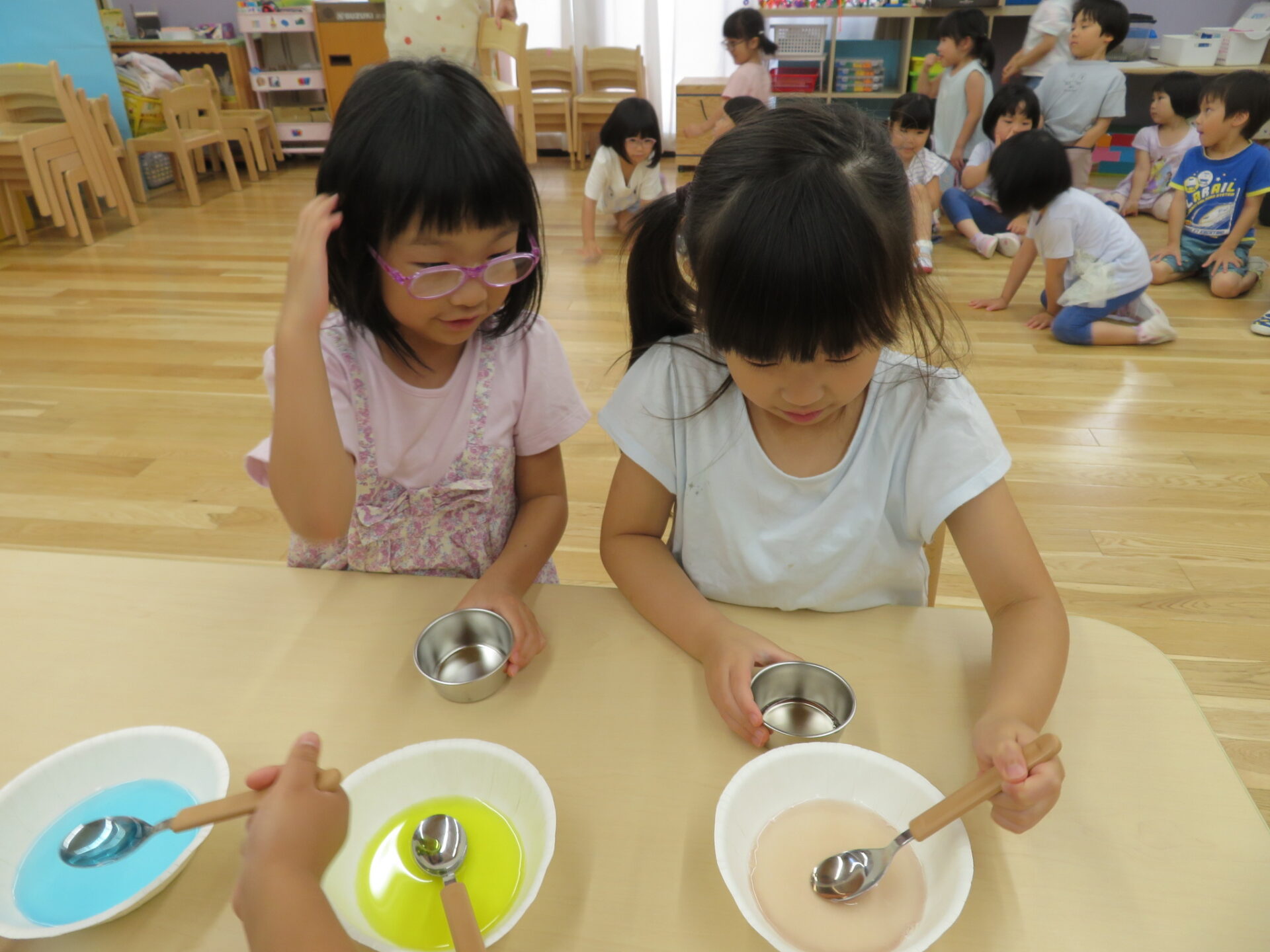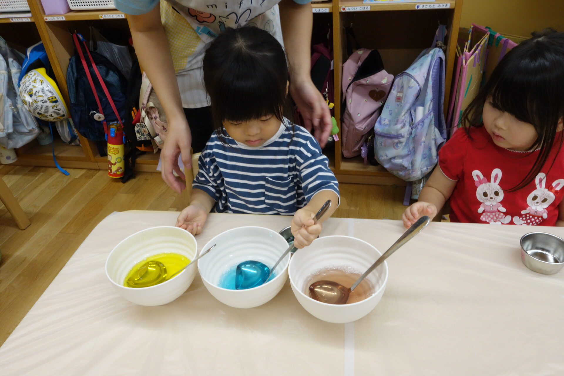 「青と赤を混ぜたら色変わるんだよね♬」「ぼくは〇〇色が好きだけど作れるかな~」
