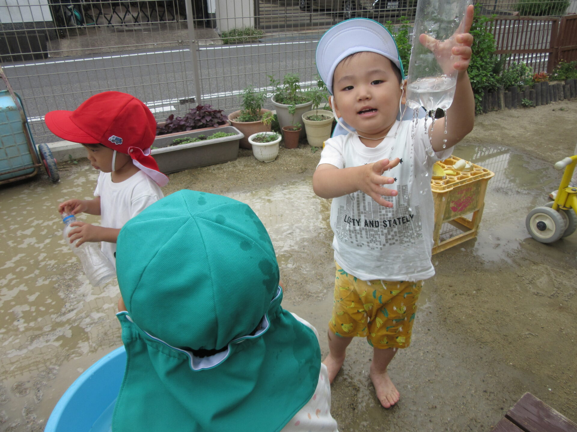 なかにはペットボトルの水を保育者にかけて追いかけてみたり、かけられないように逃げてみたりと元気いっぱいでした。
