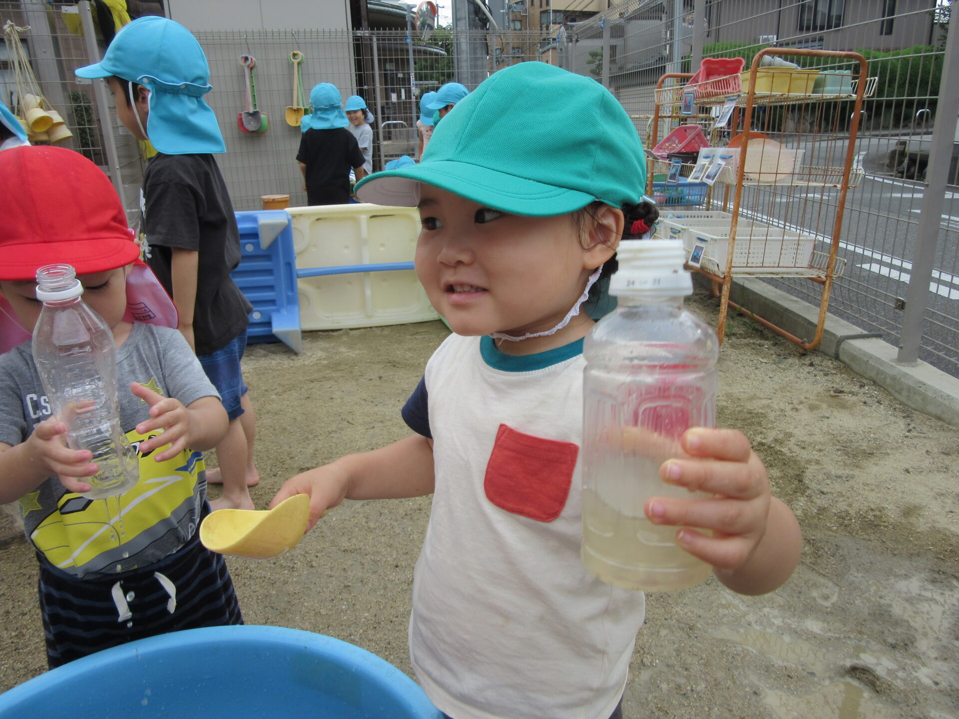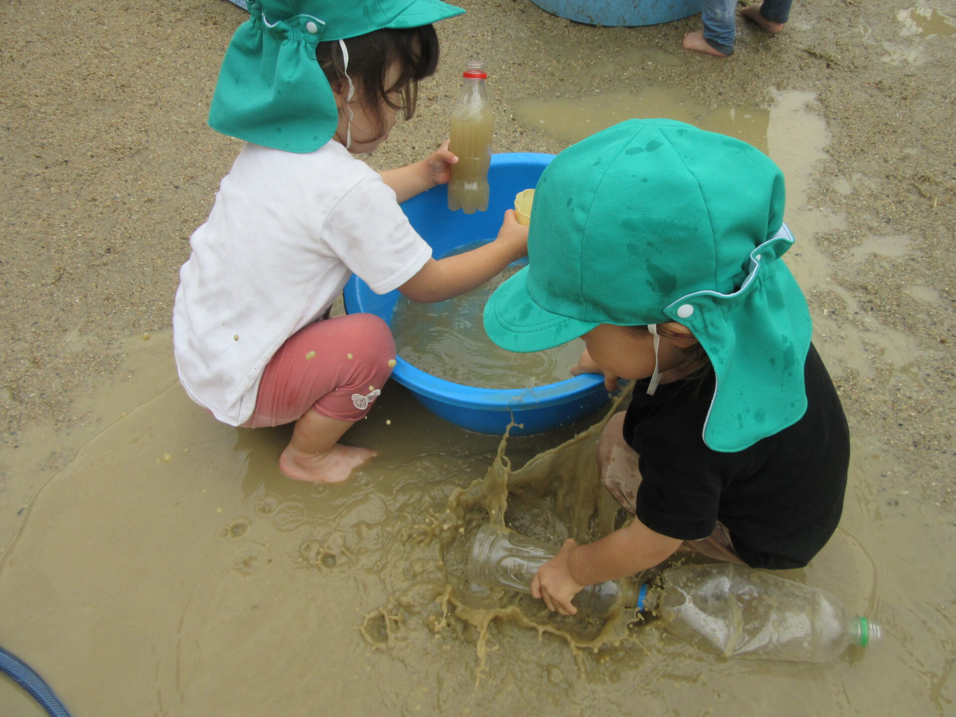 大きなバケツにペットボトルを沈めて浮かせてみたり、泥水をスコップやカップでたくさん水を入れてみたりと自分たちで様々な工夫をして遊んでいました。
