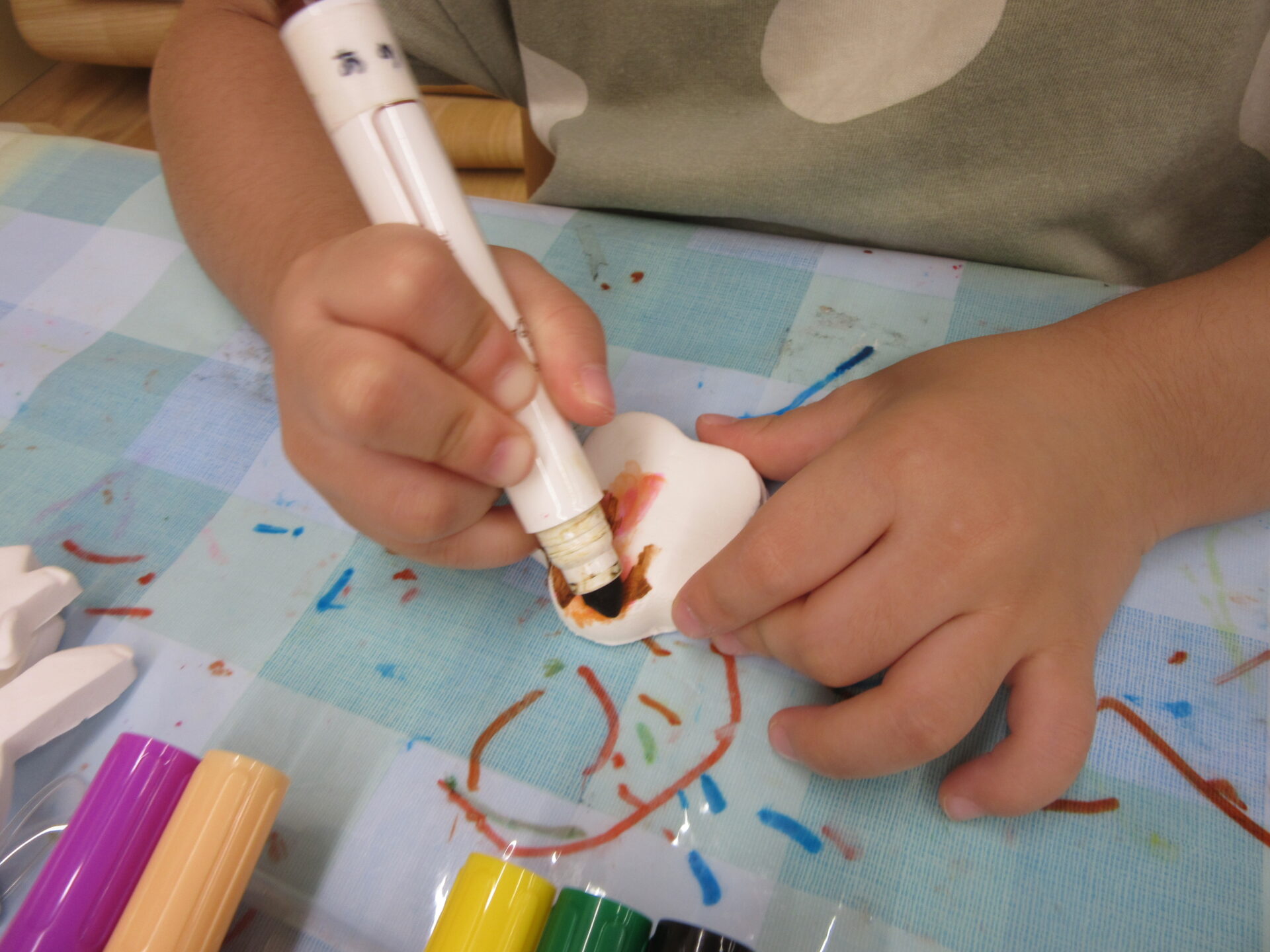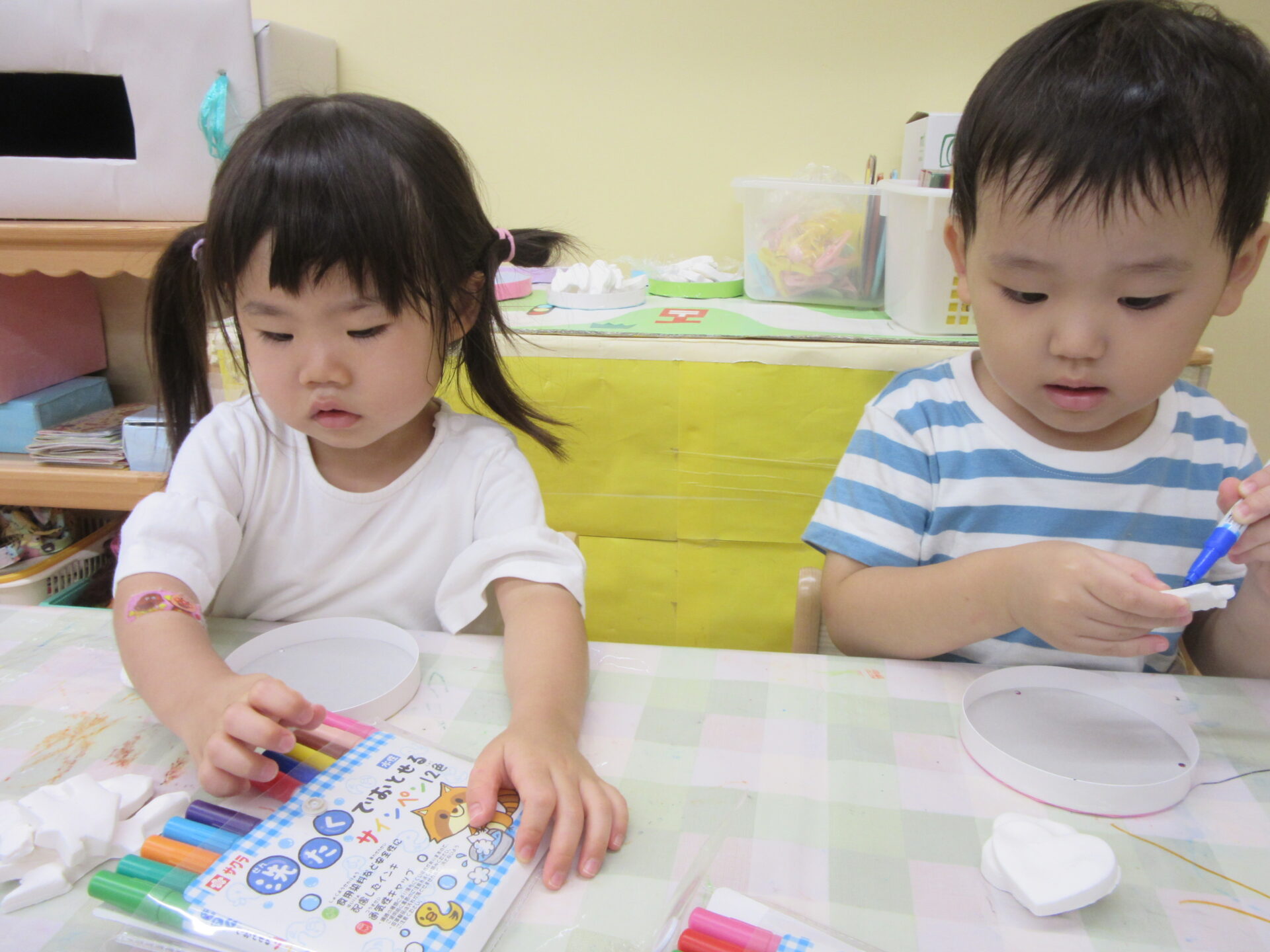 「なにいろにしよ!」「かわいいのつくる~!」と真剣な表情で塗っています。