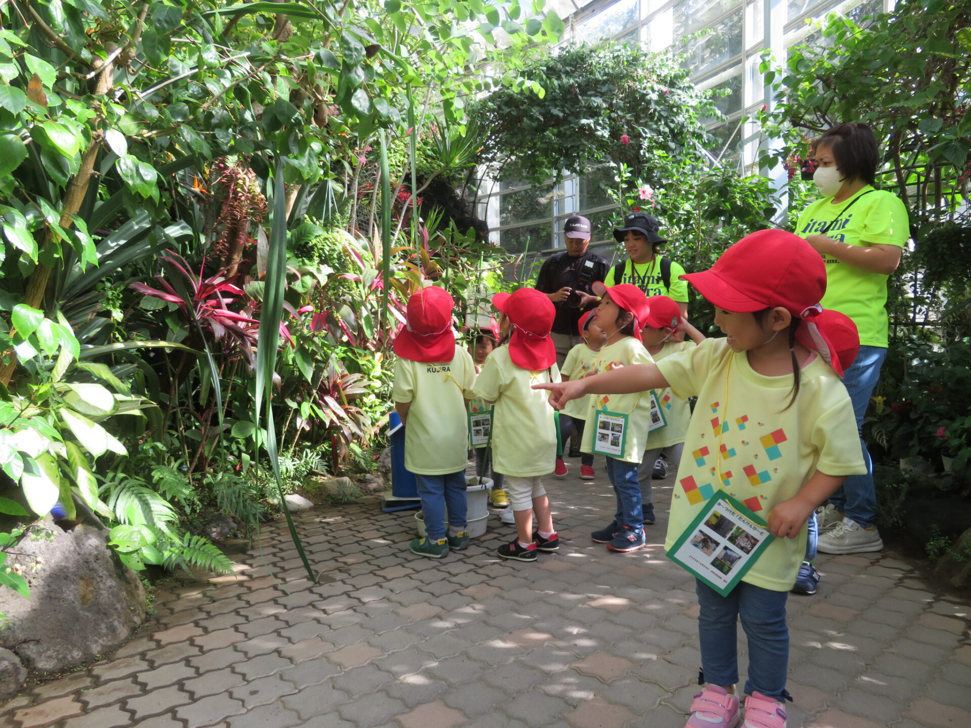 昆虫館に到着。昆虫館が見えてくると「行ったことある‼︎」「わー‼︎」といい反応を見せ、まずは蝶の温室に行きました。お部屋で育てていたアゲハチョウ以外にも珍しい様々な蝶を近くで見ることができ大興奮✨四方八方に蝶が居たので上下右左見るのに大忙しの子ども達でした。すると奇跡が起こり、、なんと子どもの赤い帽子に黒くて綺麗な蝶が止まったのです。貴重な体験となりました♪