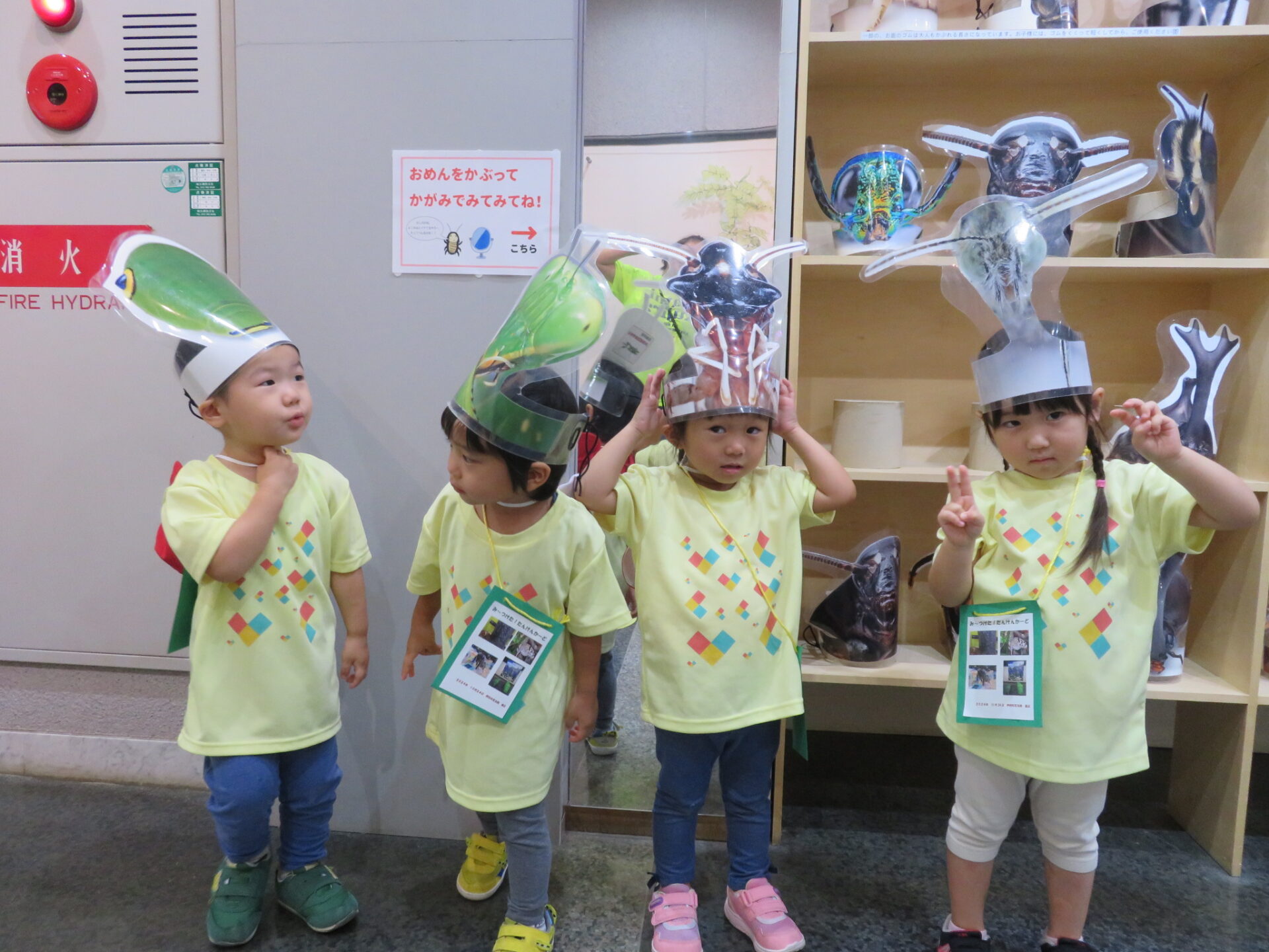 「ハイ、ポーズ」好きな昆虫の仮面を被って、記念写真も撮りました。