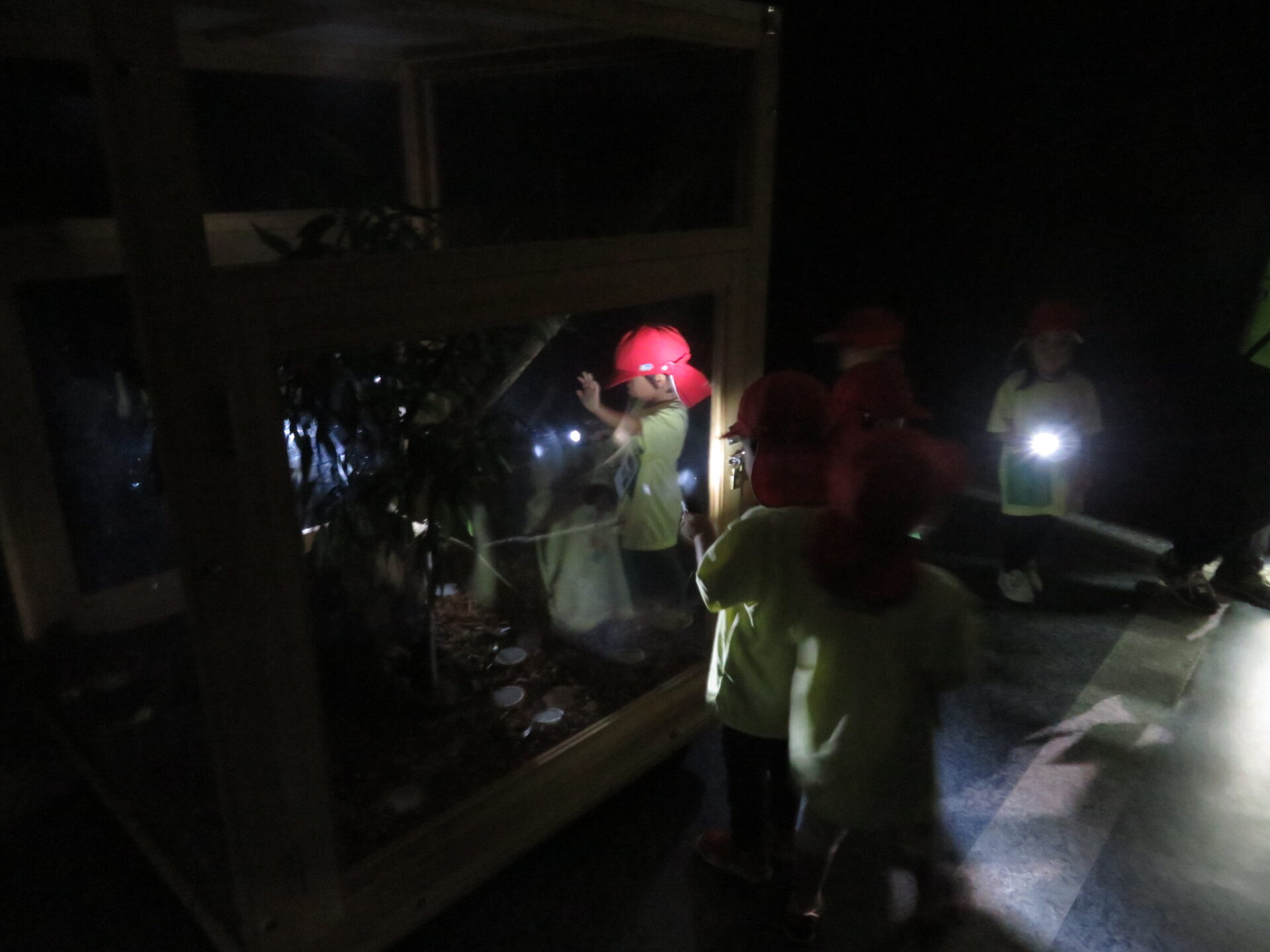 この暗闇では懐中電灯の光を照らすと、カブトムシが見えるのです。