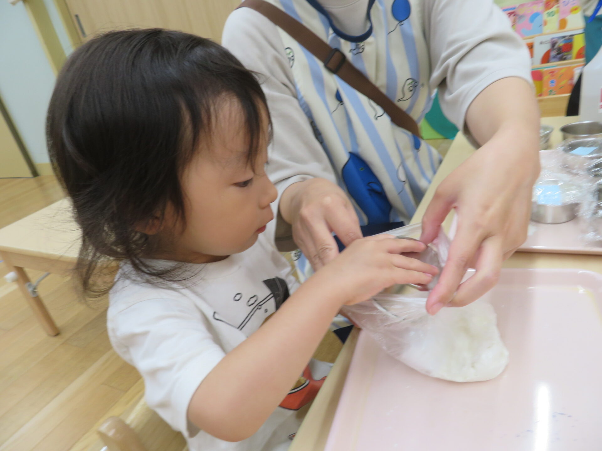 すると、、クッキーの生地が完成。袋から出してまずは匂いを確かめま「いい匂い〜♪」と嬉しそうな表情が見られました。甘くていい匂いがふんわりあめ組の部屋に広がっていきました。