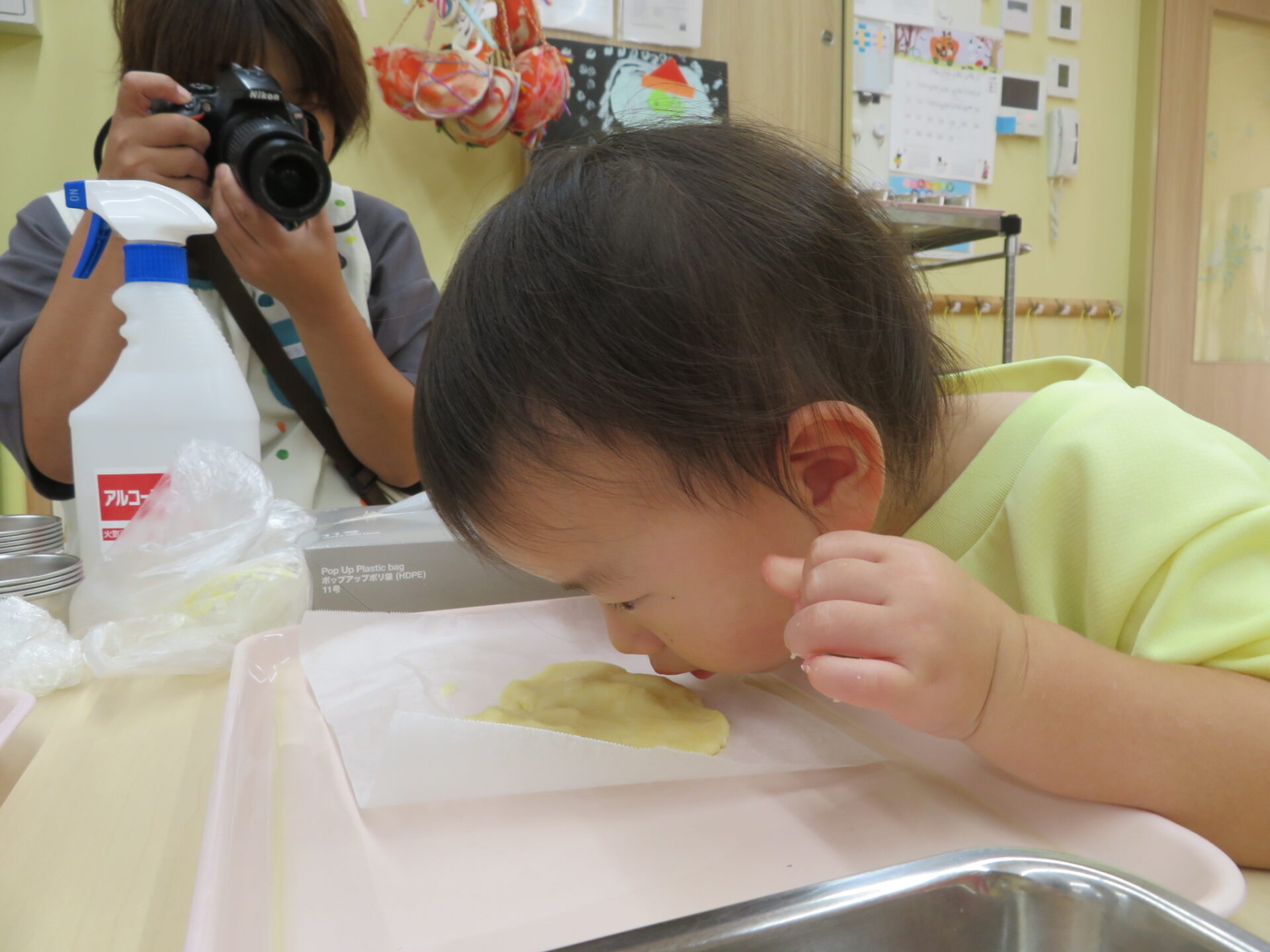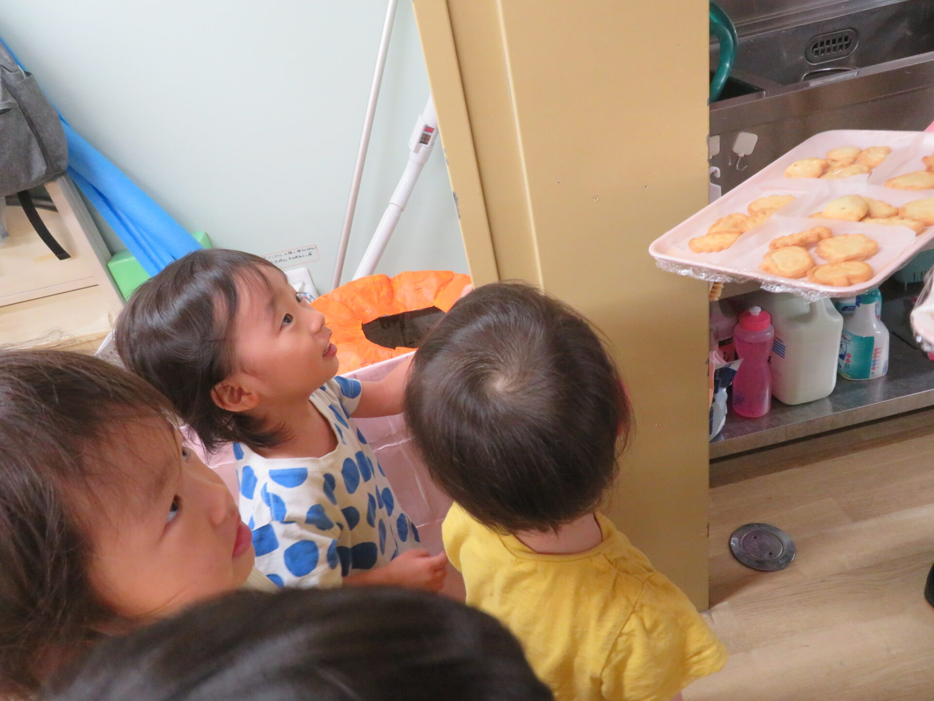 クッキーの焼き上がりはおやつの時間。お昼寝からいつもより素早く起きてみんなで甘〜い、いい匂いがする給食室まで取りに行きました。