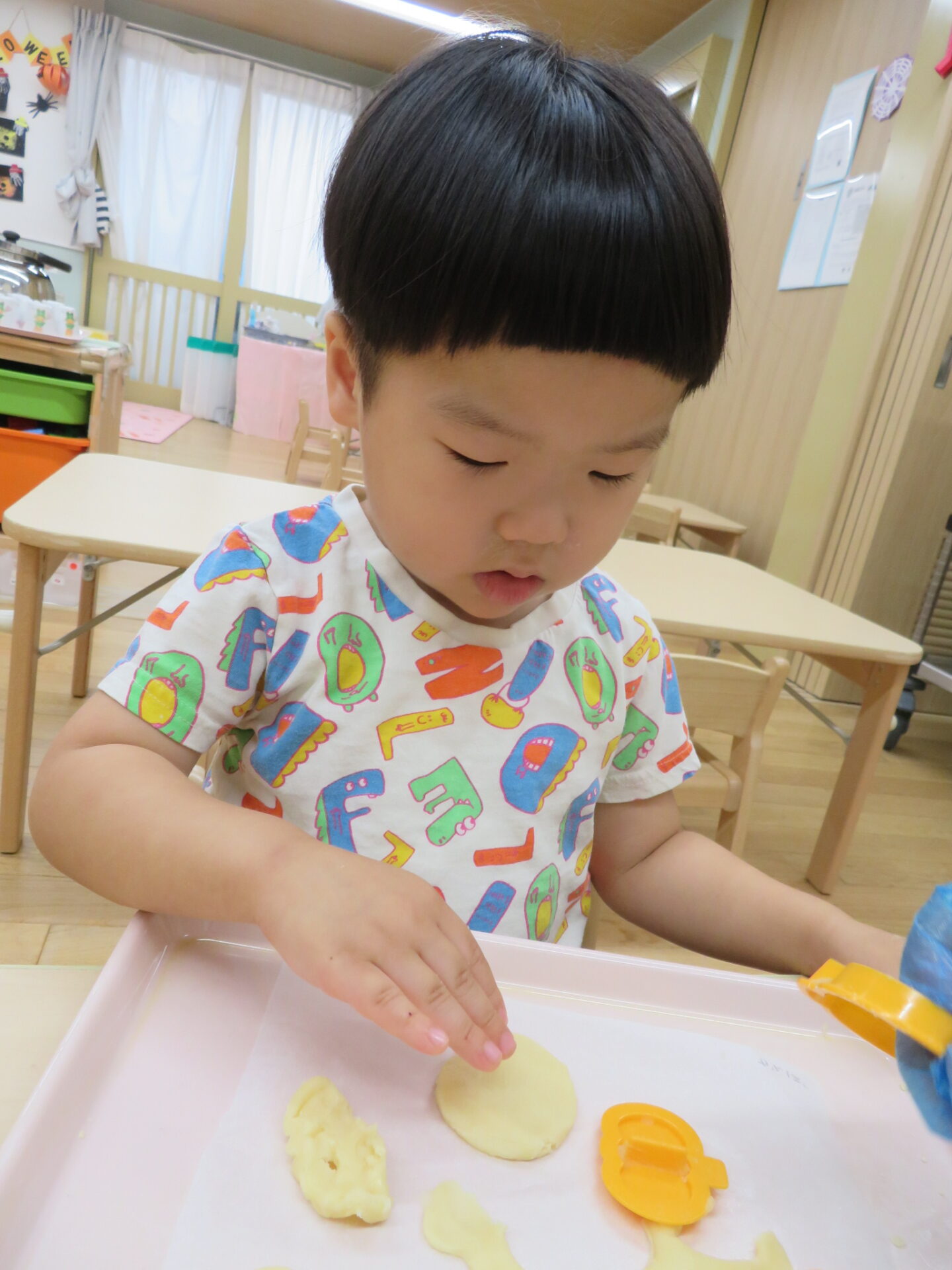 絵本で見ていた親しみのある型に「〇〇‼︎」「かわいい」などと思い思いに口にしながらクッキー作りを楽しみました。