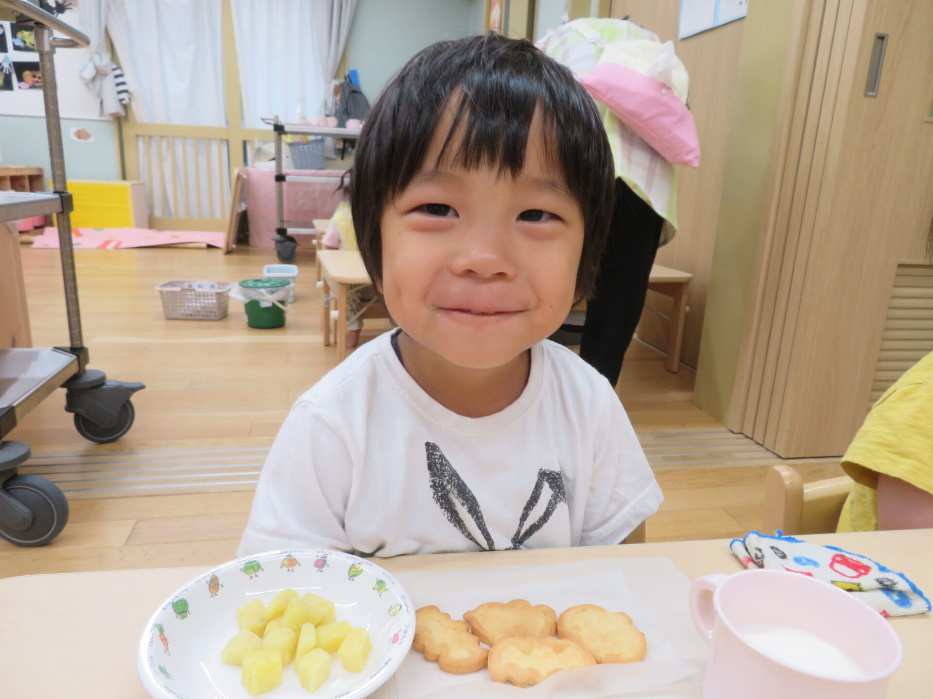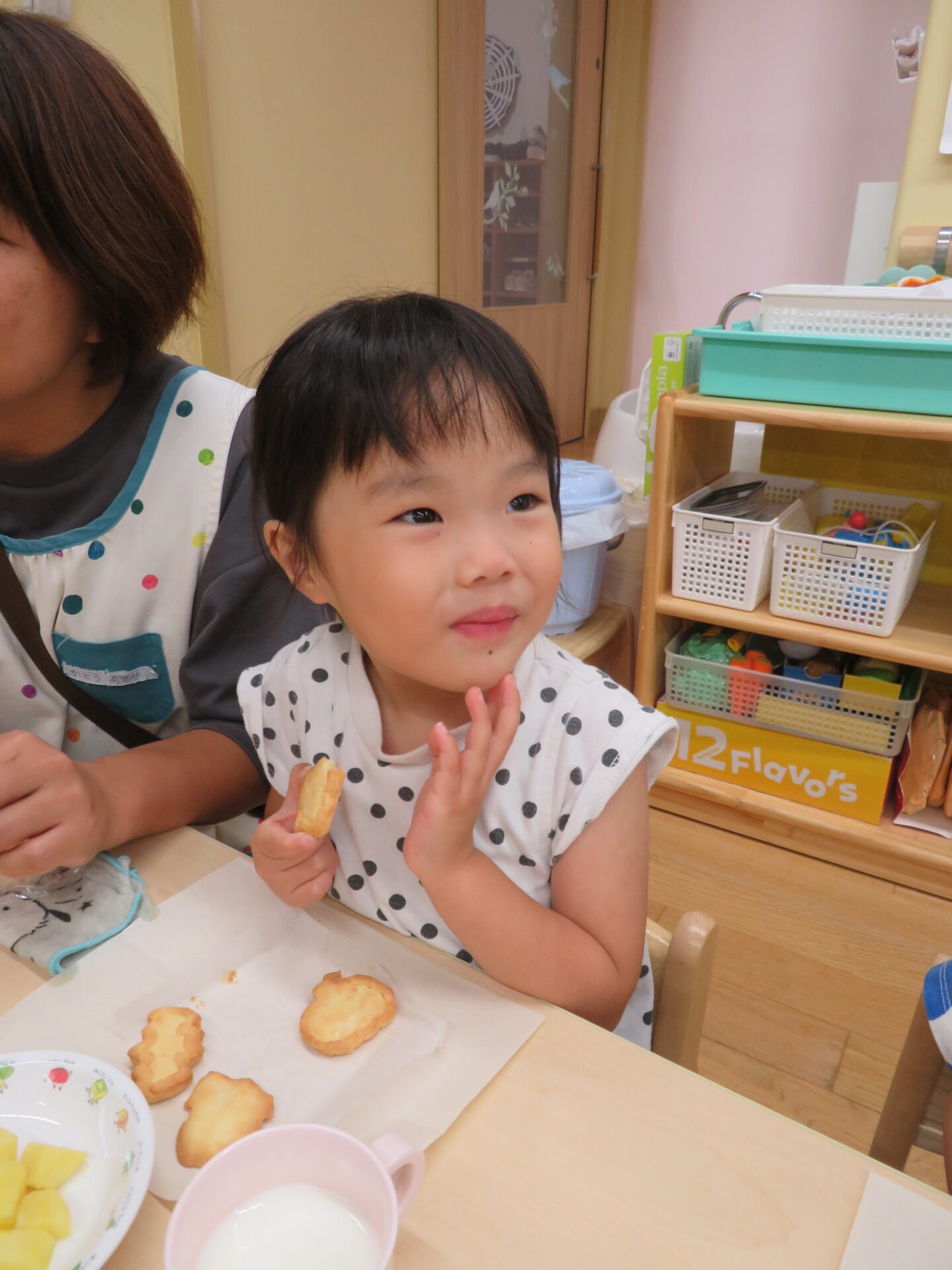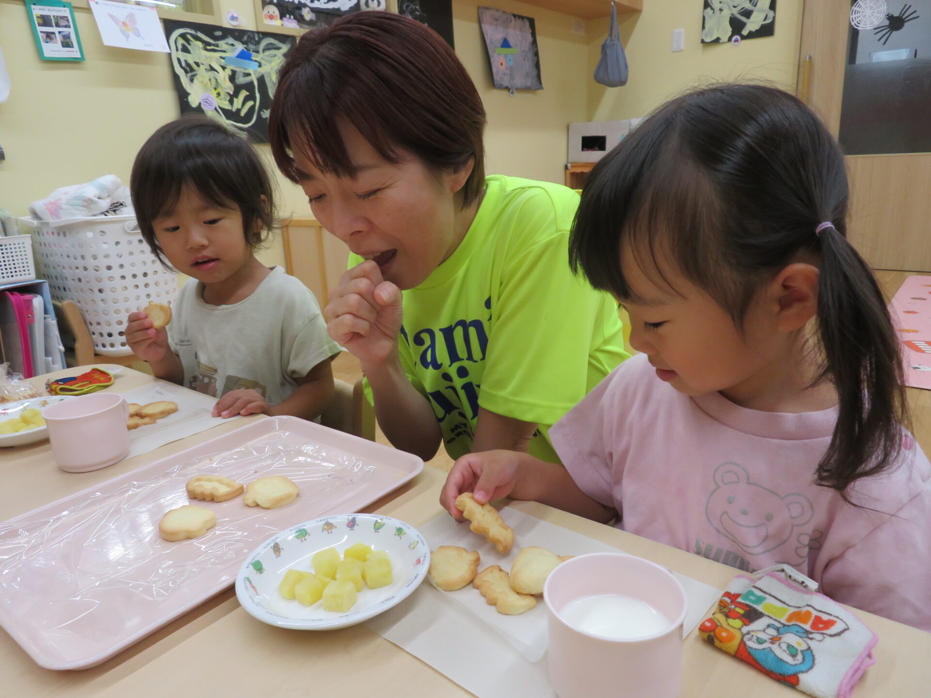 牛乳がよく合う美味しいクッキーに「美味しい」「これ作ってん」「先生も美味しい?」などと喜ぶ子どもの声がたくさん聞こえてきた、素敵なおやつの時間となりました。