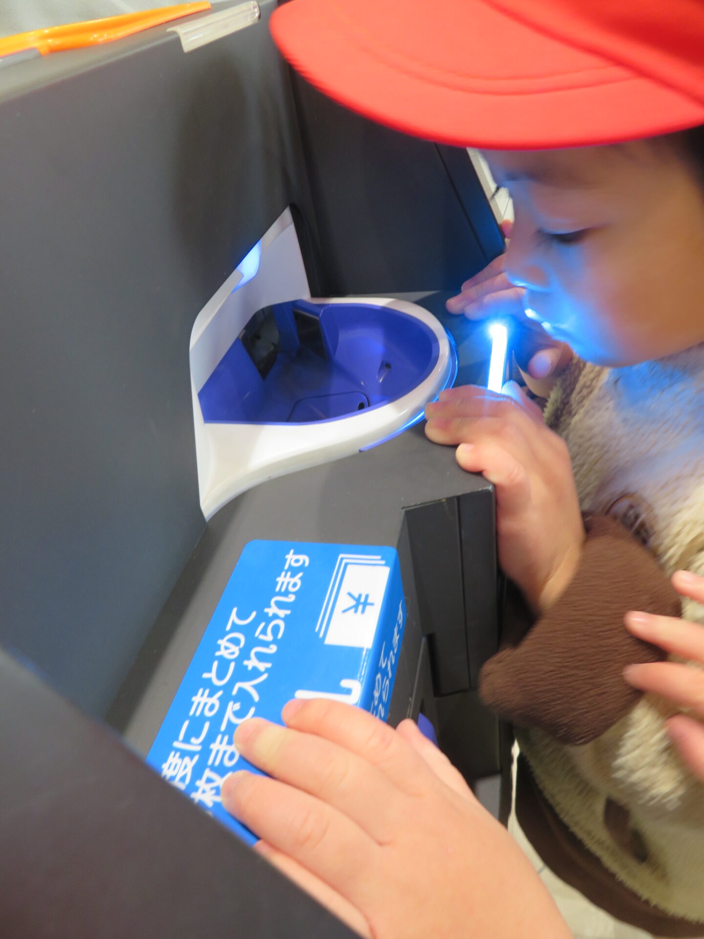 機械なので位置が高く、一生懸命手を伸ばして入れてくれました。