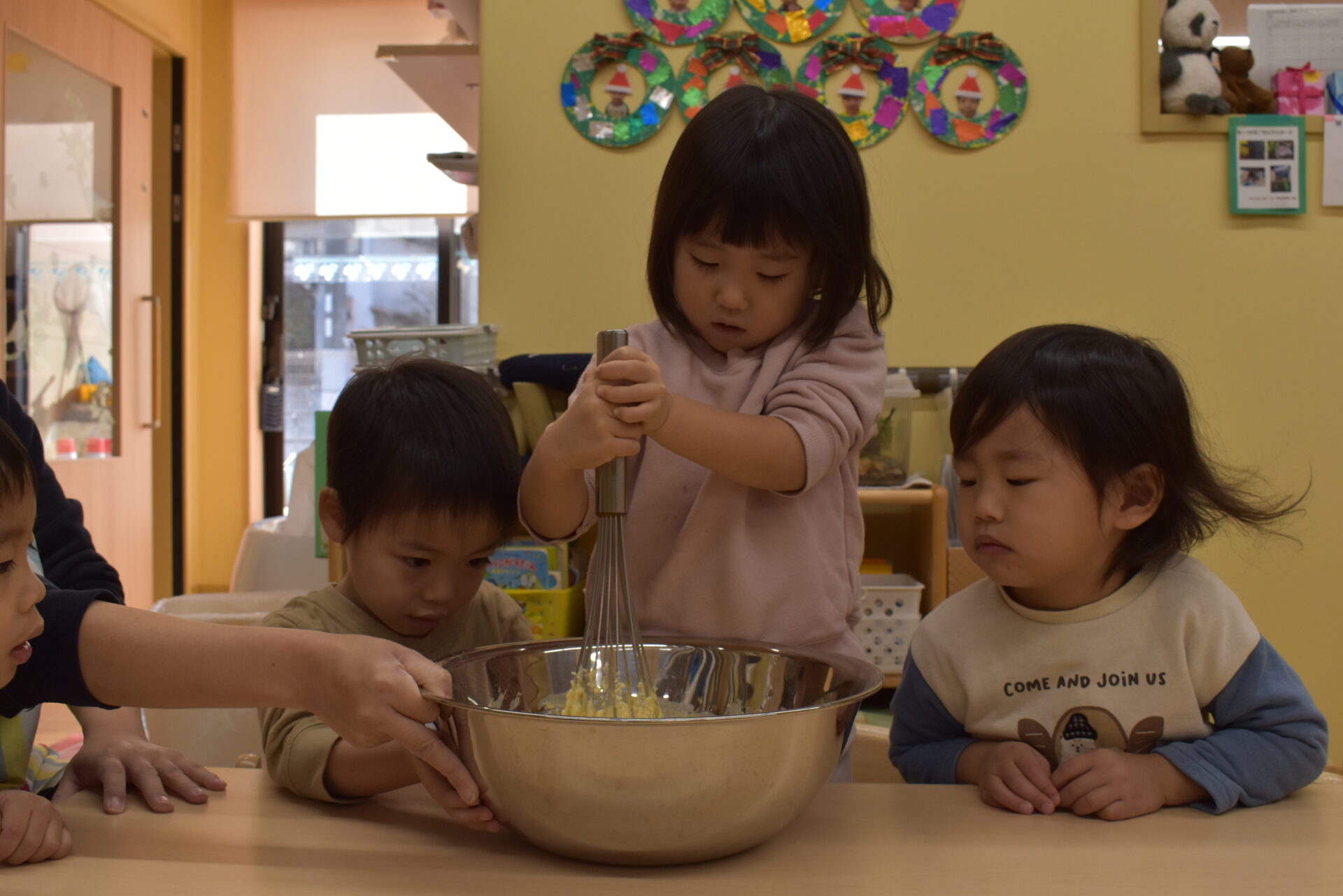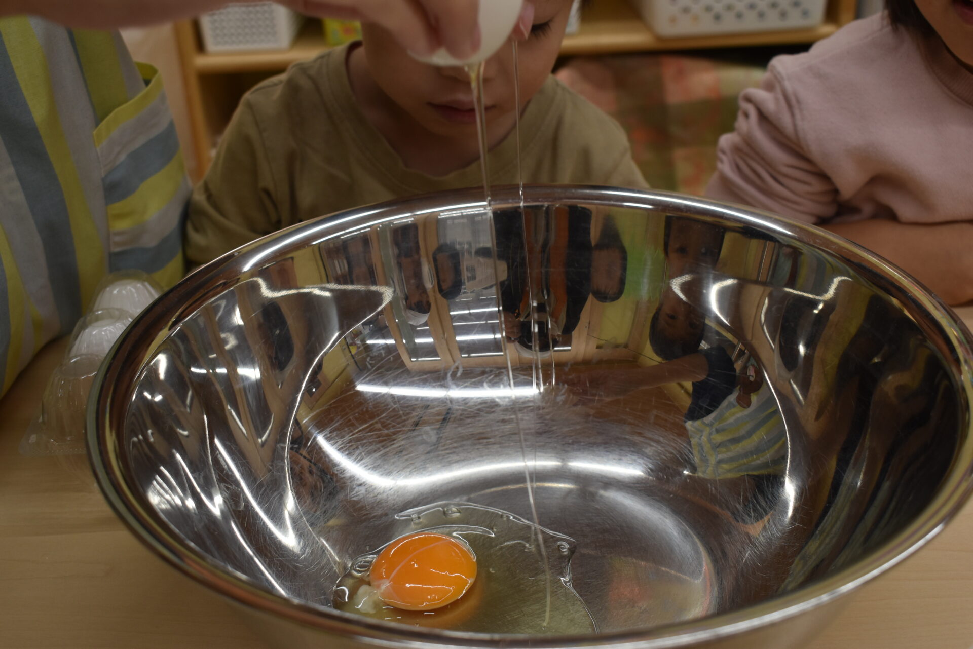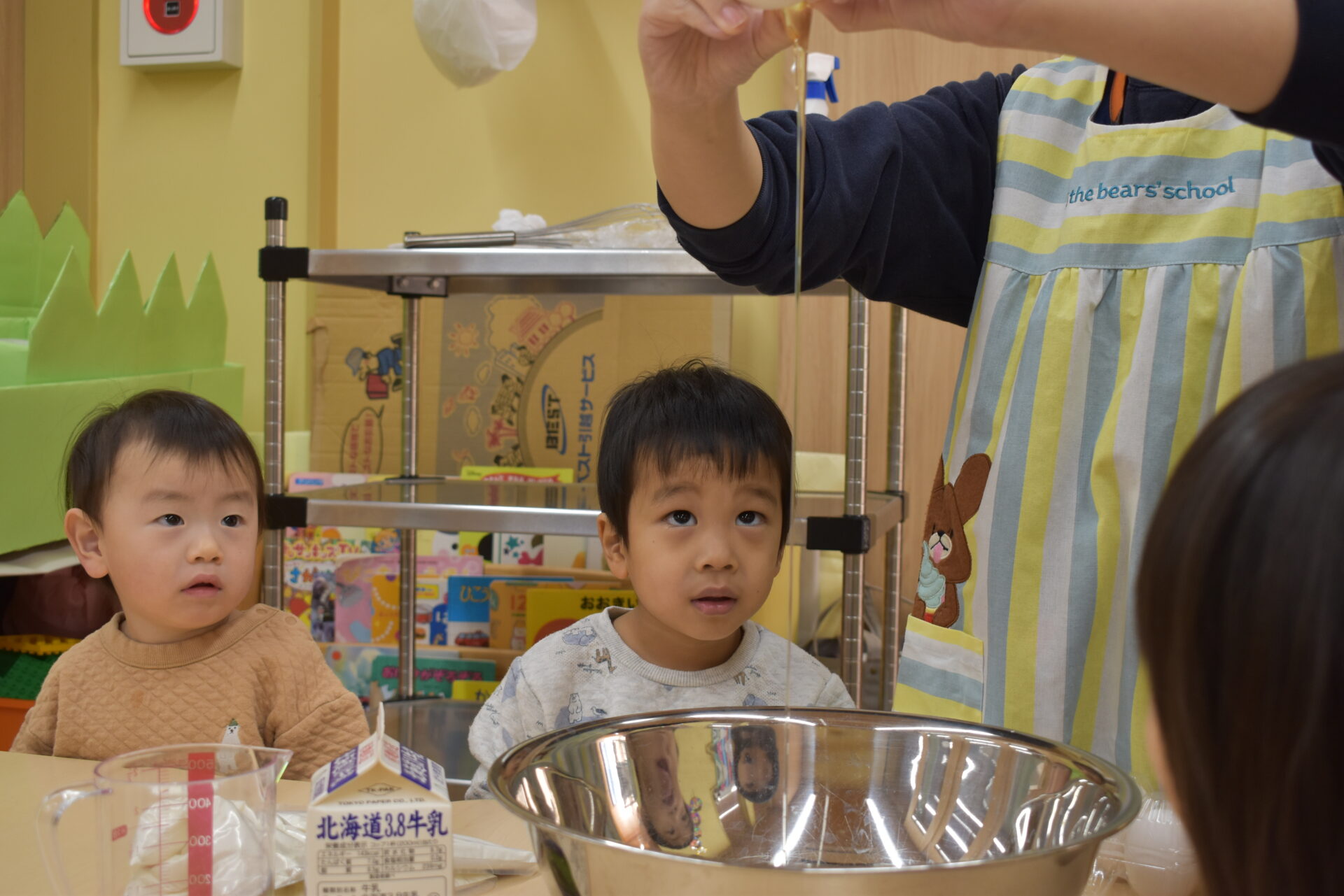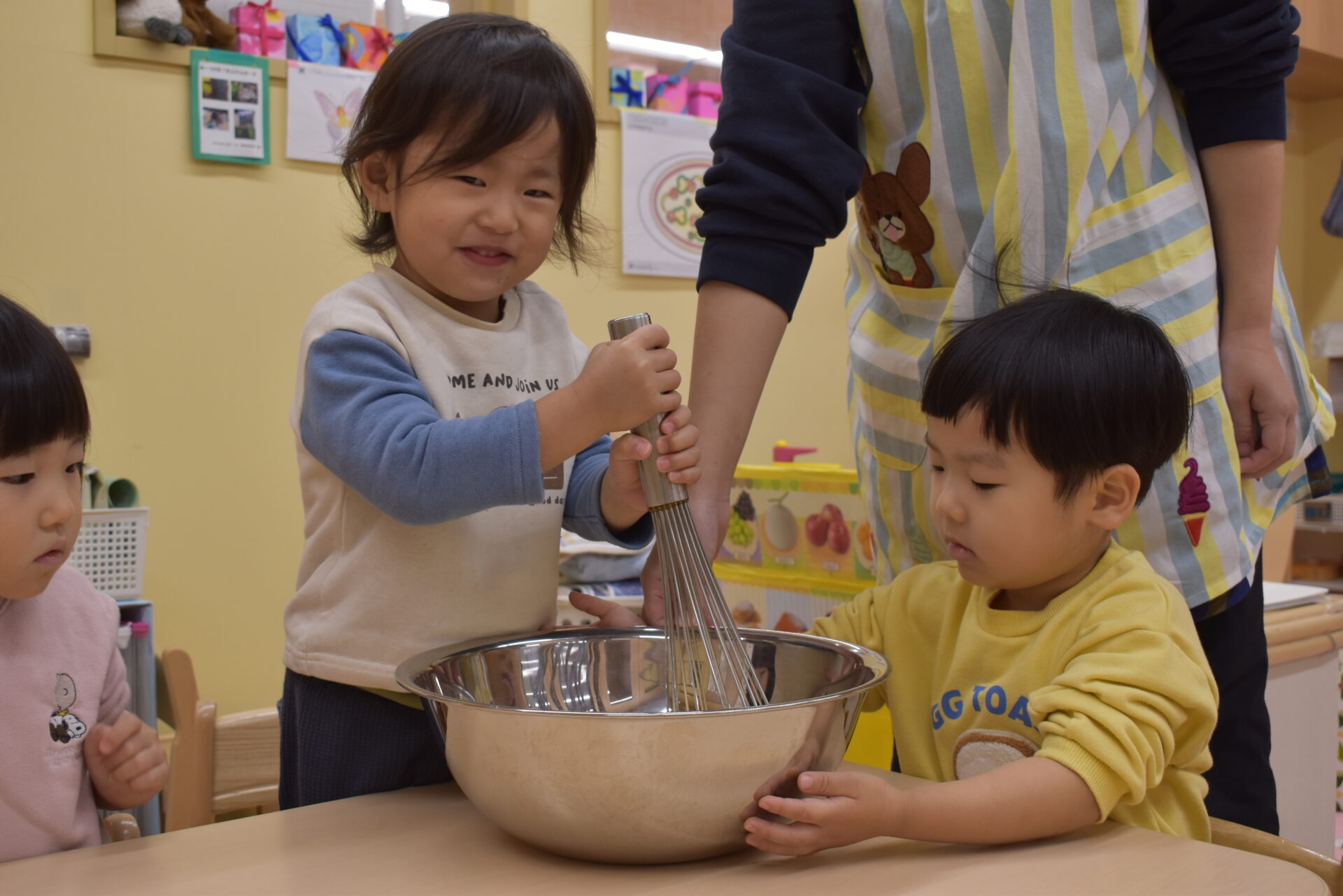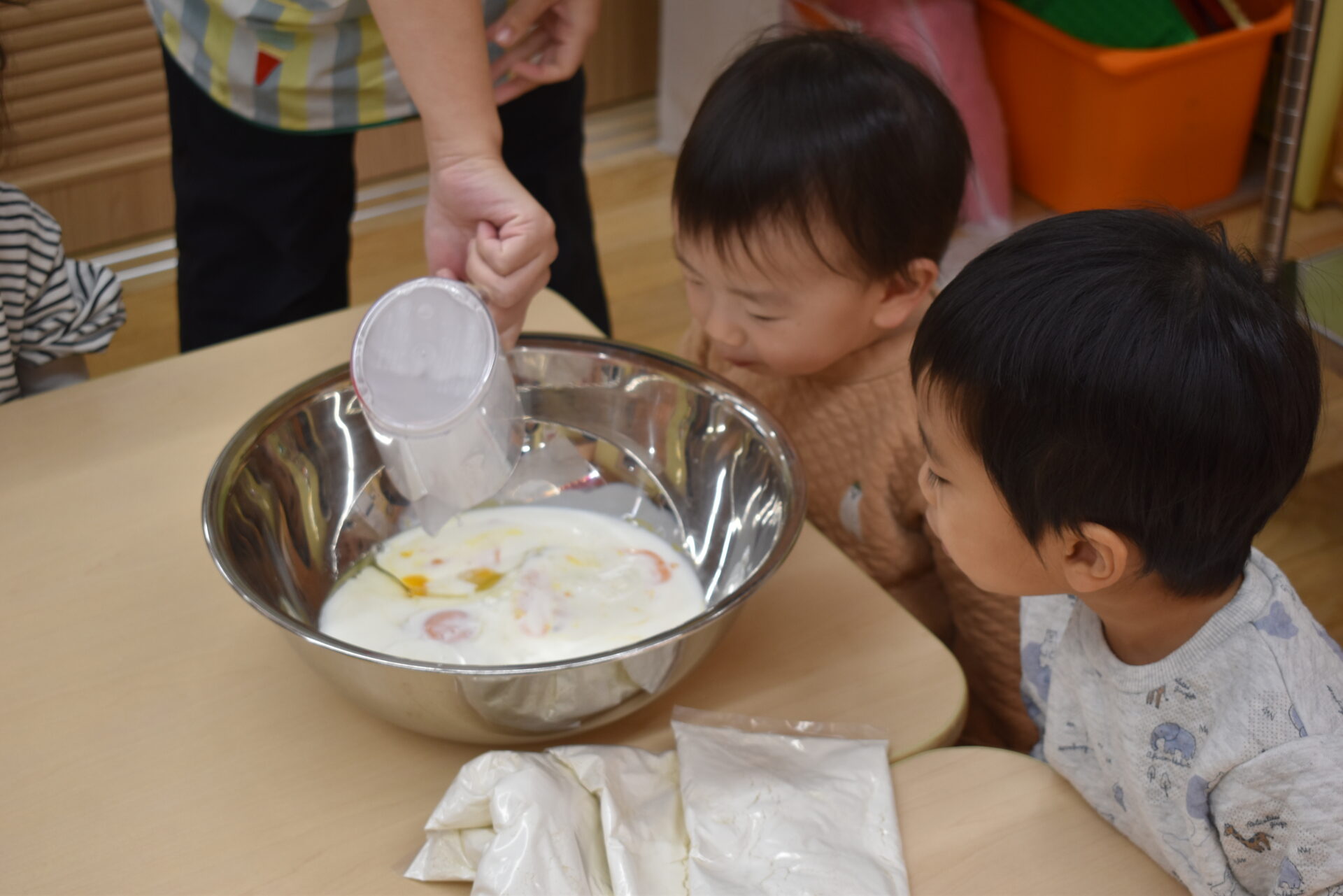 大きなボウルも動かないように、お友だちに支えてもらいます。