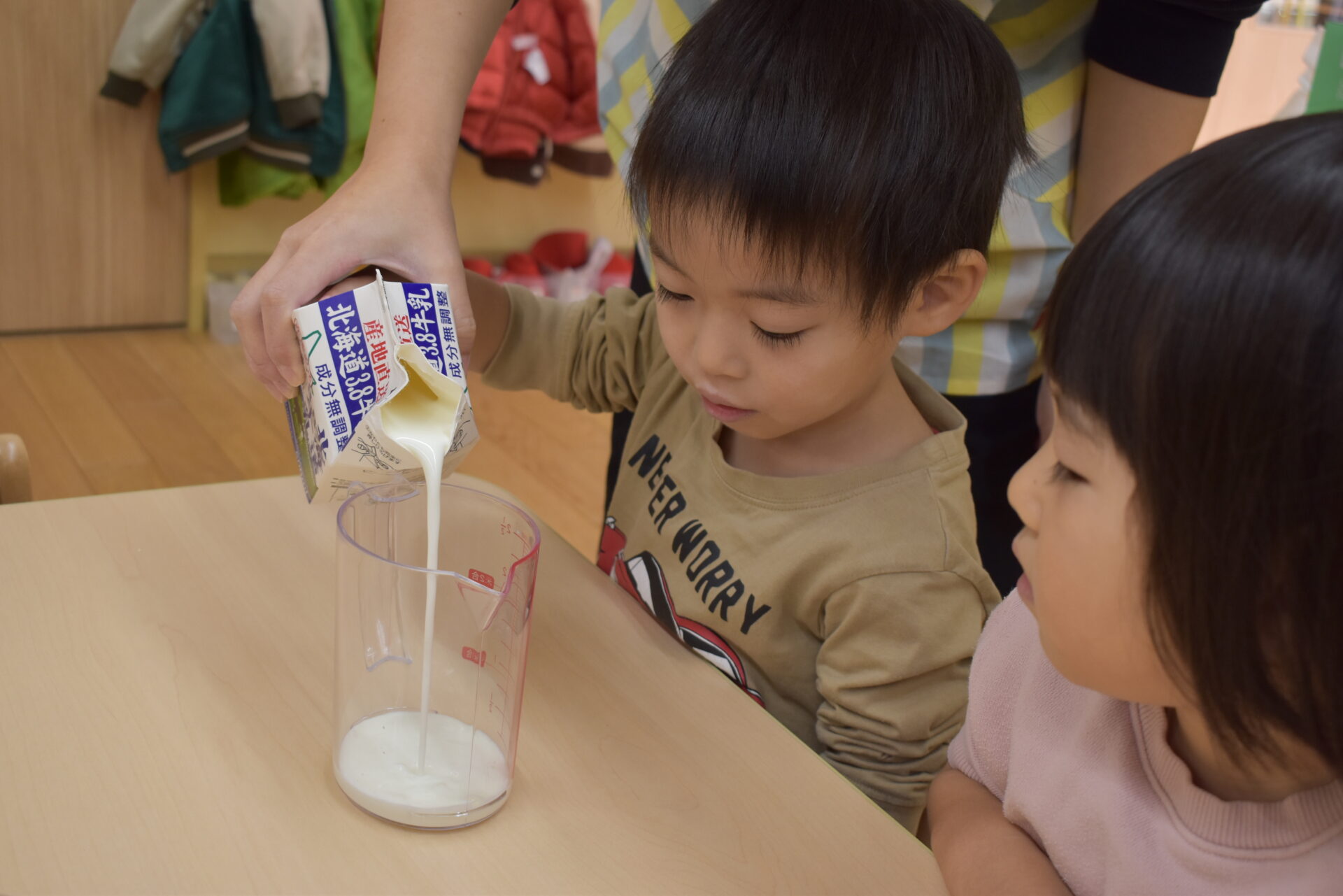 牛乳を計って入れますよ!そーーーーっと。こぼれないように…。