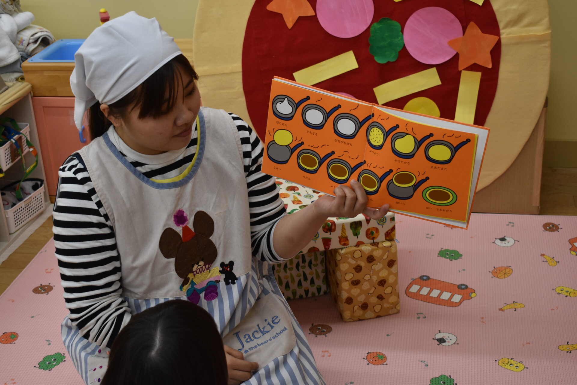 みんなの好きな『しろくまちゃんのホットケーキ』の絵本を見て、どんな風に焼けていくのか予習する子ども達。真剣です!