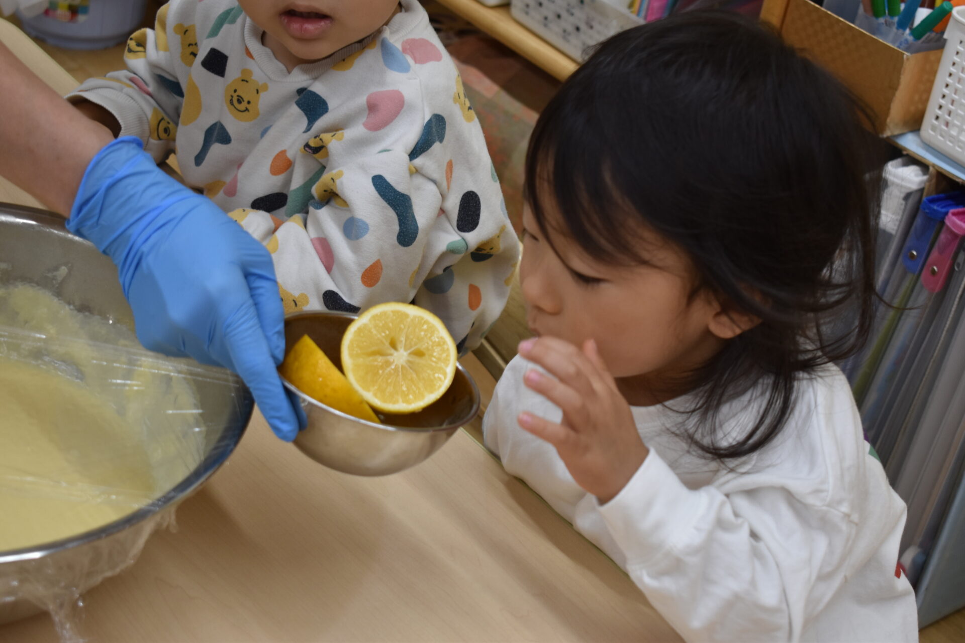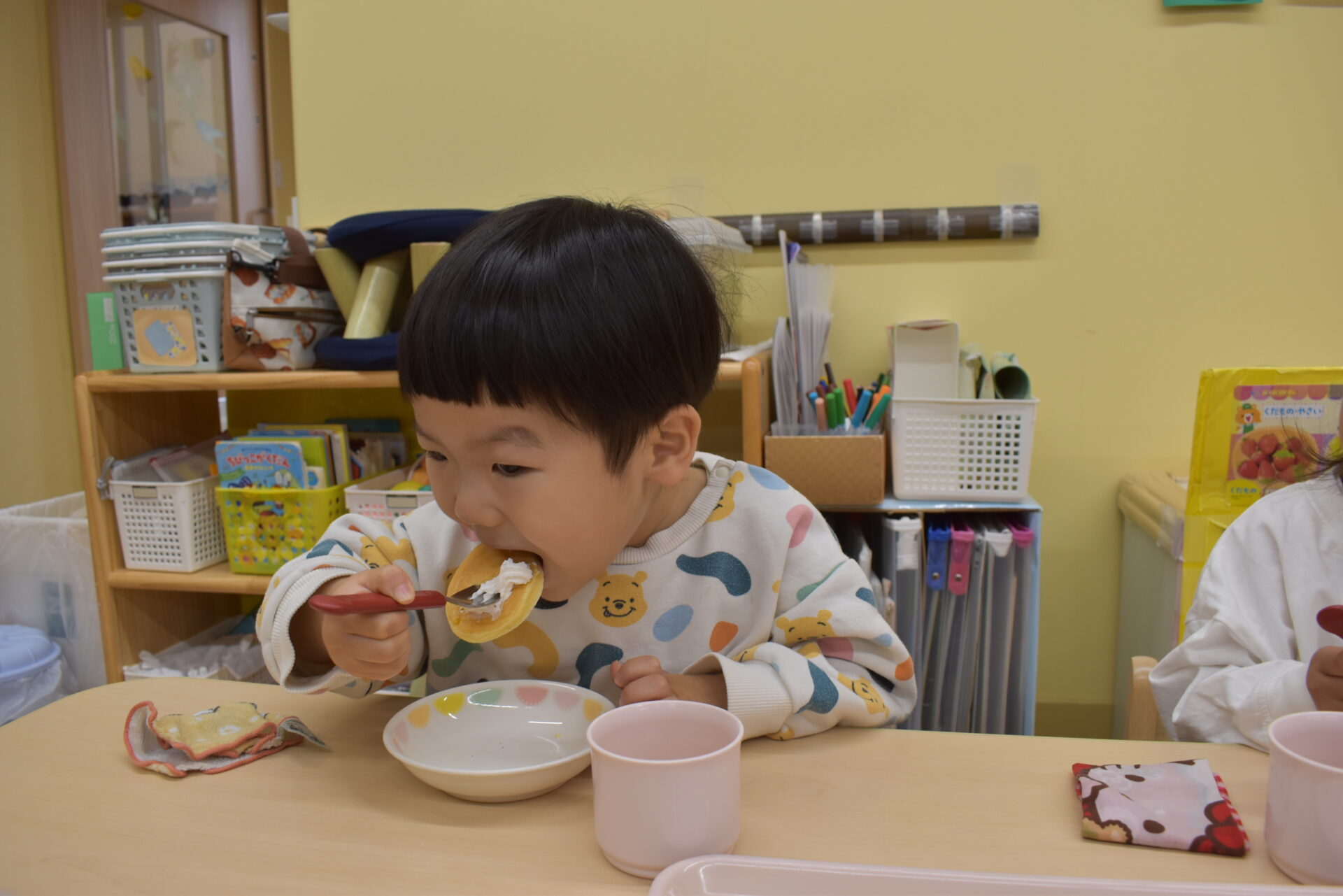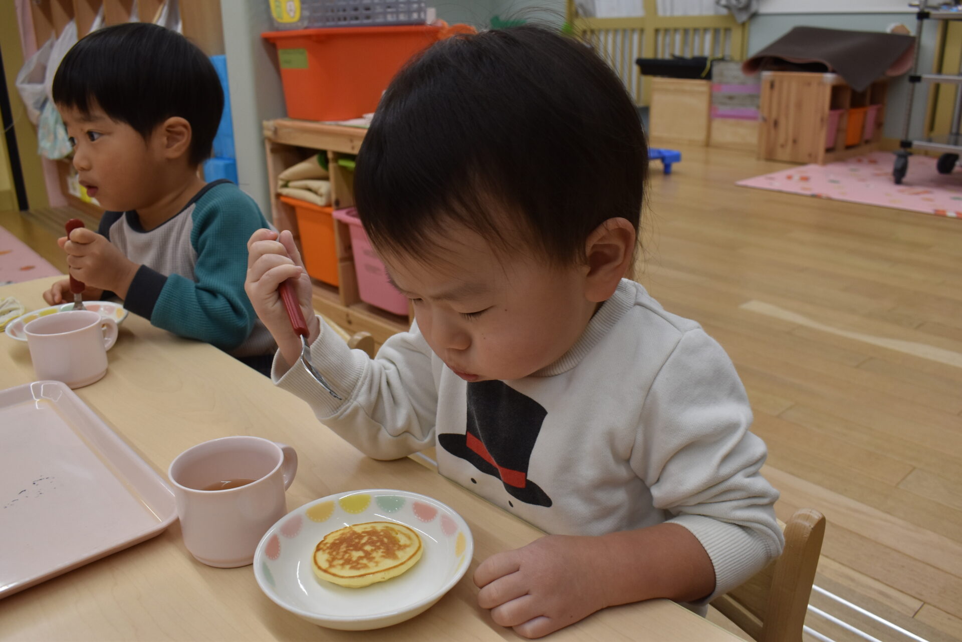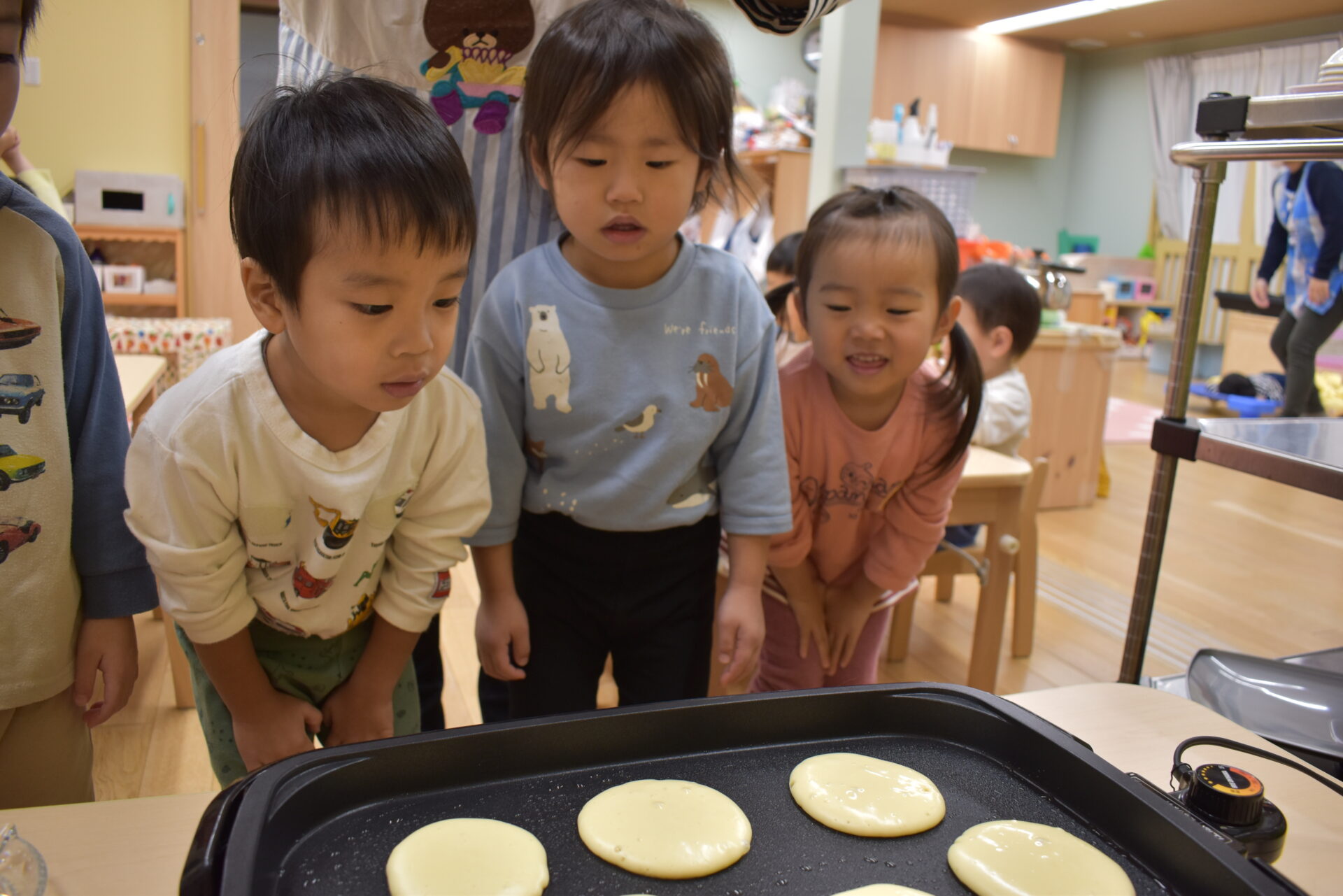 午前中にホットケーキの生地を作った2歳児クラスの子ども達。