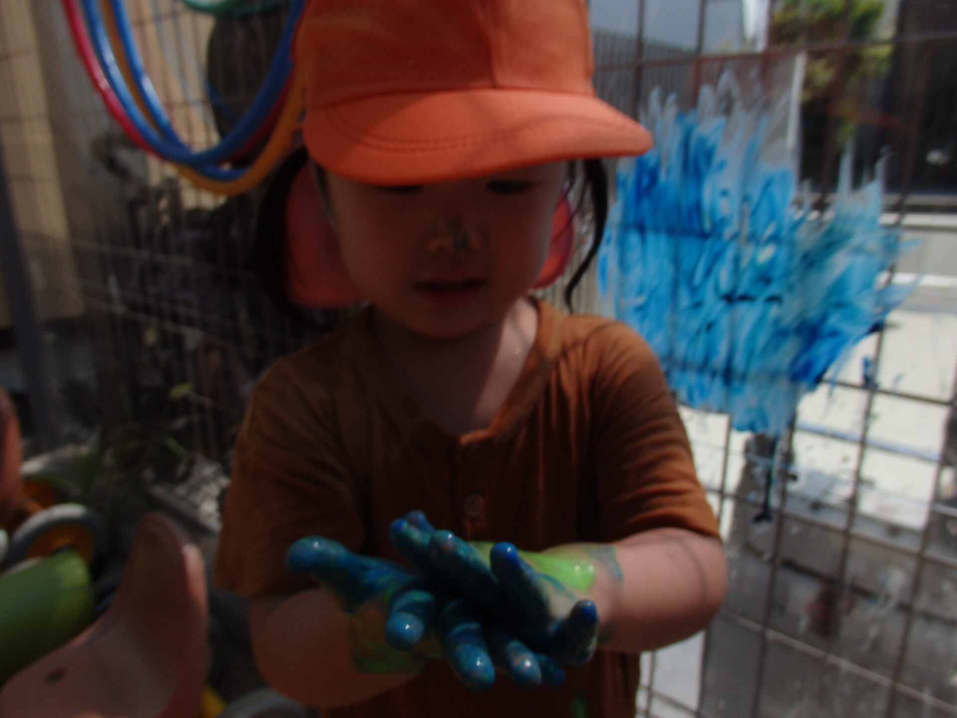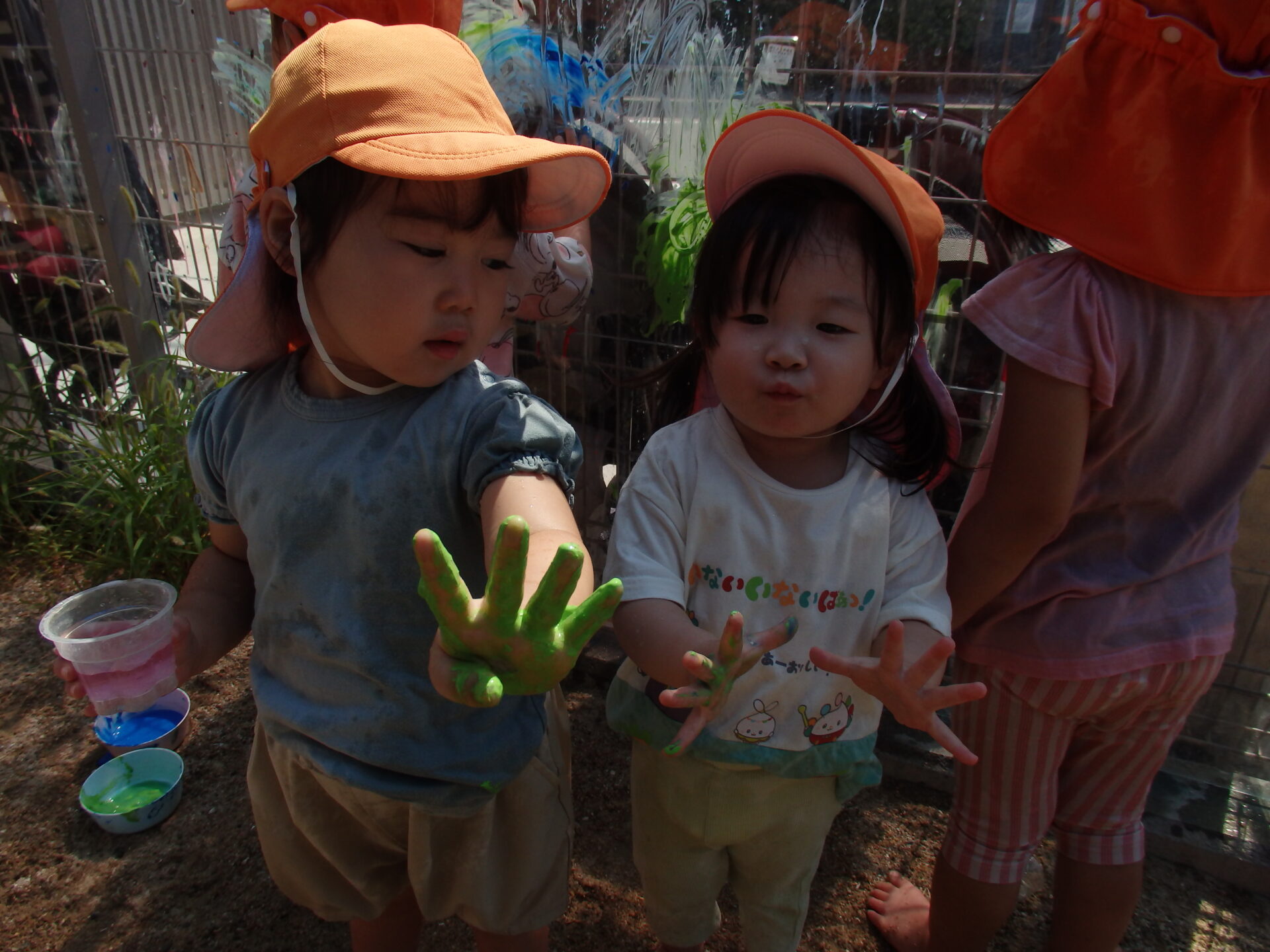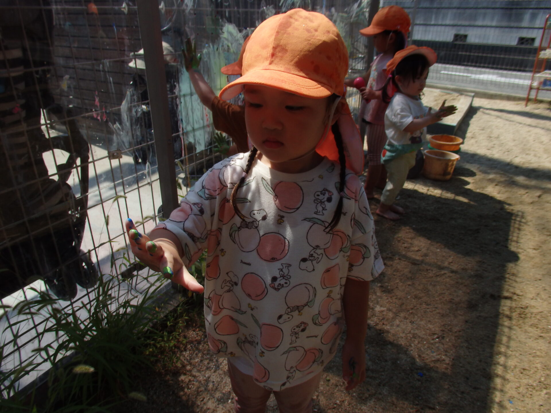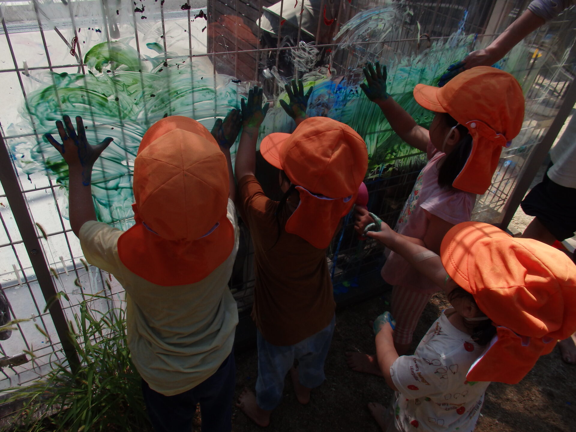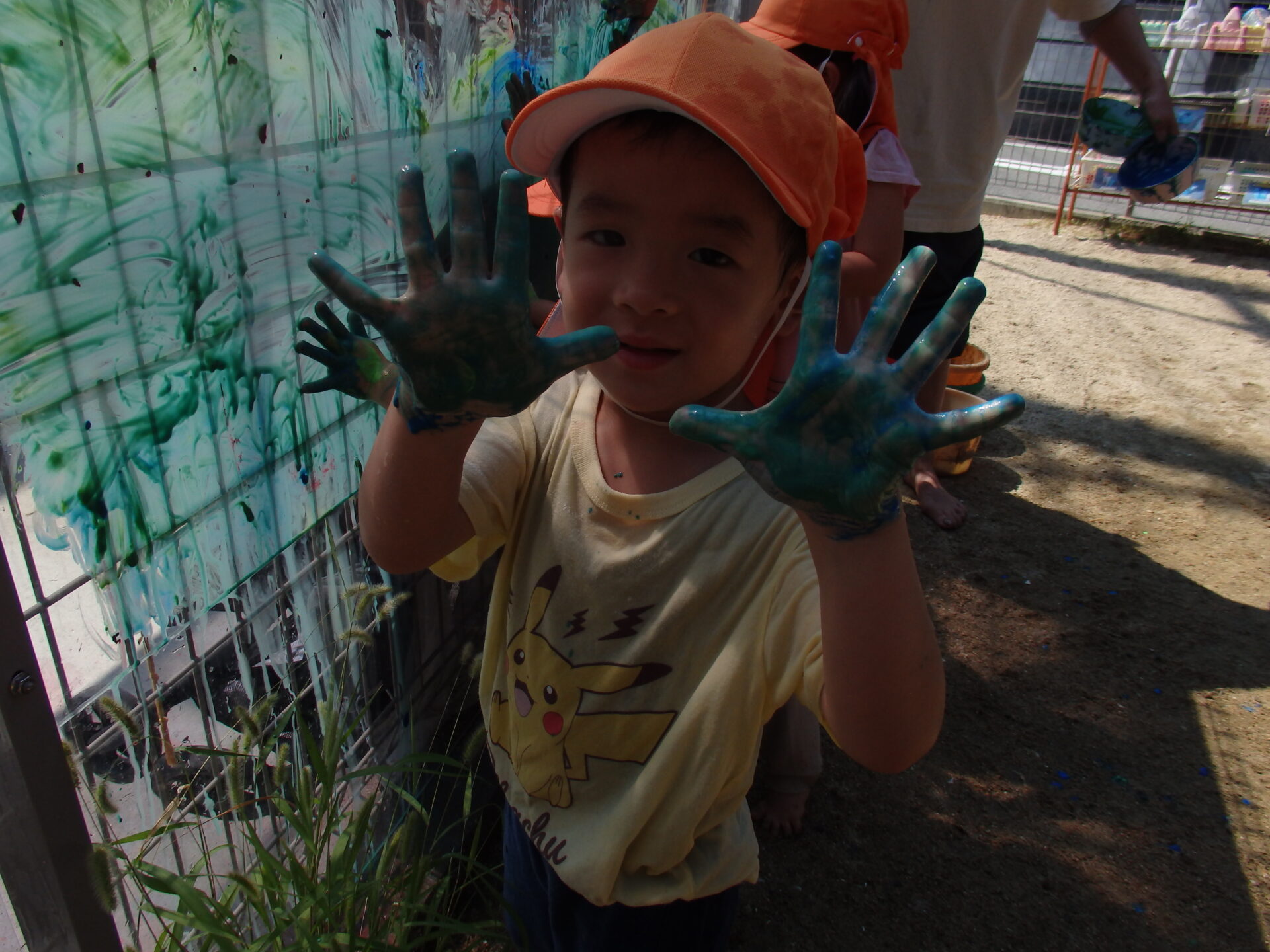 手のひらいっぱいにつけた絵の具を、今度は園庭のアクリル板に付けて色を塗ったり